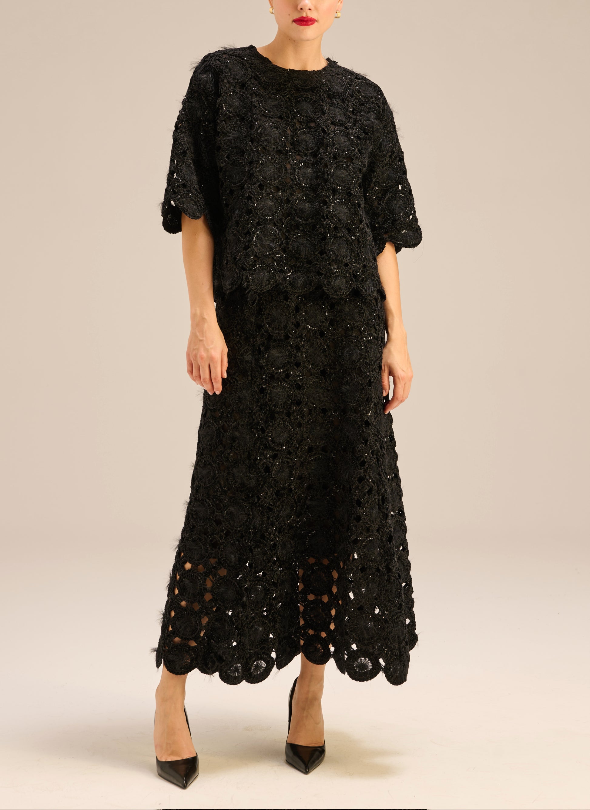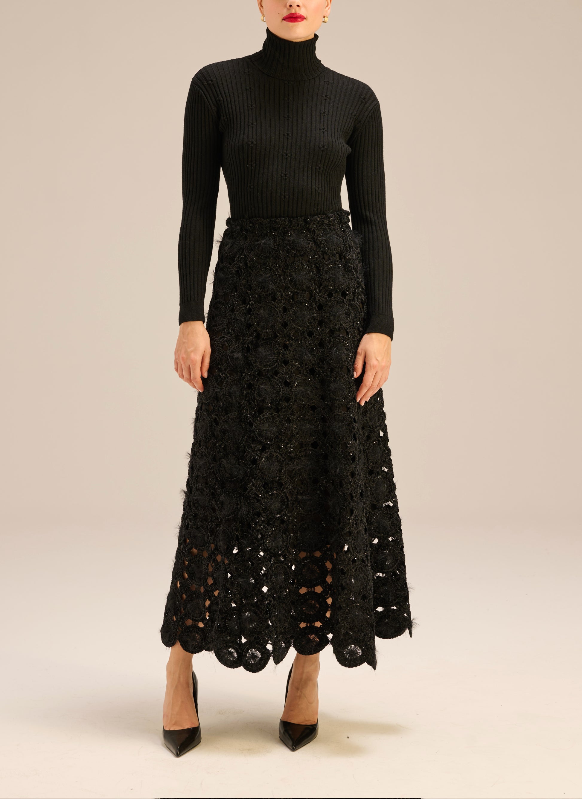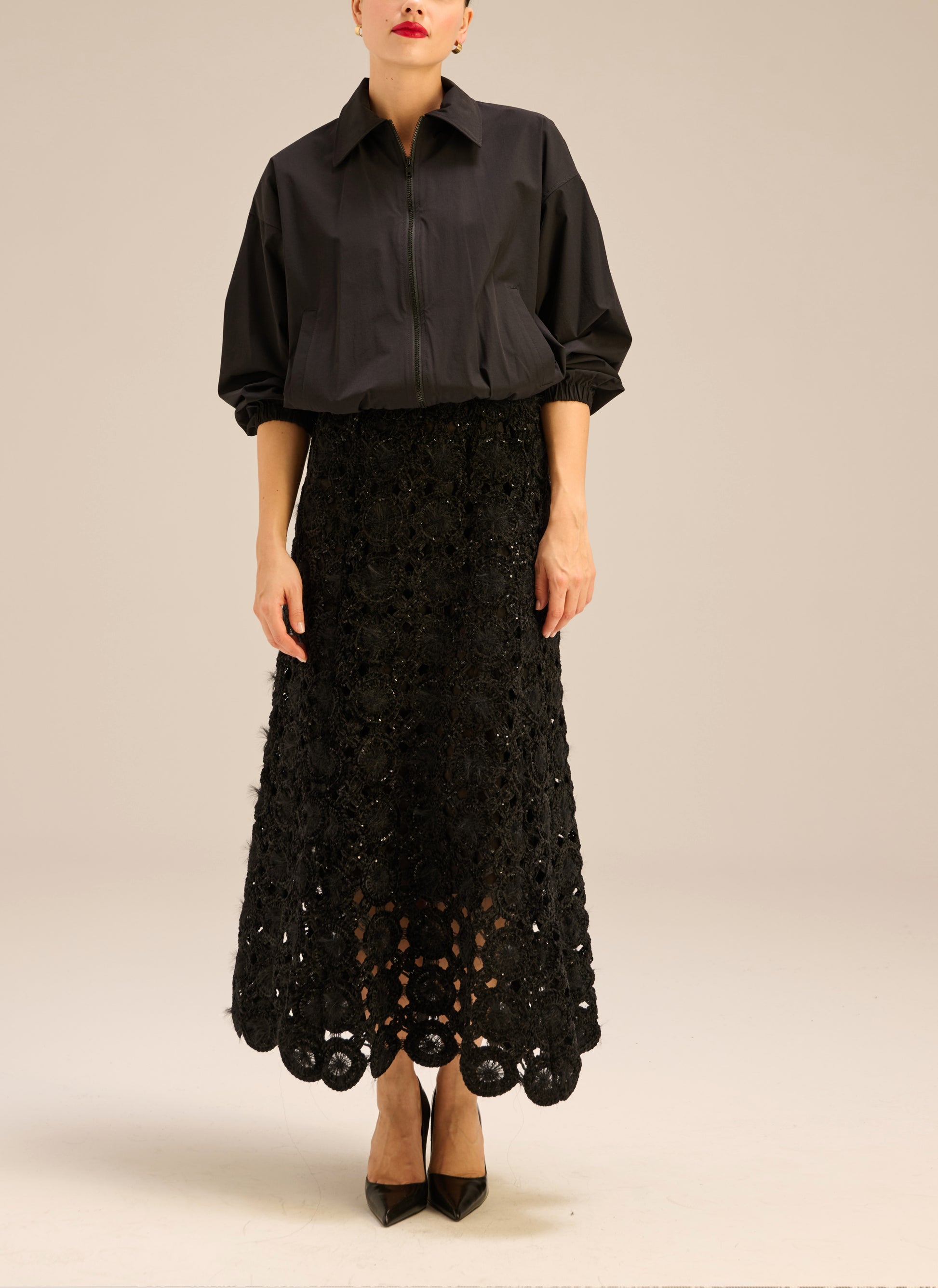 Trapezowa spódnica maxi, wykonana z dekoracyjnego materiału w kolorze czarnym. Może być noszona również jako sukienka.