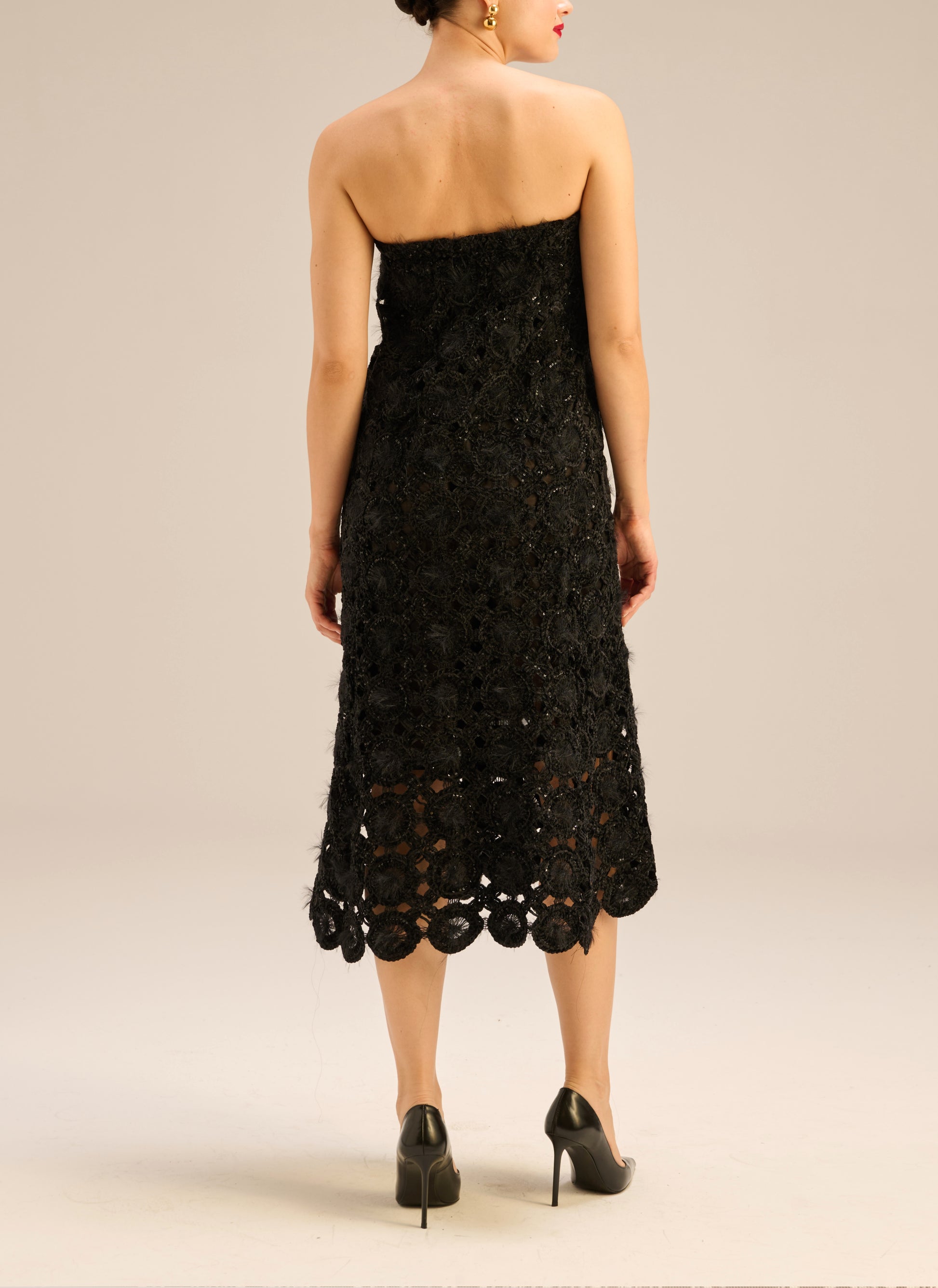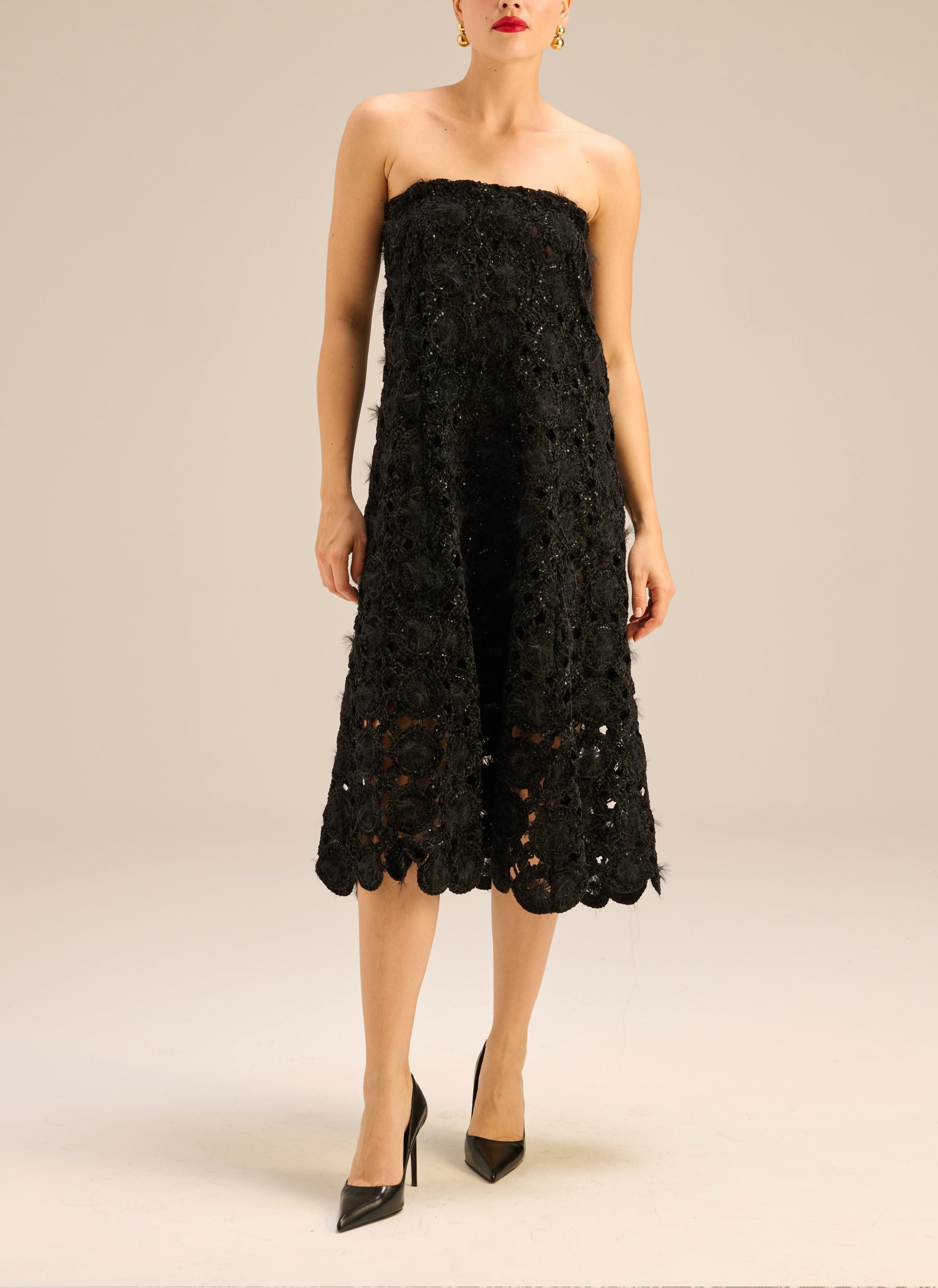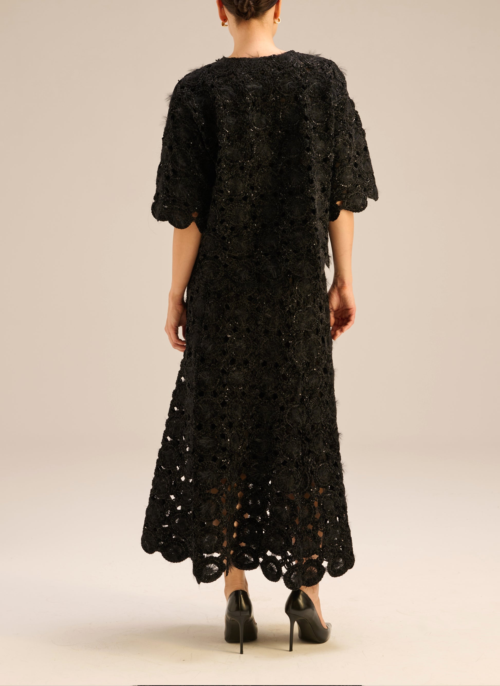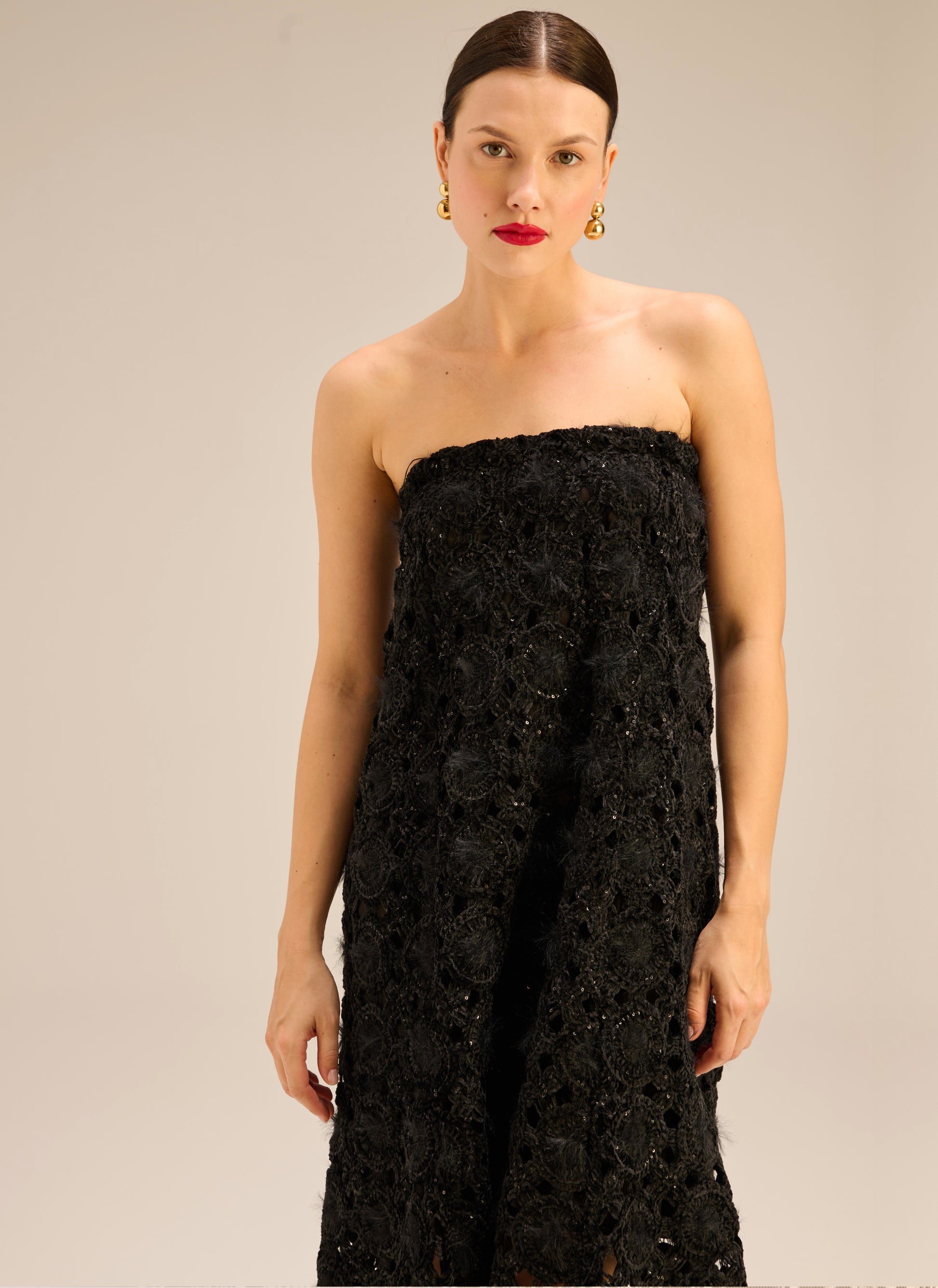 Trapezowa spódnica maxi, wykonana z dekoracyjnego materiału w kolorze czarnym. Może być noszona również jako sukienka.