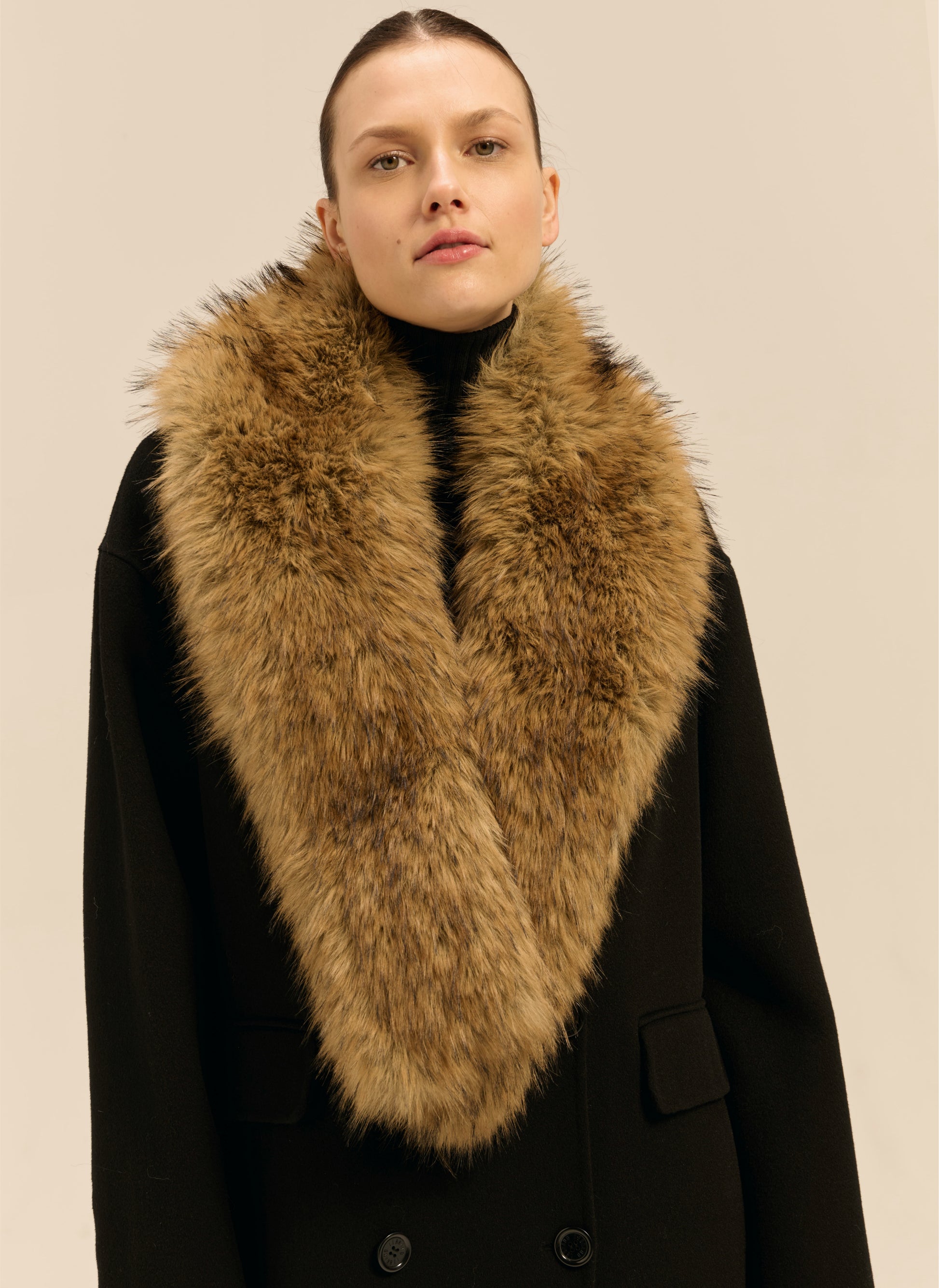 Długi etola wykonany z miękkiego, sztucznego futra w kolorze jasnego brązu.