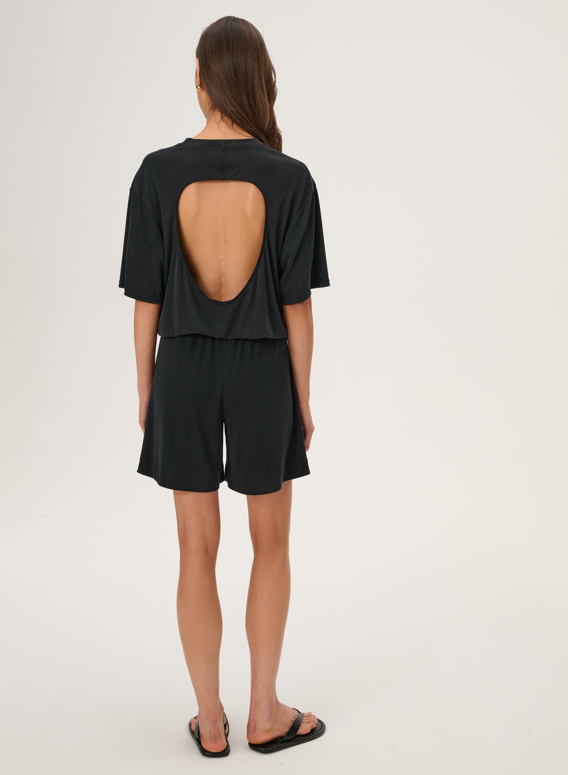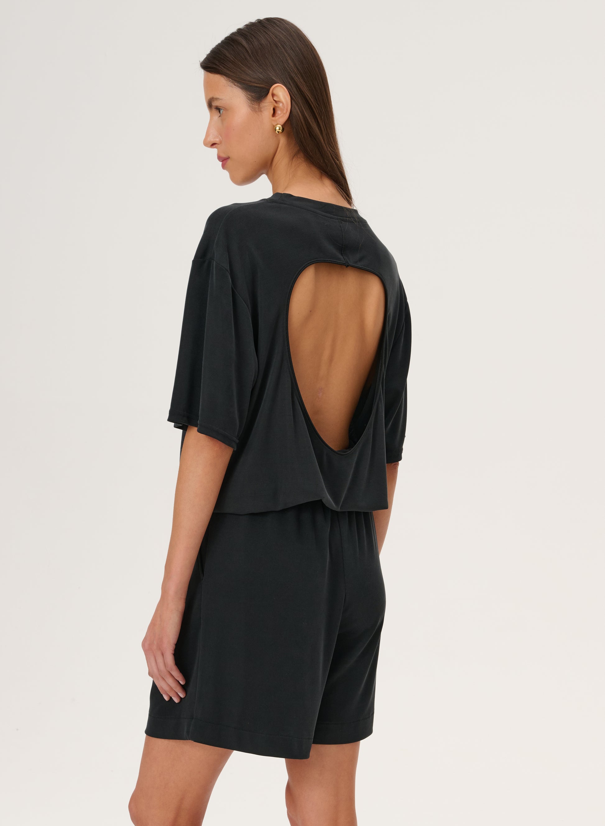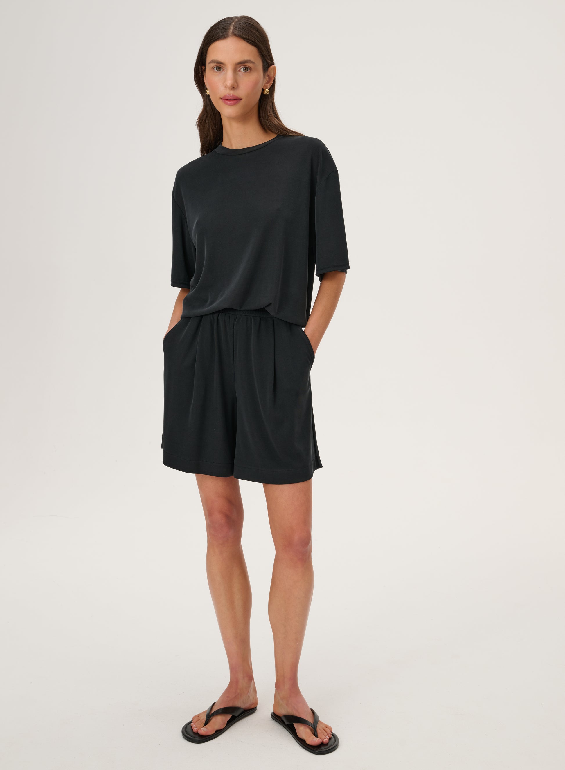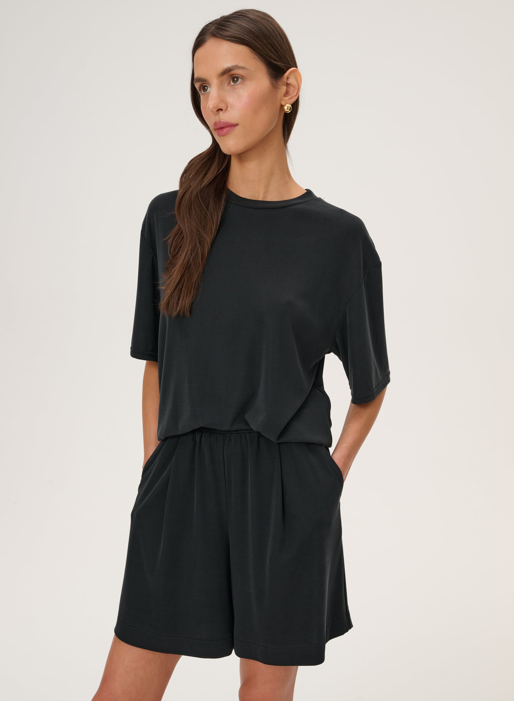 Shorts made of soft, delicate black knit fabric. They feature a regular waist, subtle pleats, and an elastic waistband.