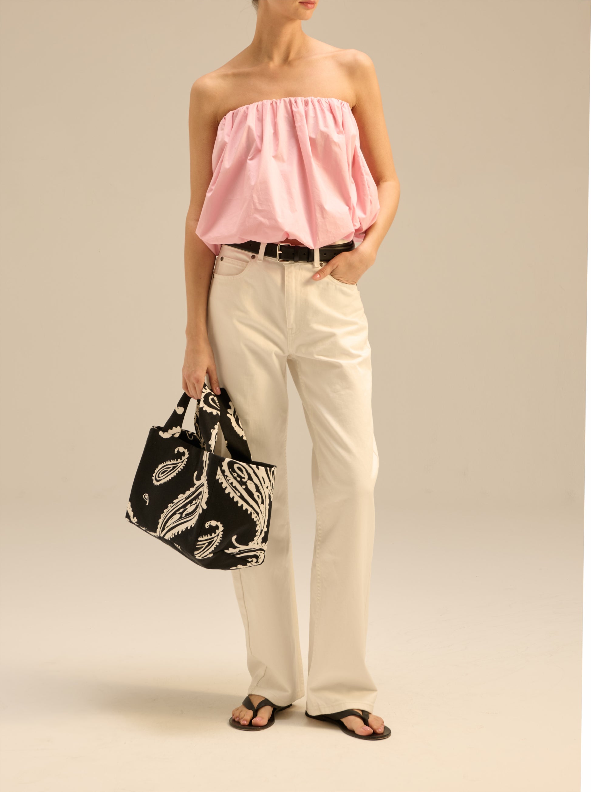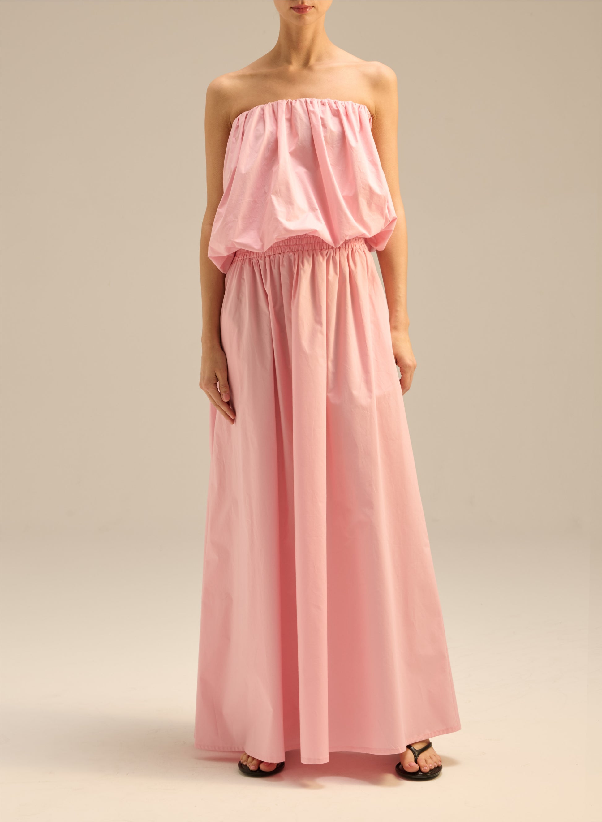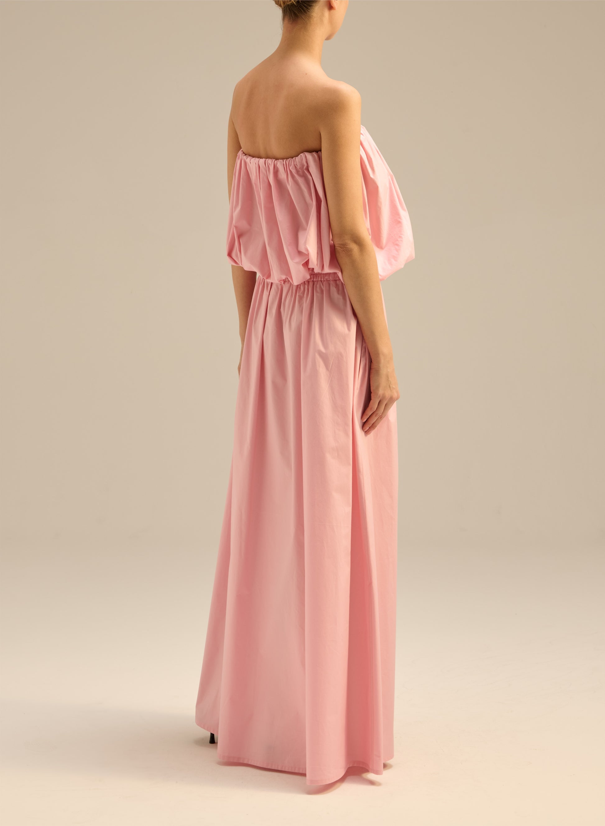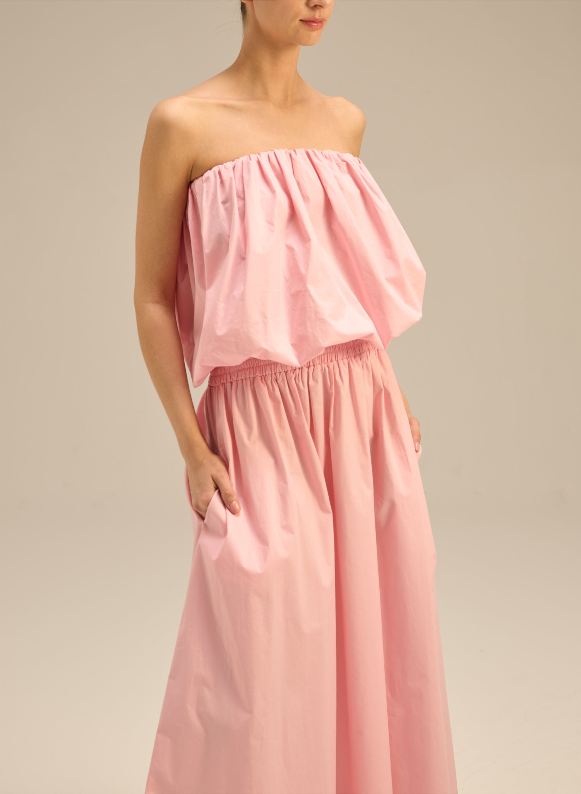 Lightweight, strapless, bubble-shaped top made of pink cotton. Top and bottom finished with elastic.