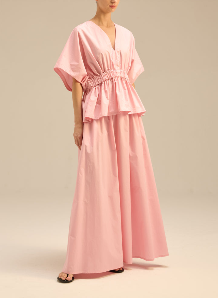 Loose, oversized shirt made of light white cotton. It features an elasticated waist, short sleeves, and a V-neckline.