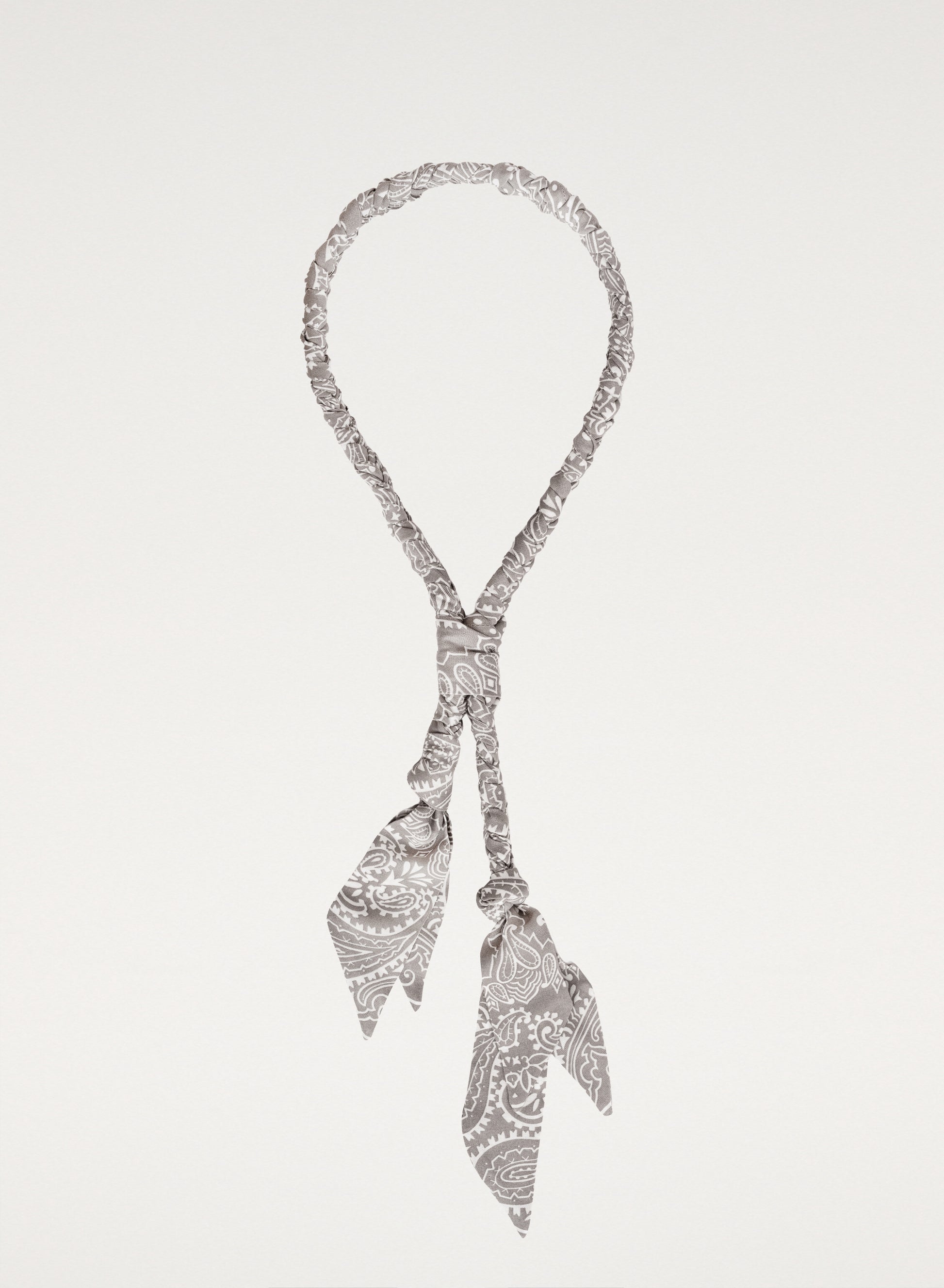 This necklace is made of delicate fabric with a distinctive gray bandana pattern. It features a drawstring for adjustable length.