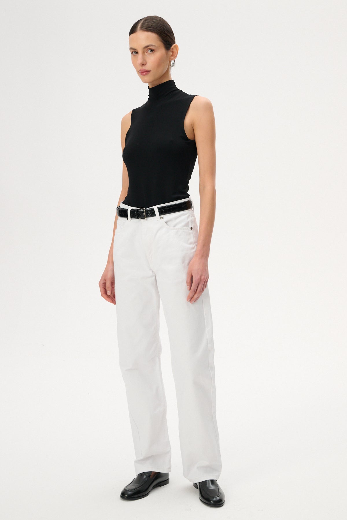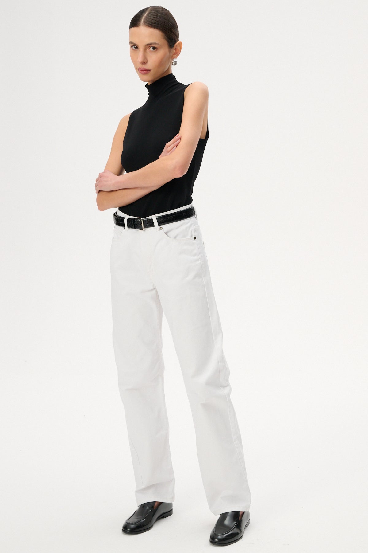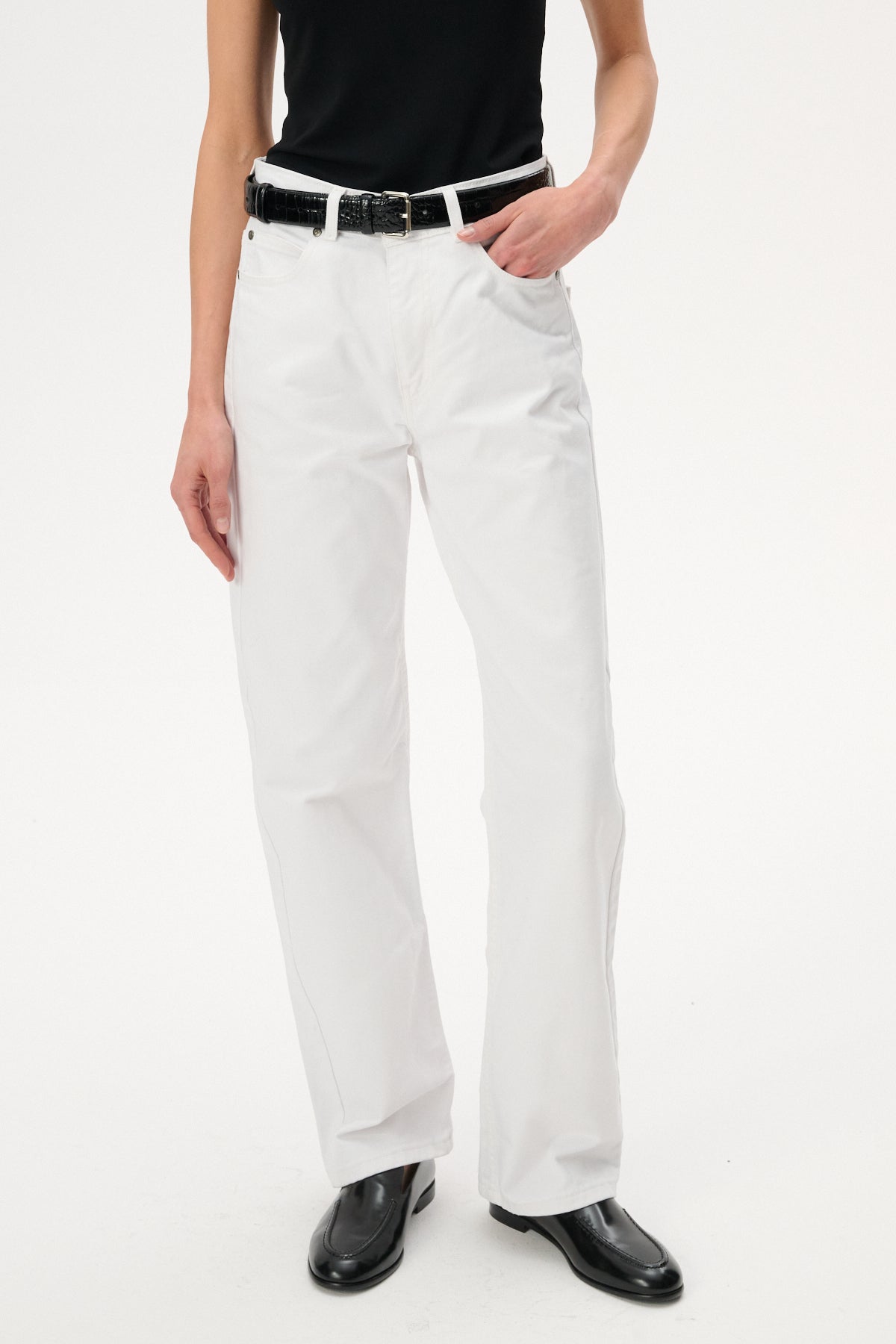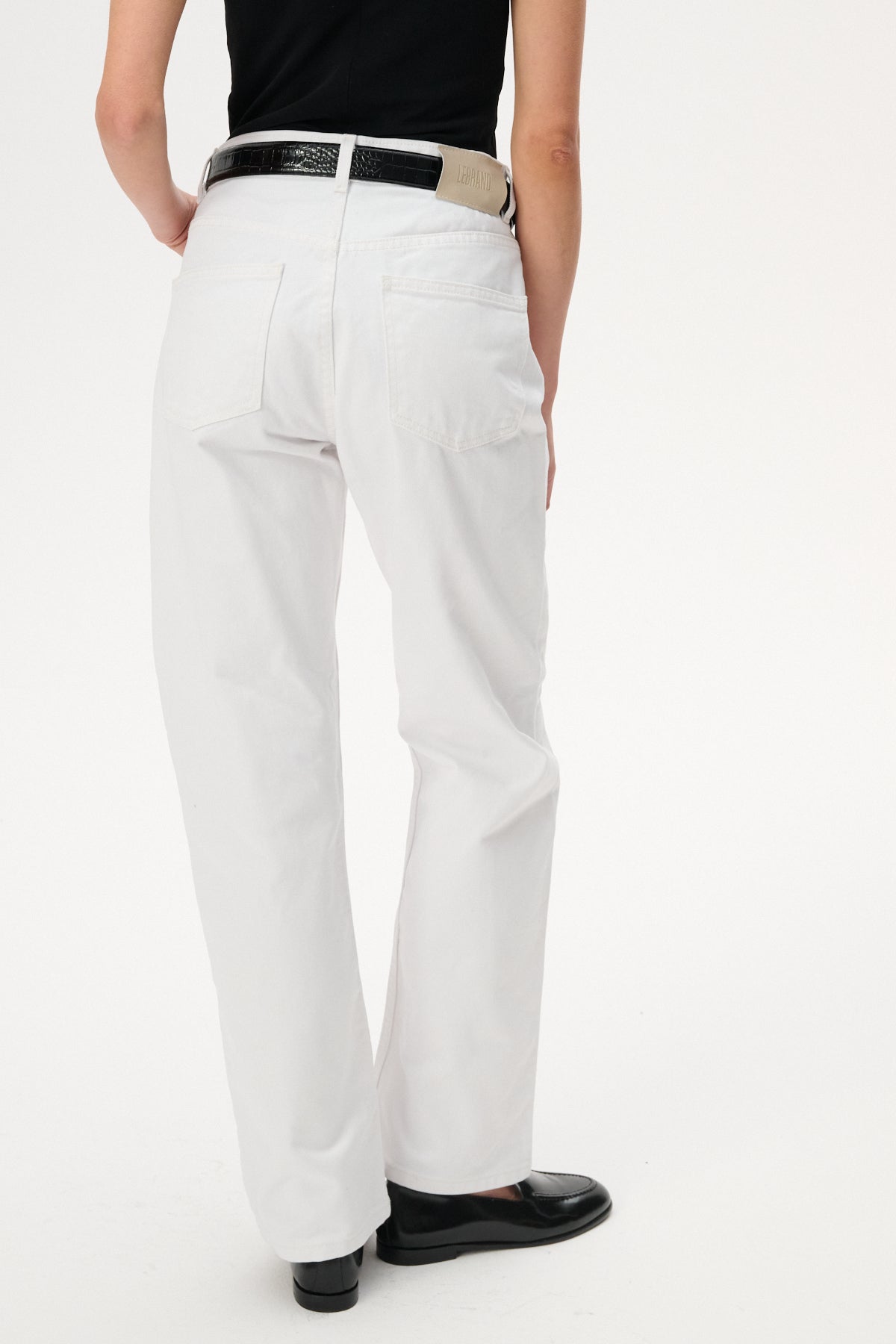 Jeansy o luźnym fasonie z wysokim stanem i szeroką nogawką o długości sięgającej za kostki. Wykonane w 100% z nieelastycznej bawełny w kolorze ecru. Posiadają zapięcie na guzik i suwak, skórzaną naszywkę z wytłoczonym logo z tyłu oraz pięć kieszeni.
