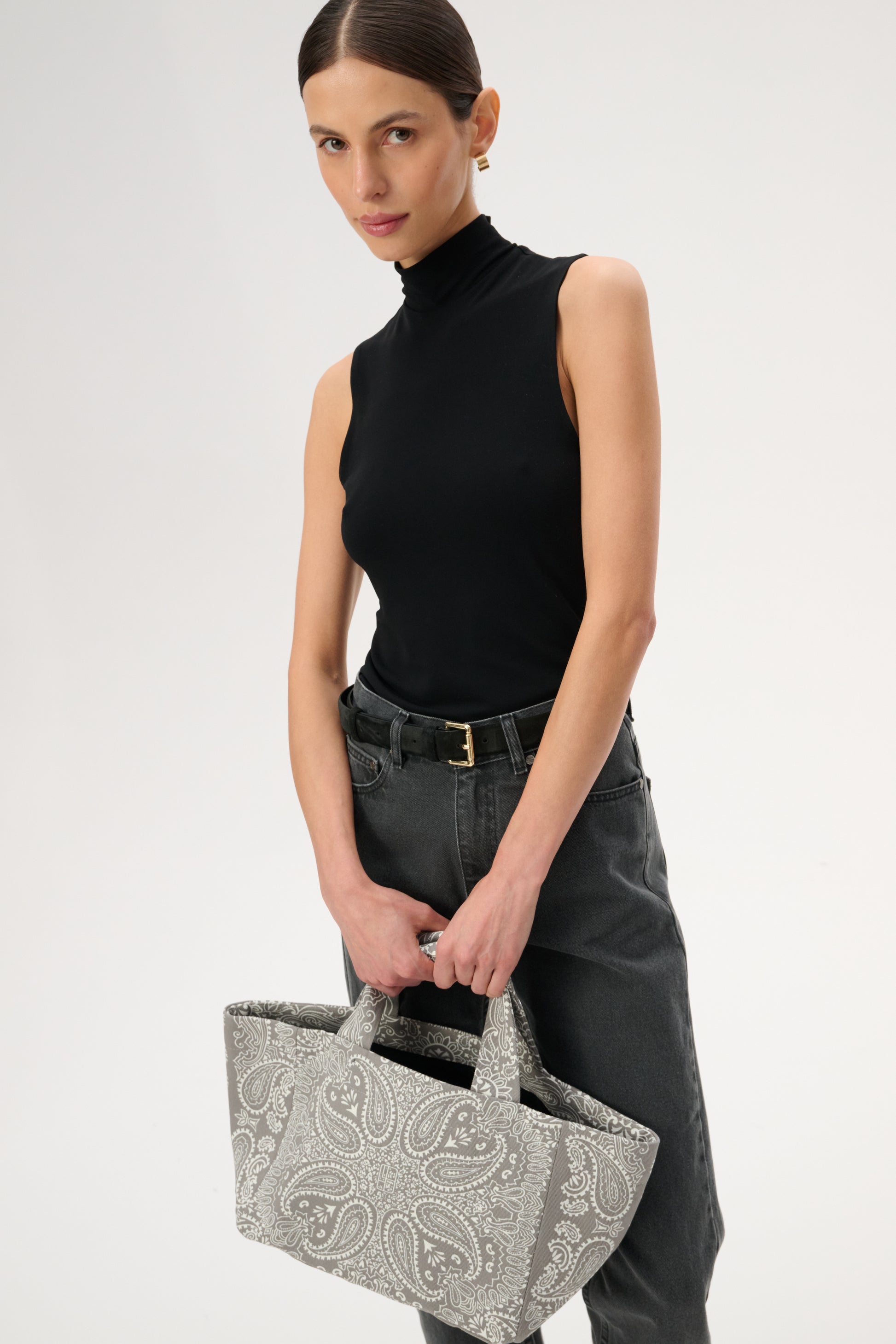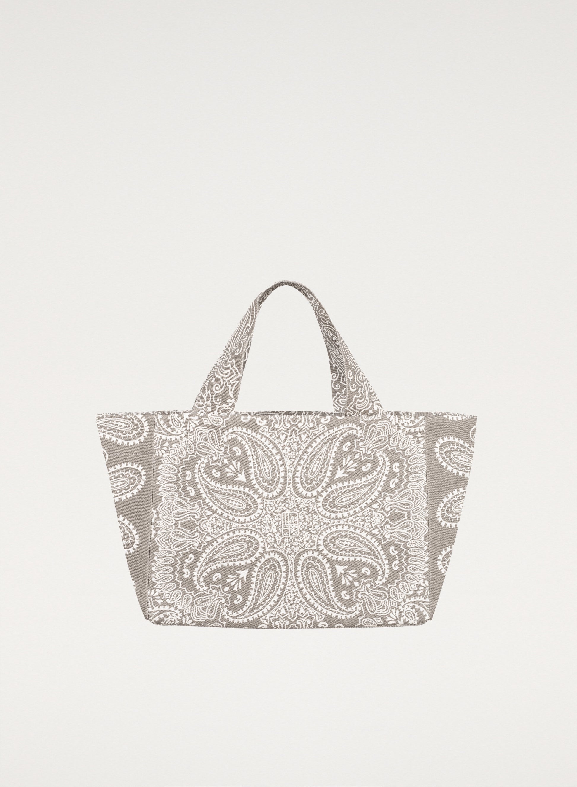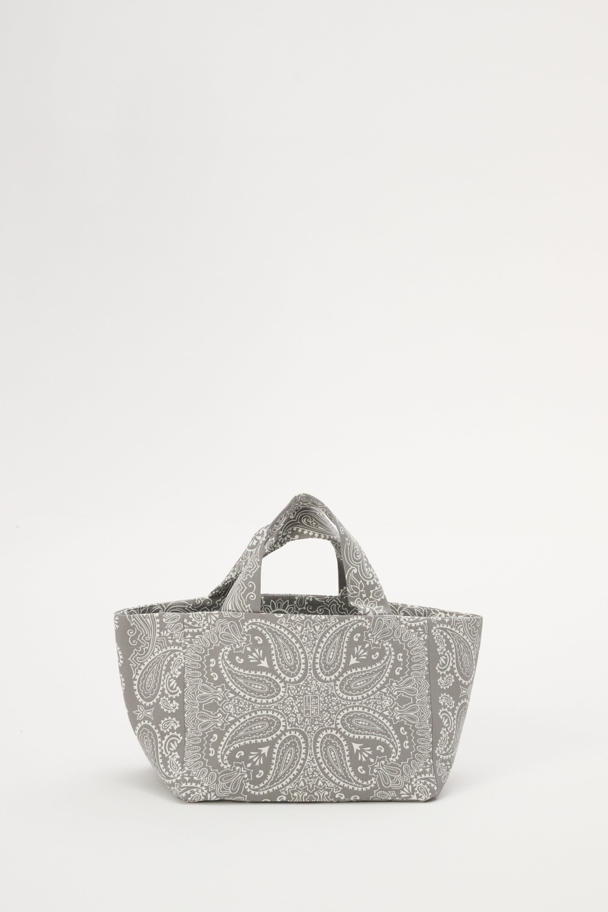 This small mini shopper bag is made of thick cotton canvas with a gray and ecru bandana print. It has no closure and one interior pocket.