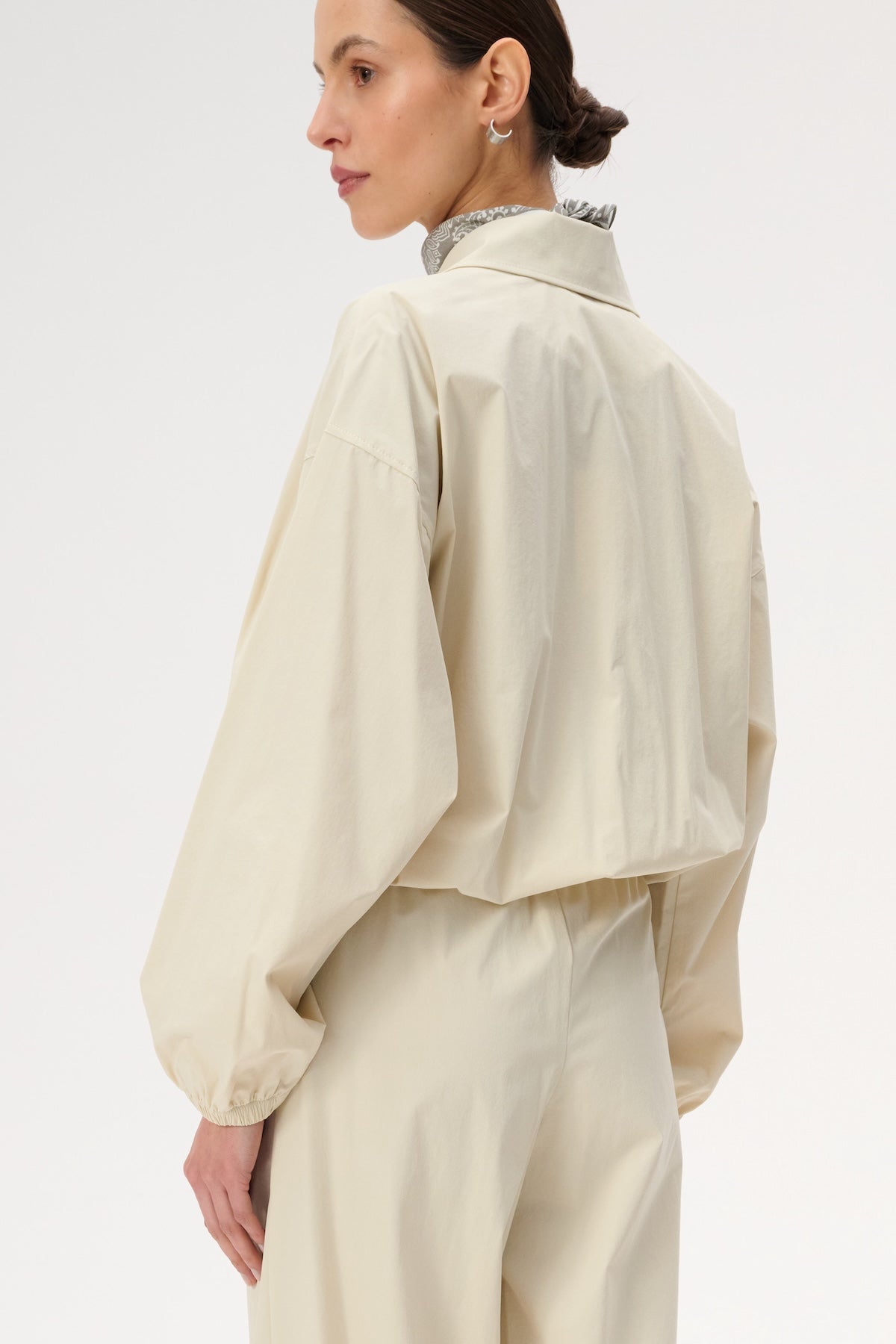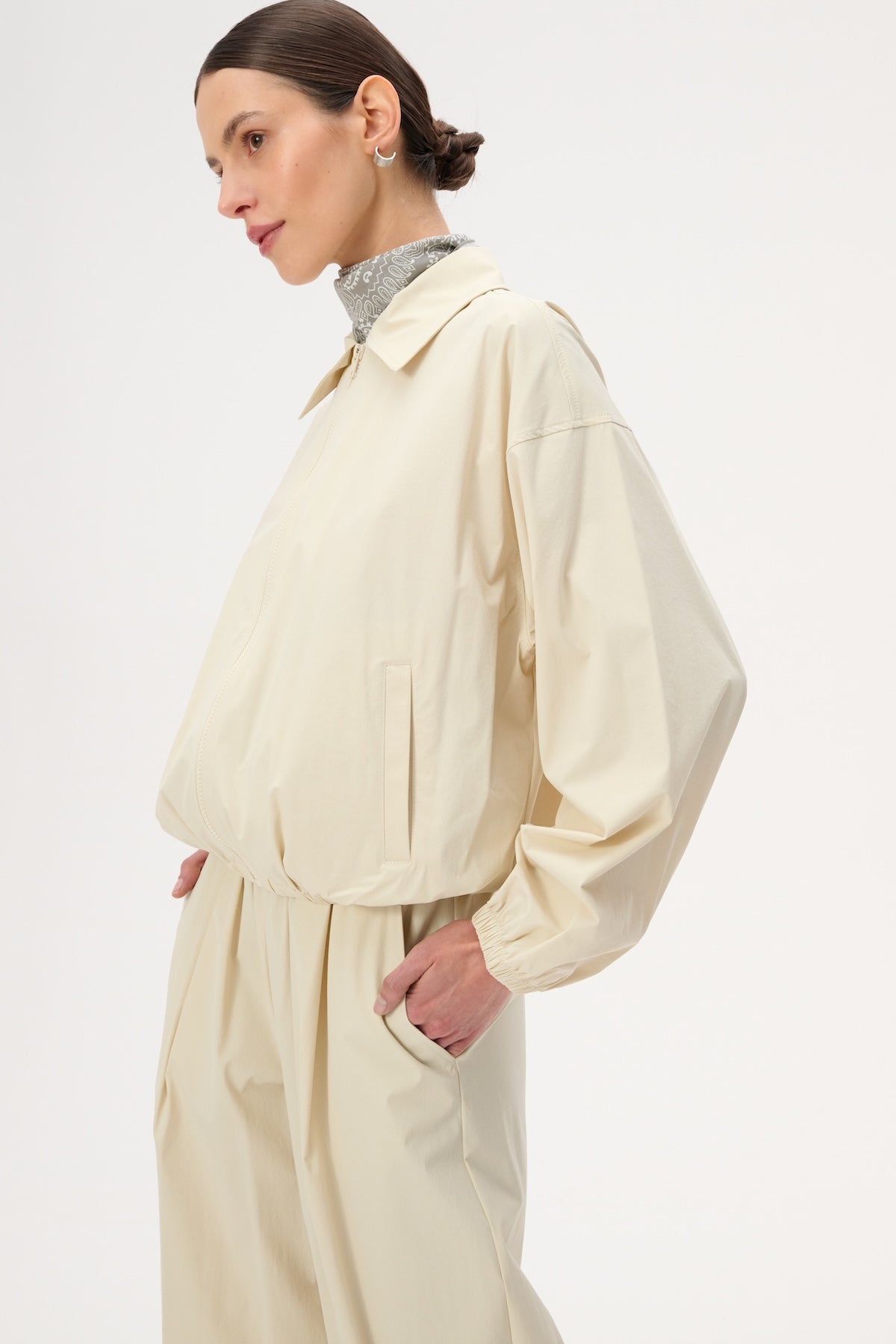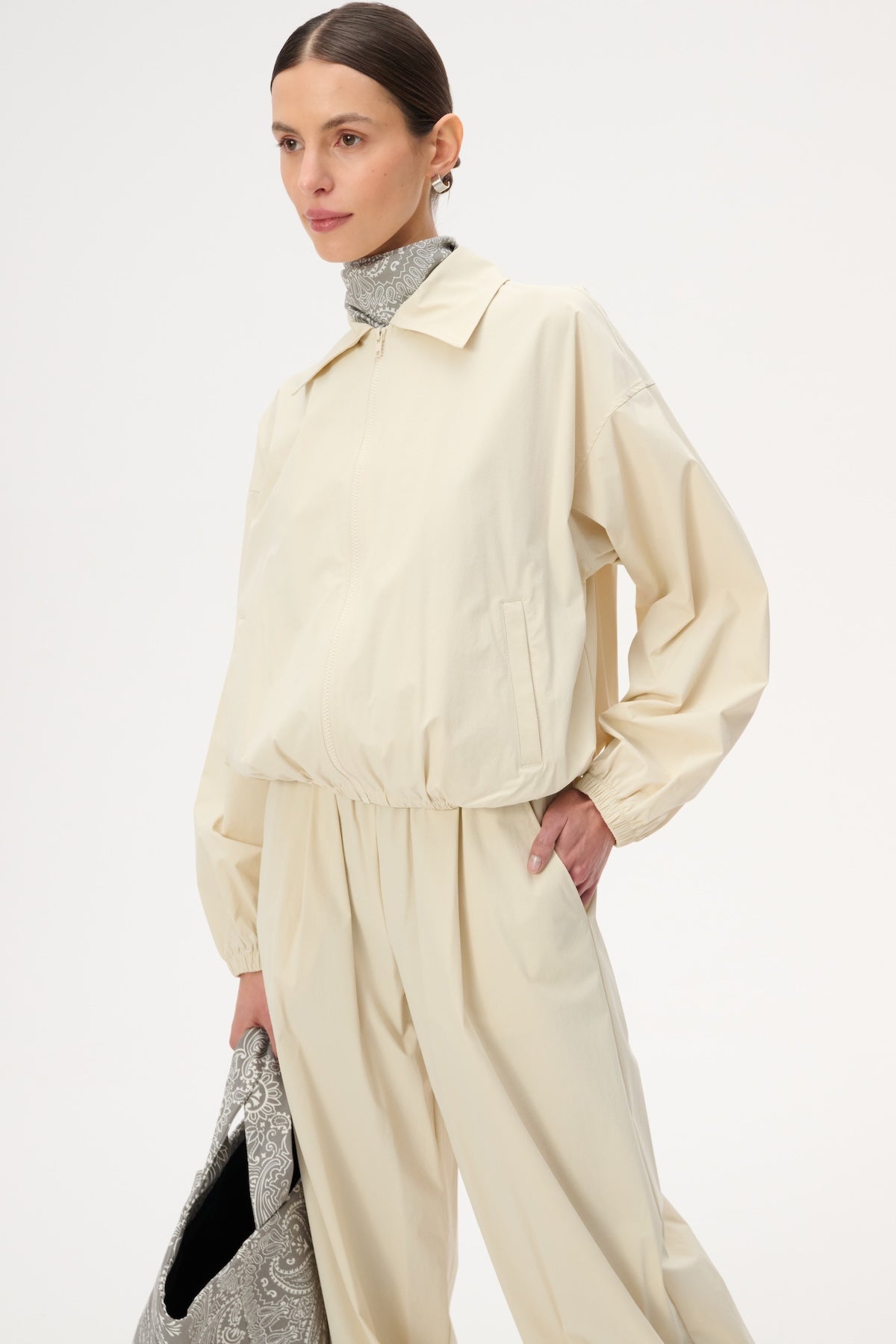 This loose-fitting nylon jacket is made of lightweight ecru fabric. It features an elasticated hem and cuffs, two side pockets, and a zipper closure.