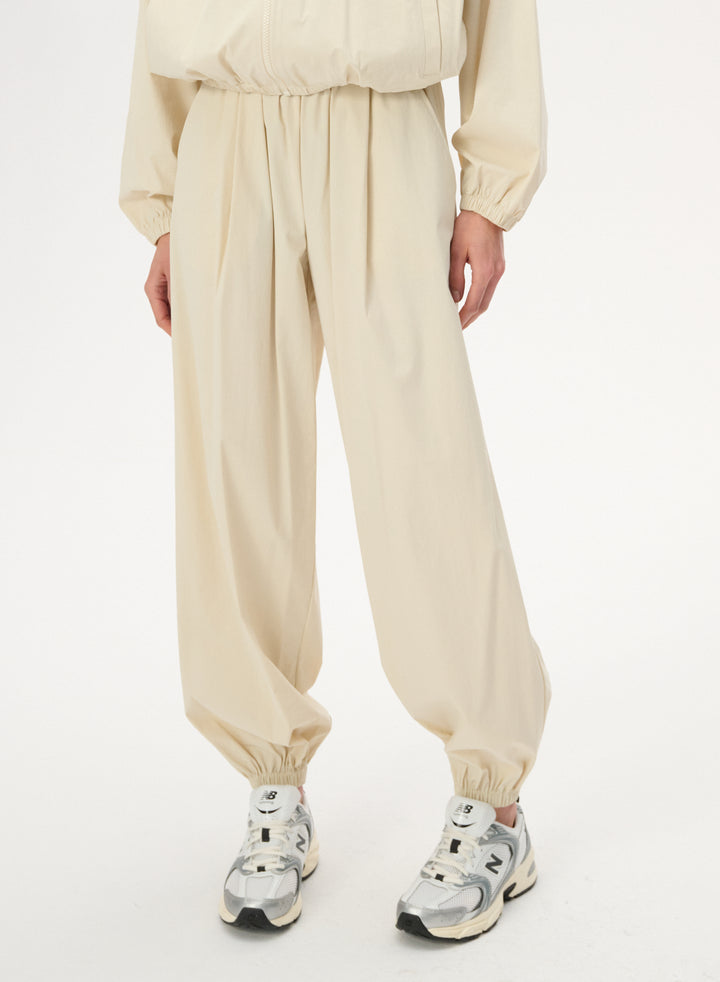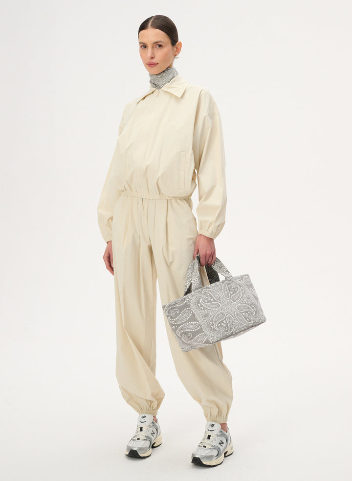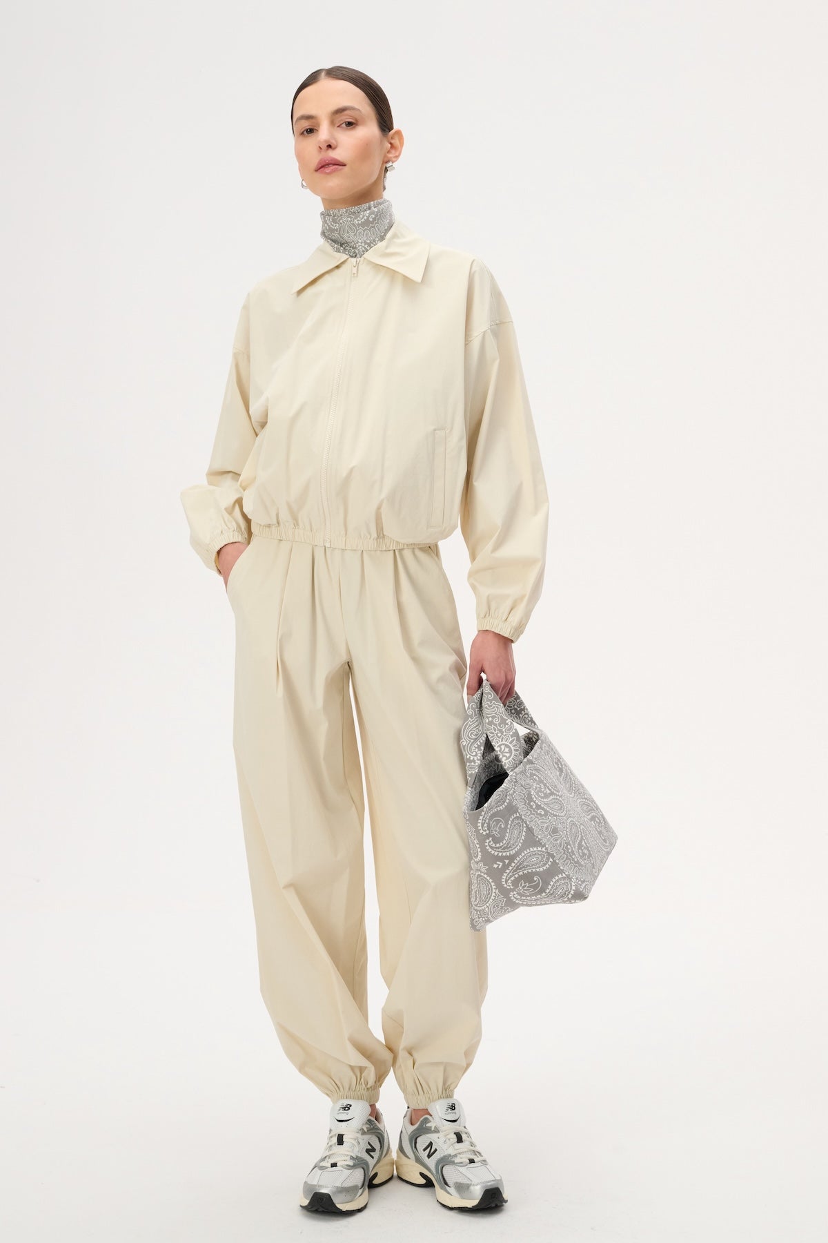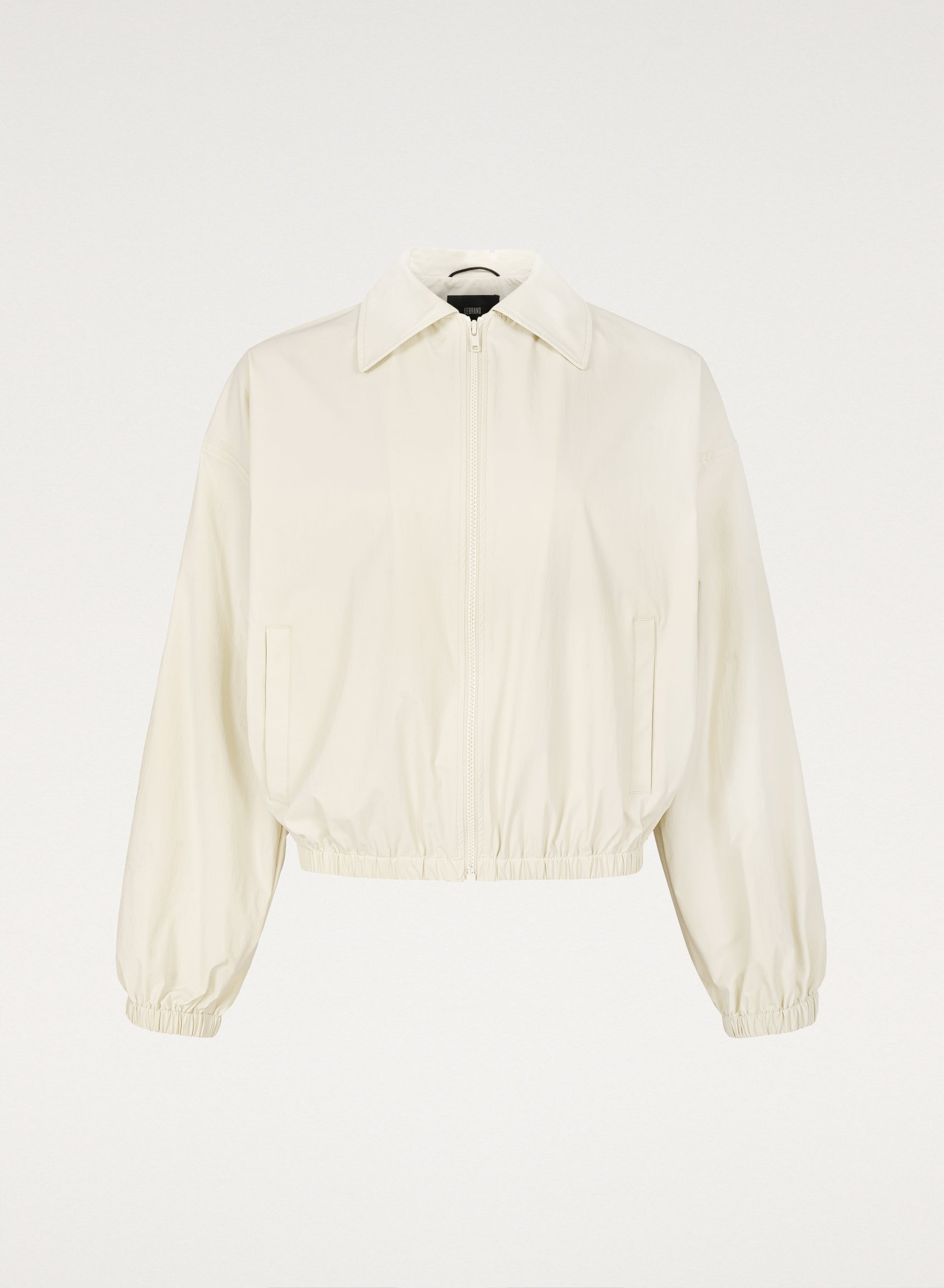 This loose-fitting nylon jacket is made of lightweight ecru fabric. It features an elasticated hem and cuffs, two side pockets, and a zipper closure.