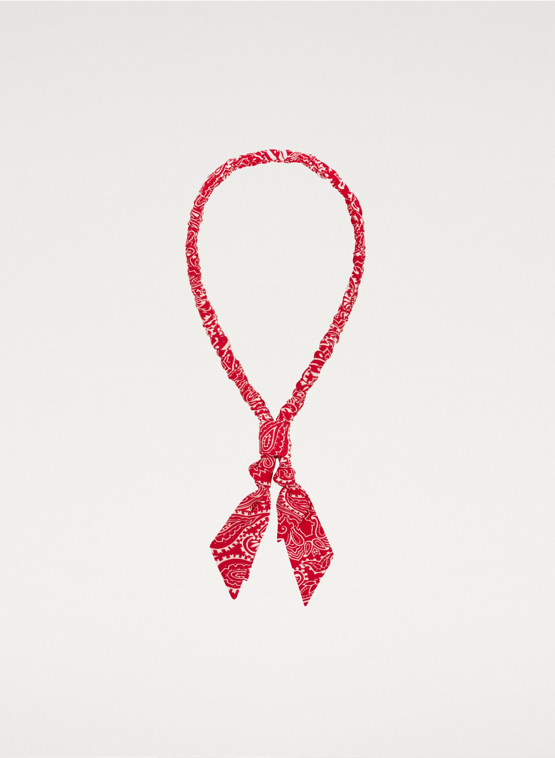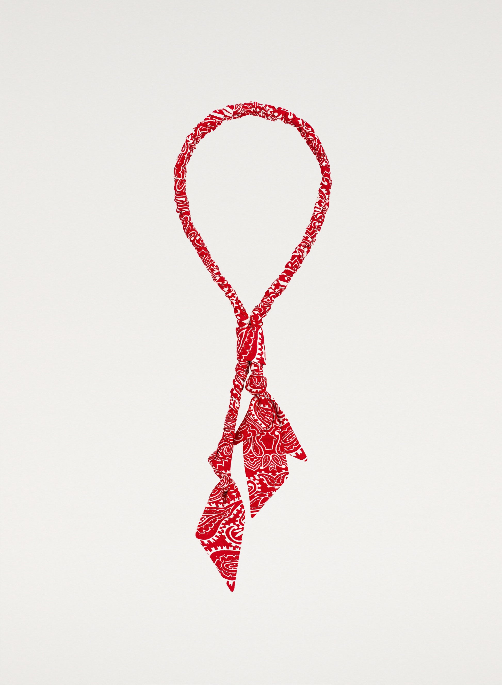 This necklace is made of delicate fabric with a distinctive red bandana pattern. It features a drawstring for adjustable length.