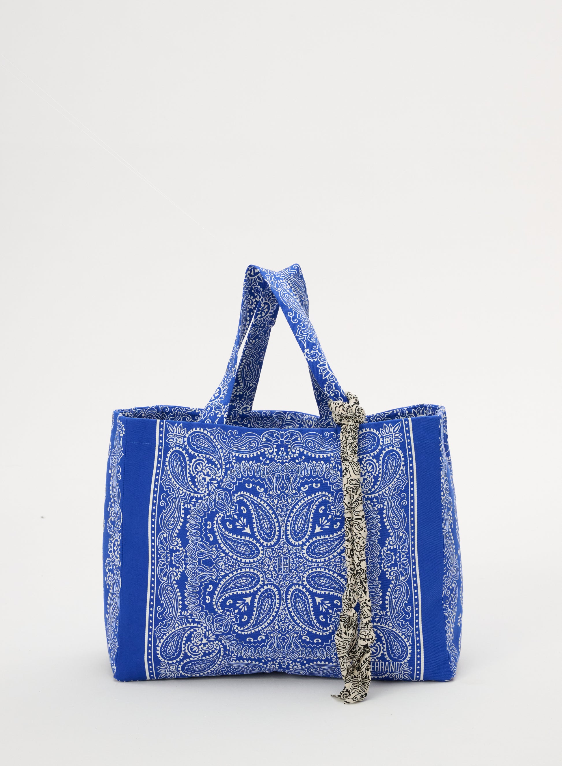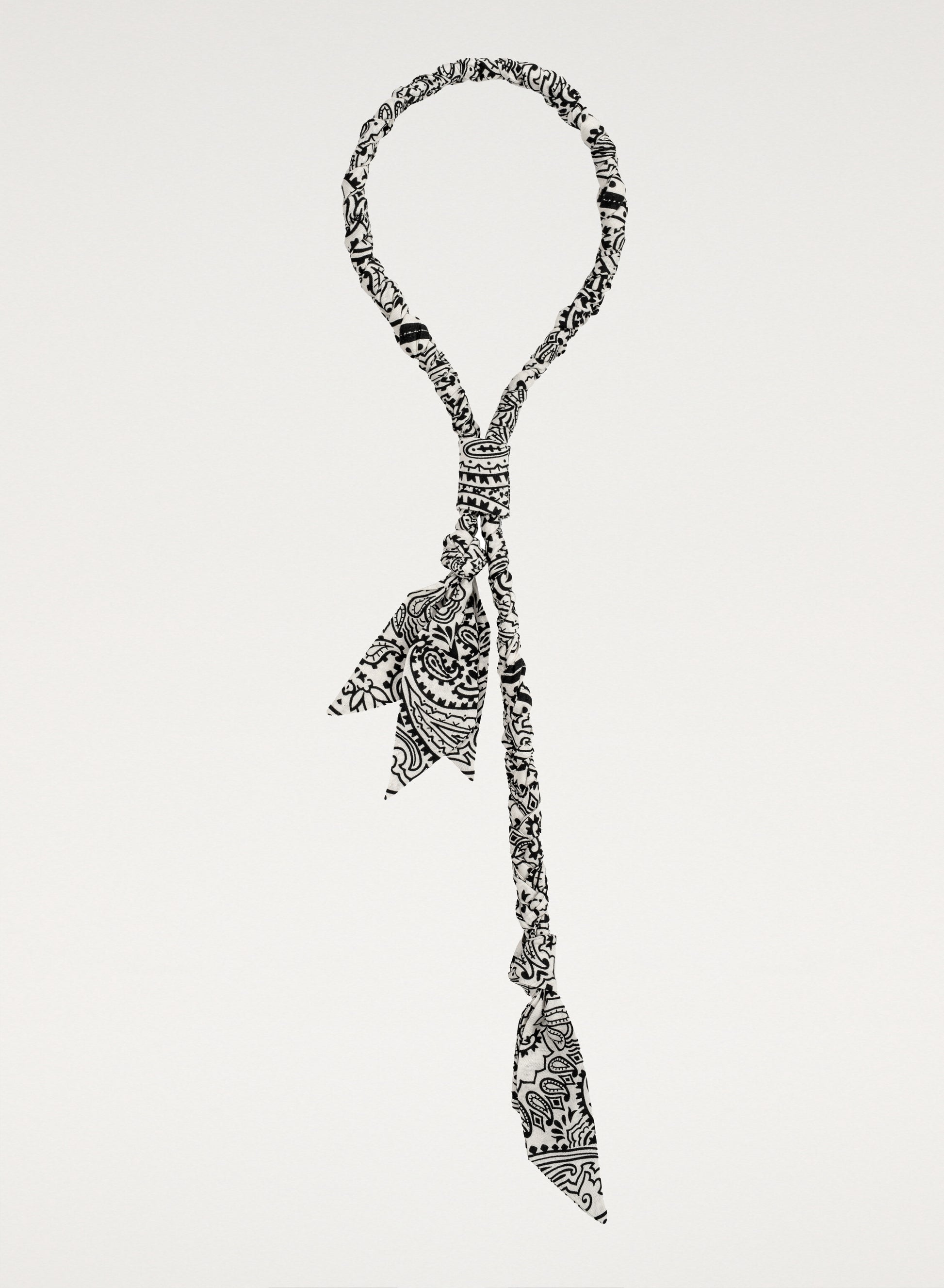 This necklace is made of delicate fabric with a distinctive ecru bandana pattern. It features a drawstring for adjustable length.