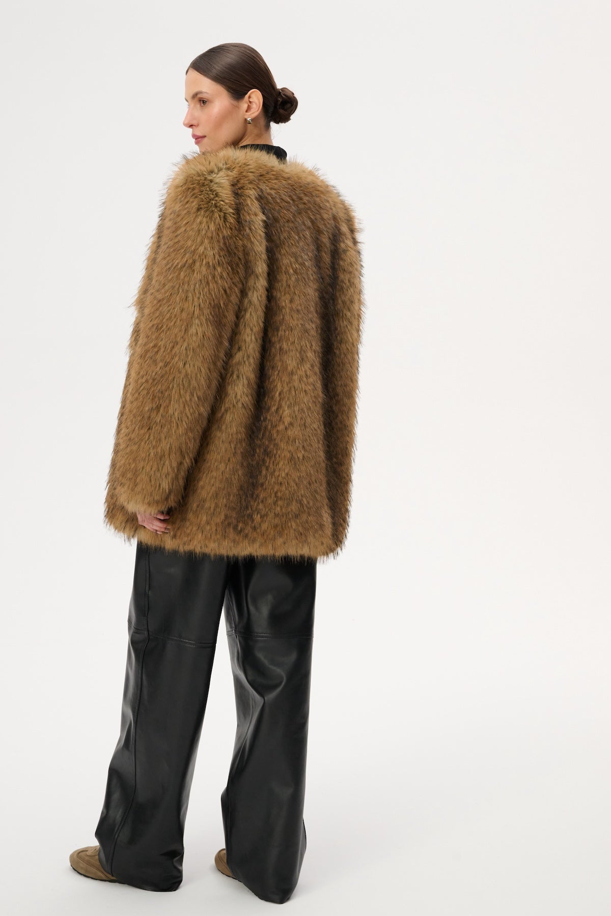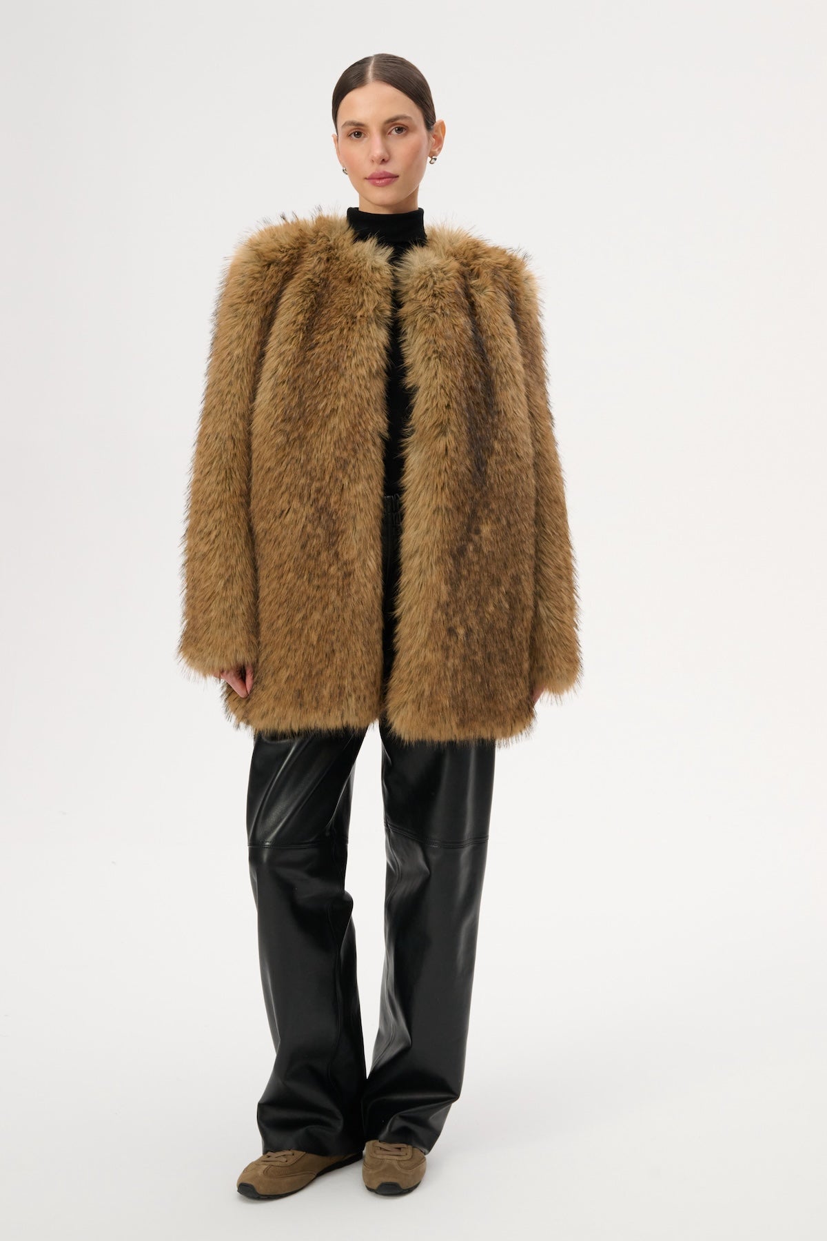 This long, boxy jacket is crafted from soft, light brown faux fur. It features a top hook-and-eye closure and two pockets.
