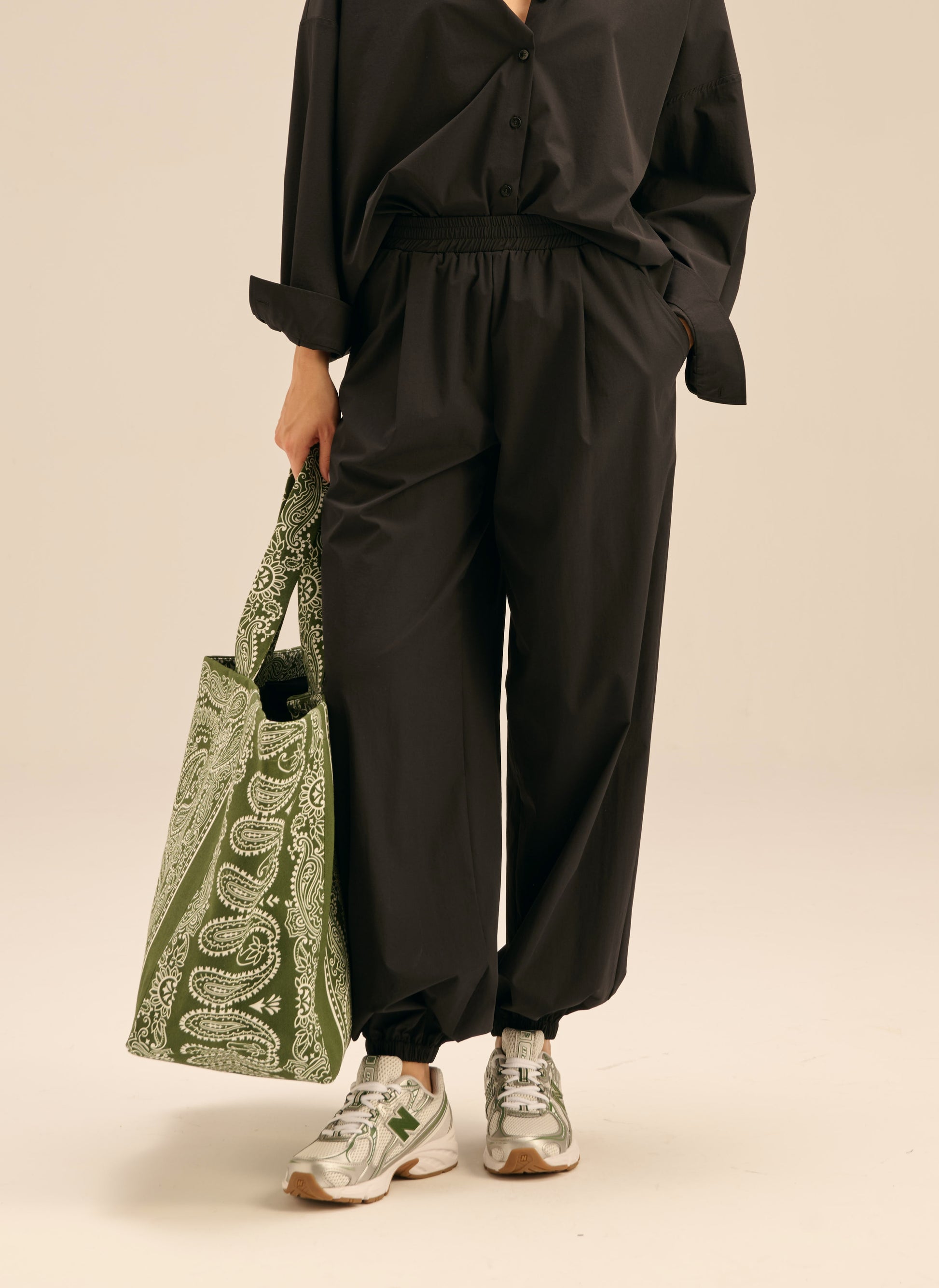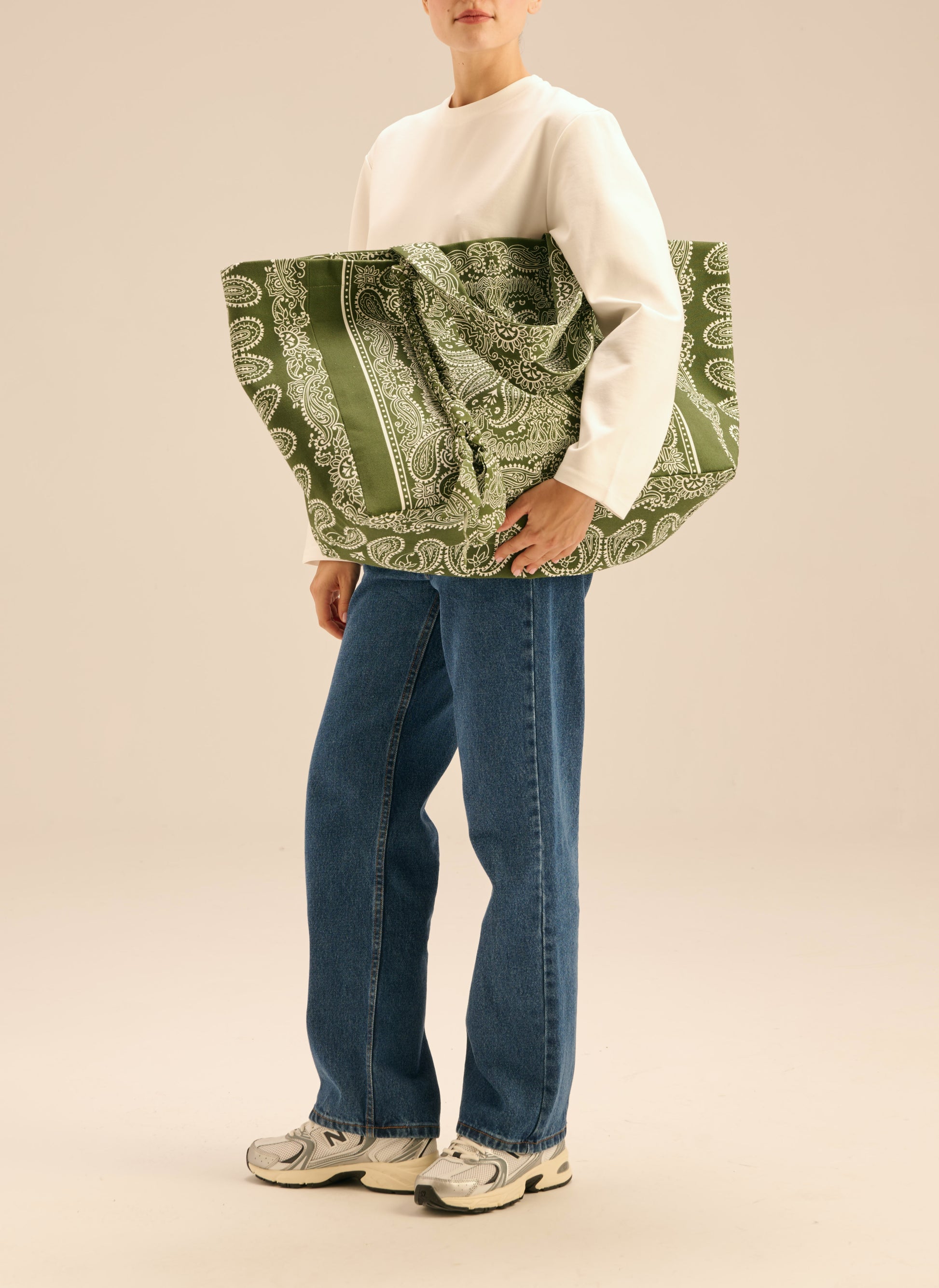 Oversized shopper bag made of thick cotton canvas with a green and ecru bandana print.