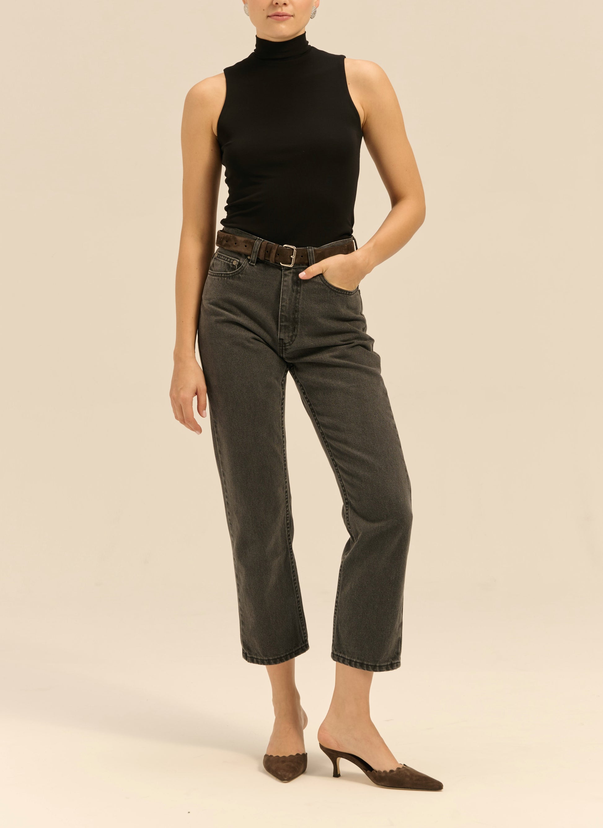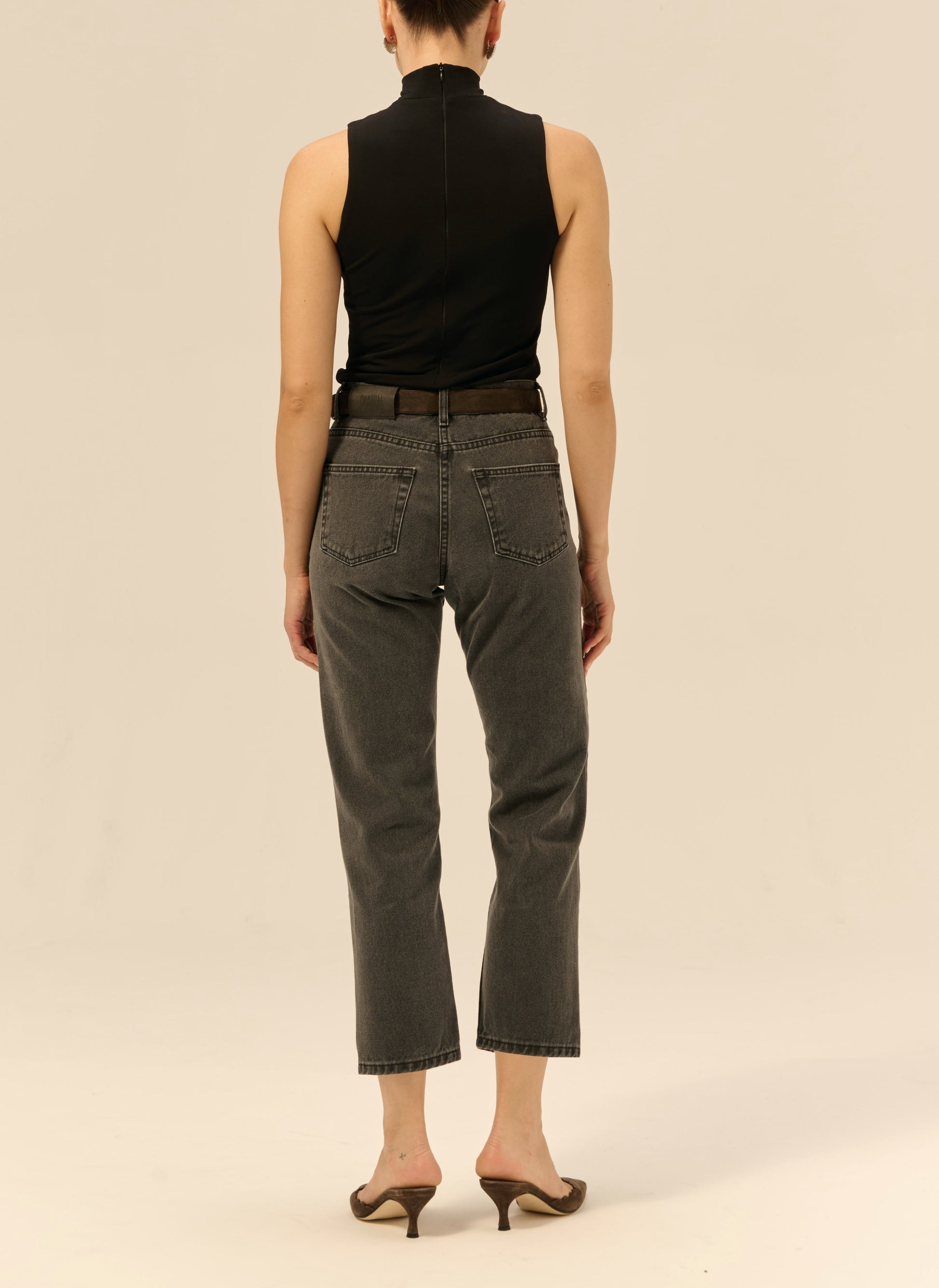 Jeansy o klasycznym fasonie z wysokim stanem i zwężaną nogawką o długości sięgającej lekko ponad kostkę. Wykonane w 100% z nieelastycznej bawełny w ciemnoszarym kolorze. Posiadają zapięcie na guzik i suwak, skórzaną naszywkę z wytłoczonym logo z tyłu oraz pięć kieszeni.