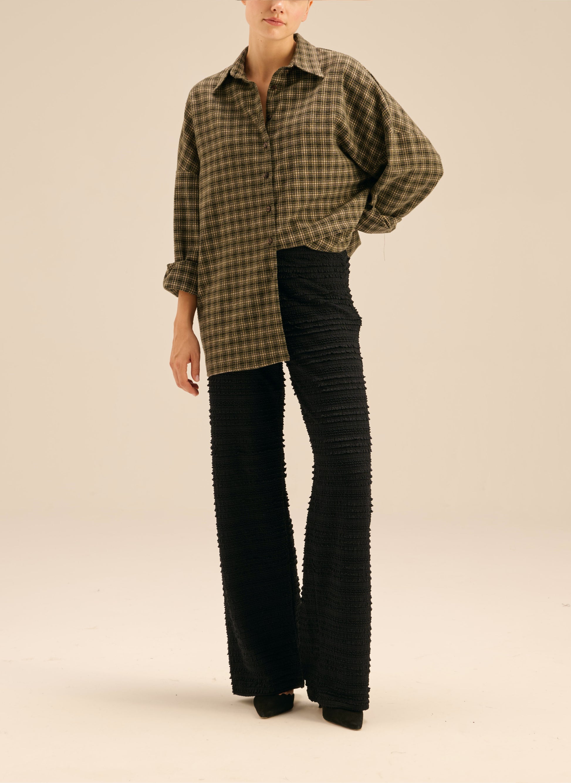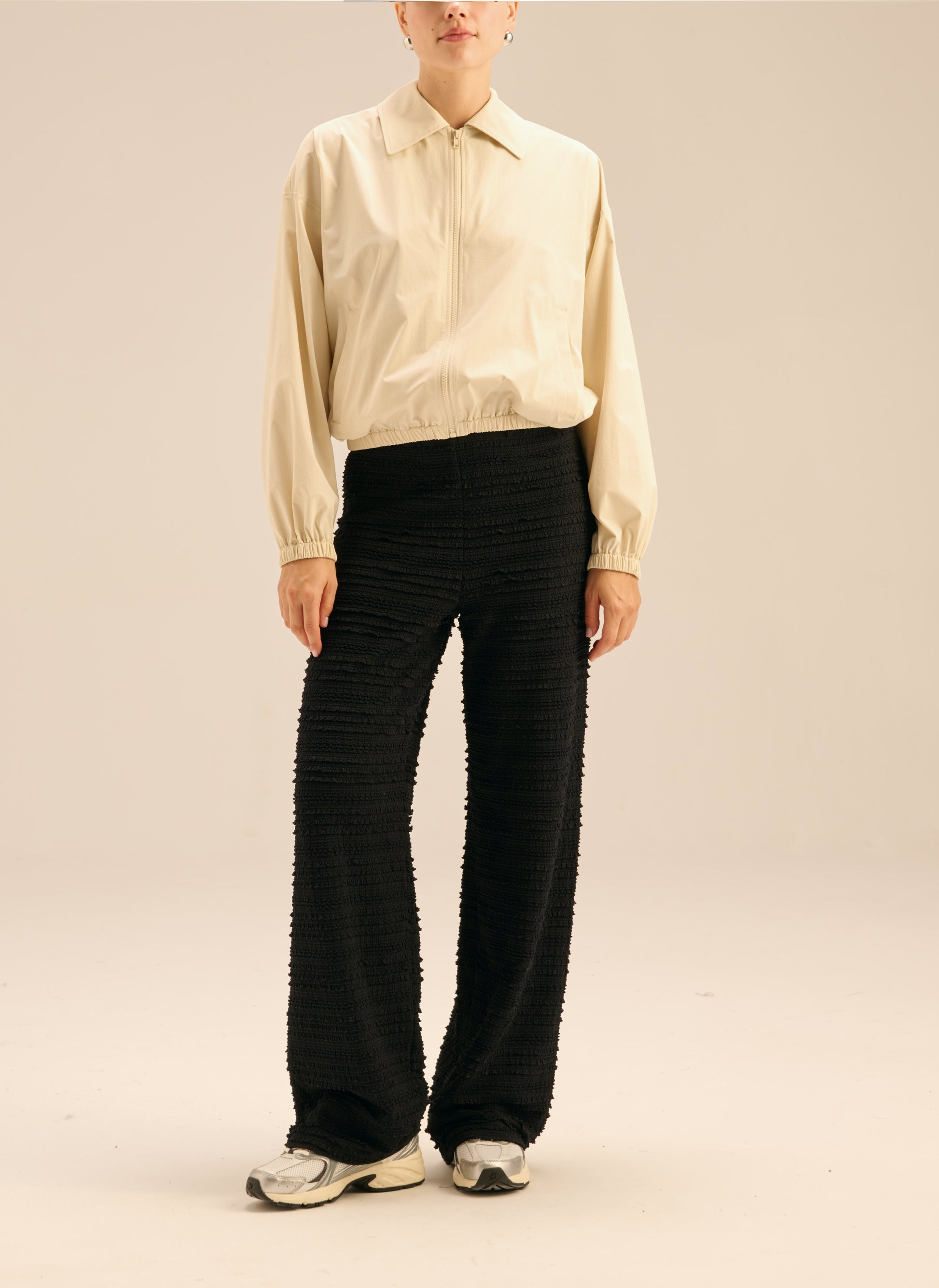 Lekkie spodnie wykonane z elastycznego materiału, układającego się w falbanki w kolorze głębokiej czerni, Posiadają proste, długie nogawki, podwyższony stan oraz zapięcie na kryty suwak z tyłu.