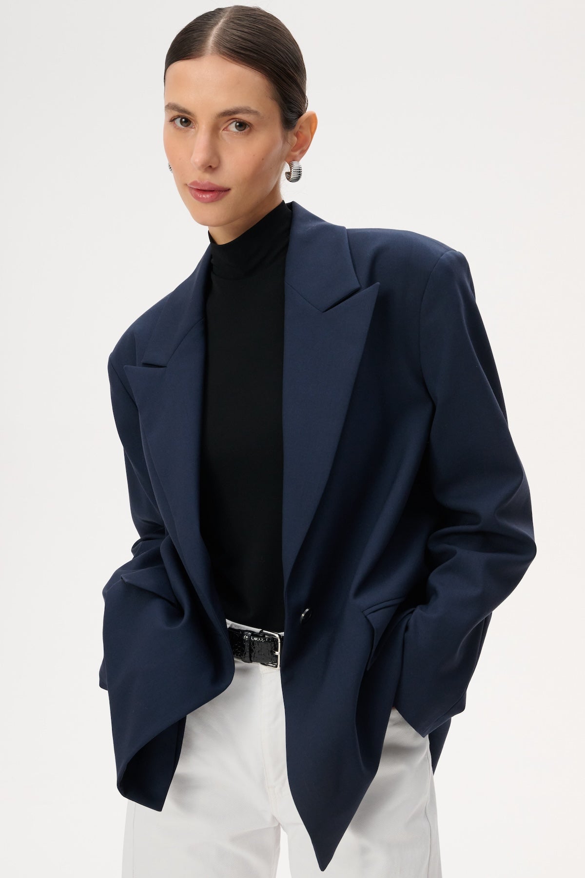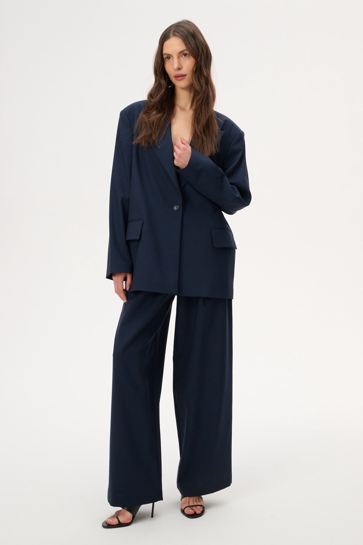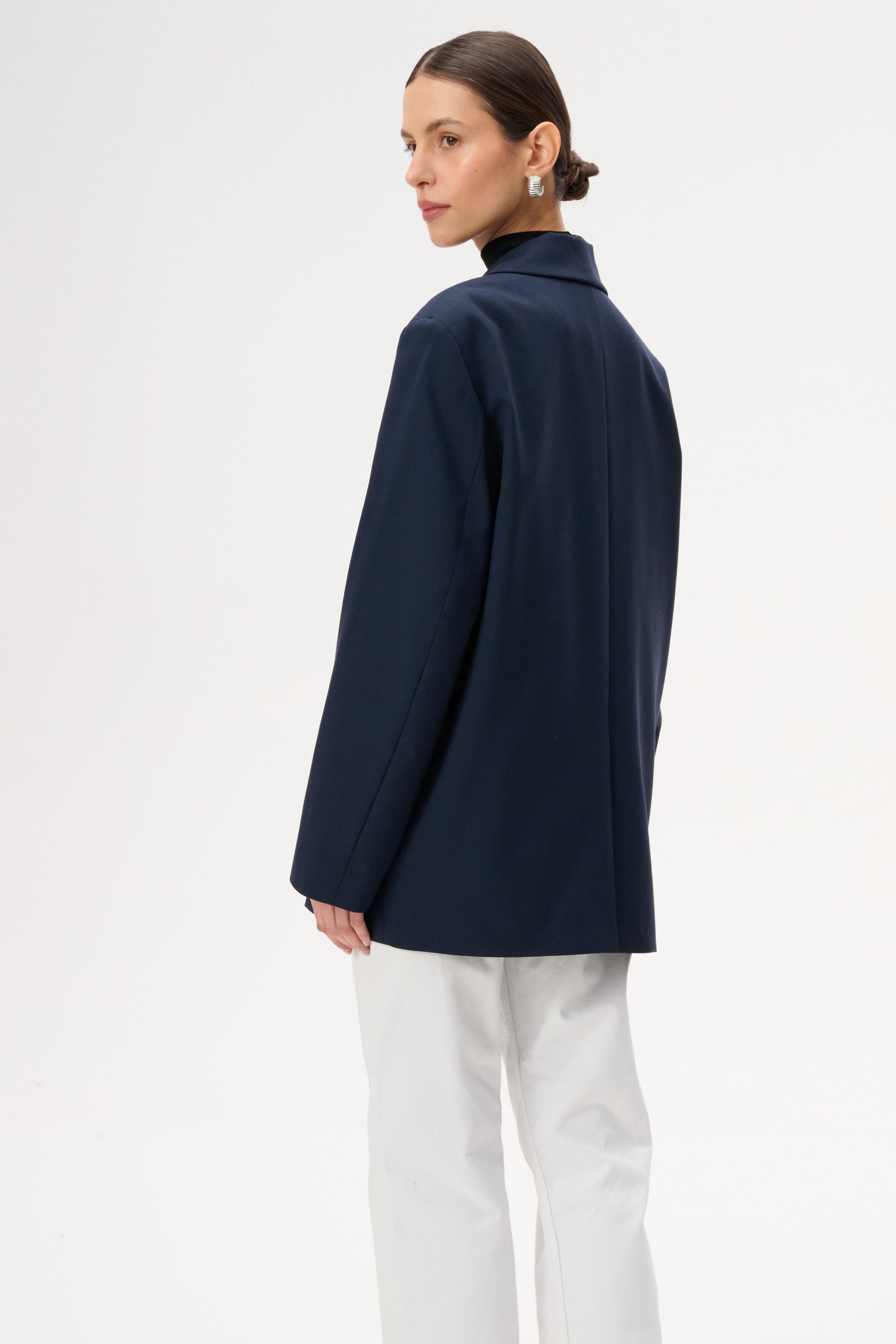 This lightweight, oversized blazer features long peak lapels and a single-button closure. Crafted entirely from soft navy blue virgin wool.