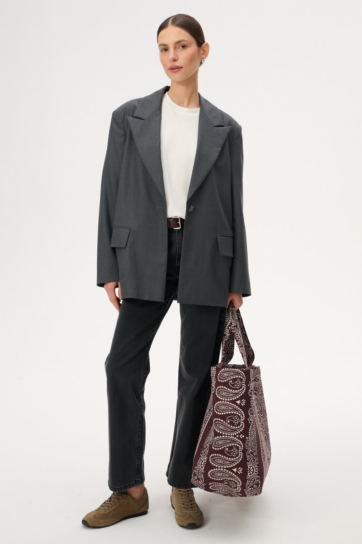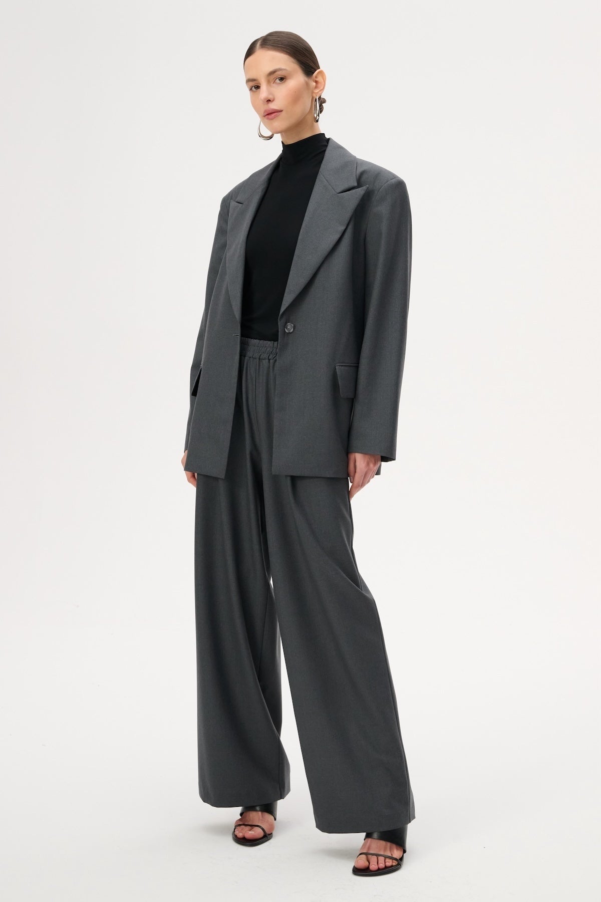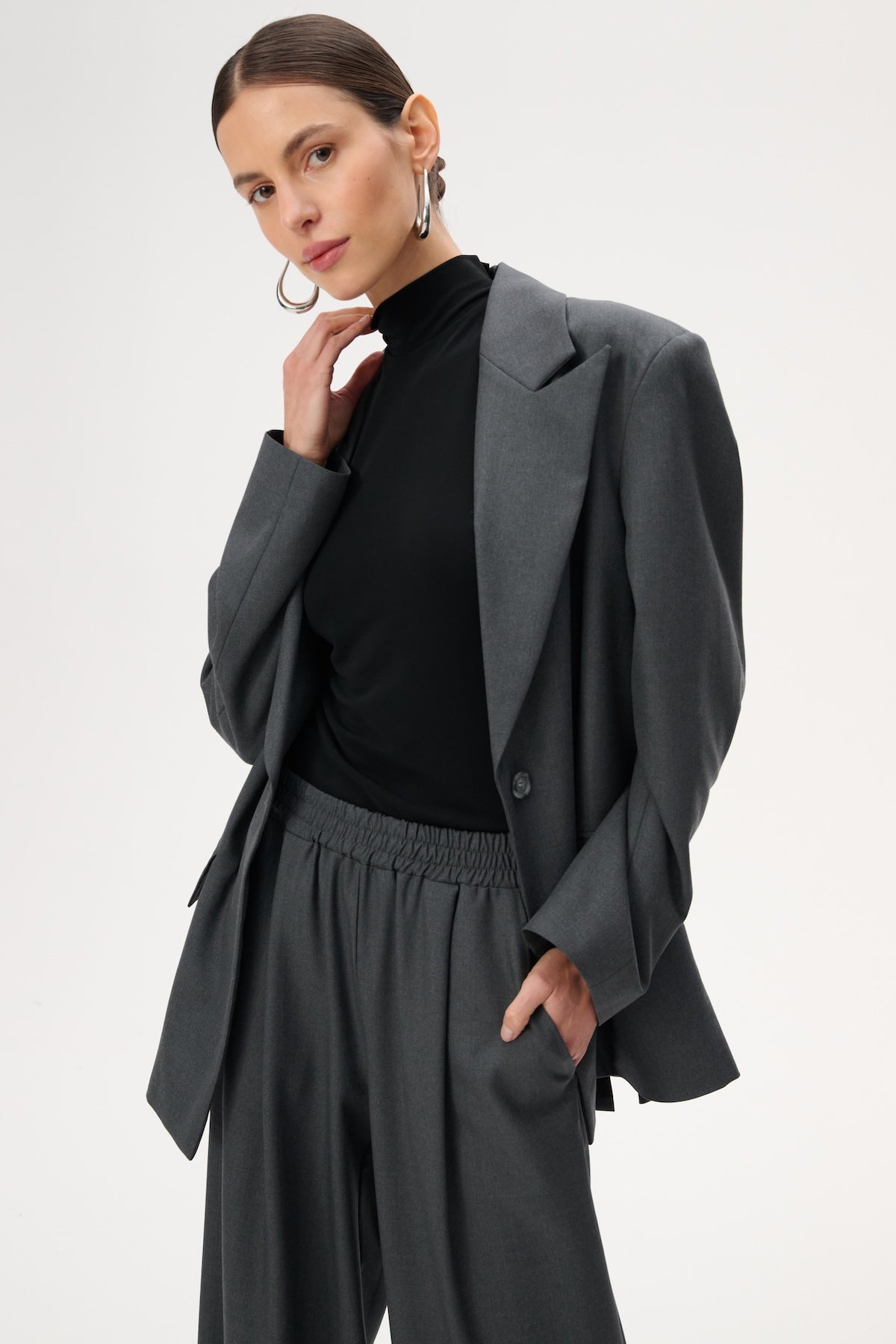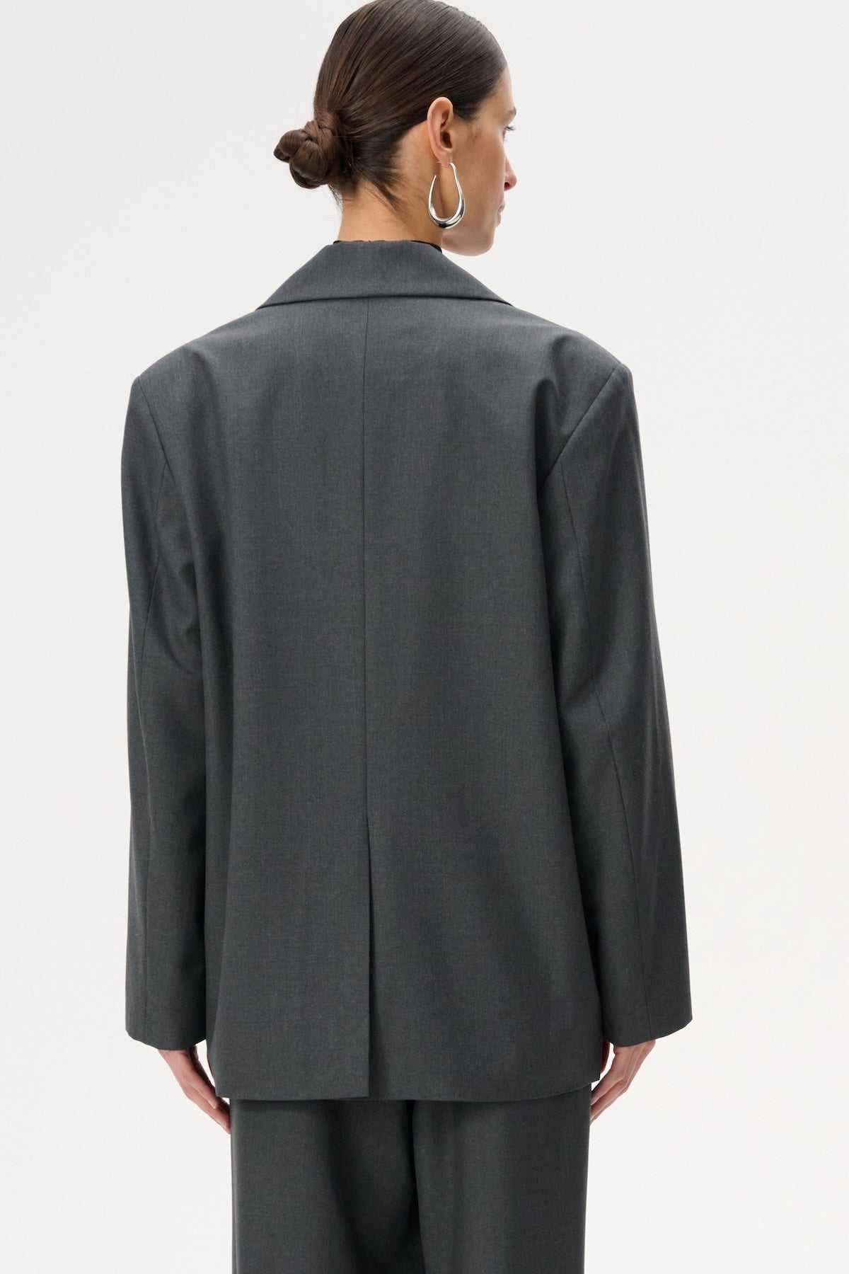 This lightweight, oversized blazer features long peak lapels and a single-button closure. Crafted entirely from soft, gray virgin wool.