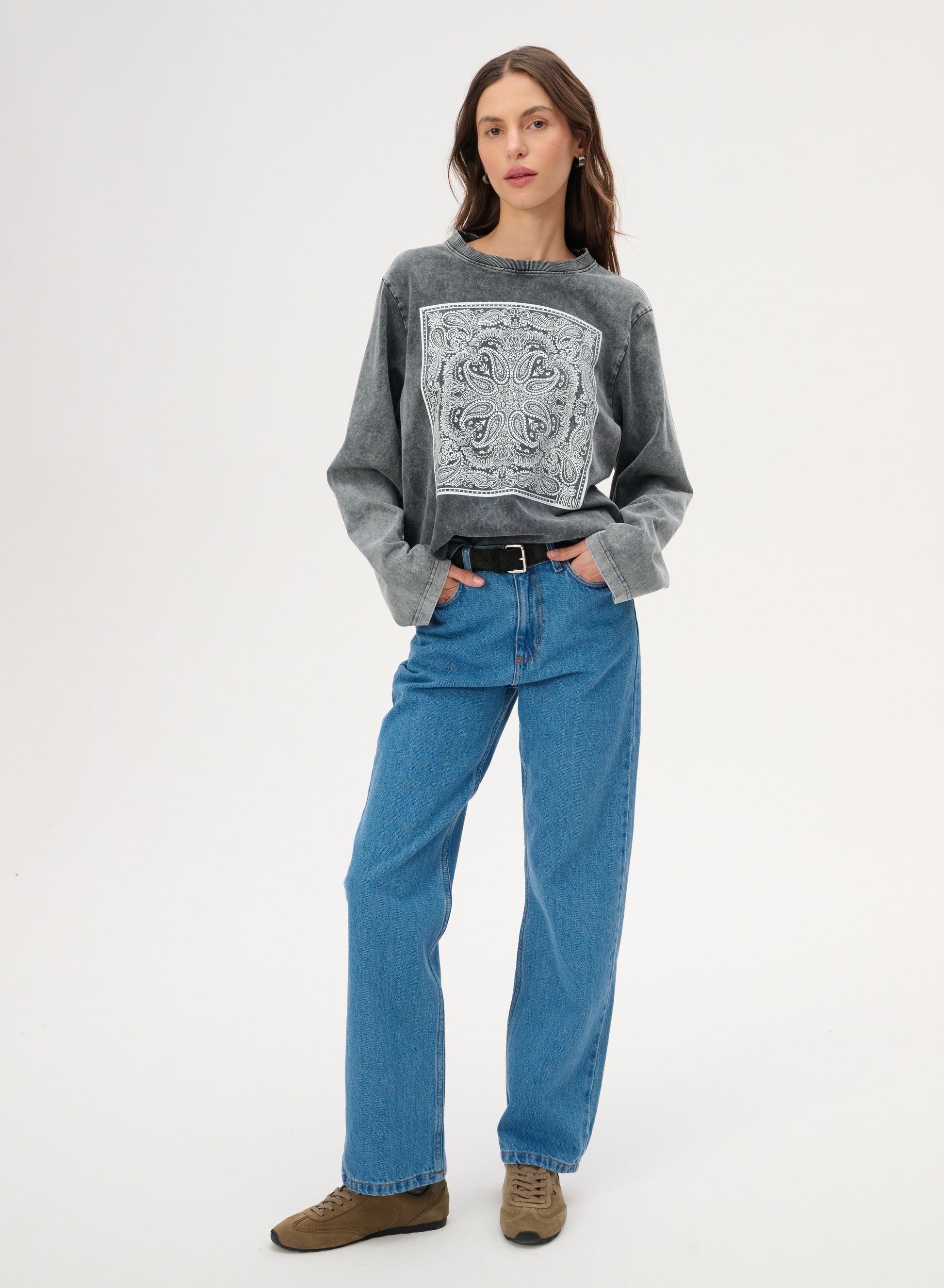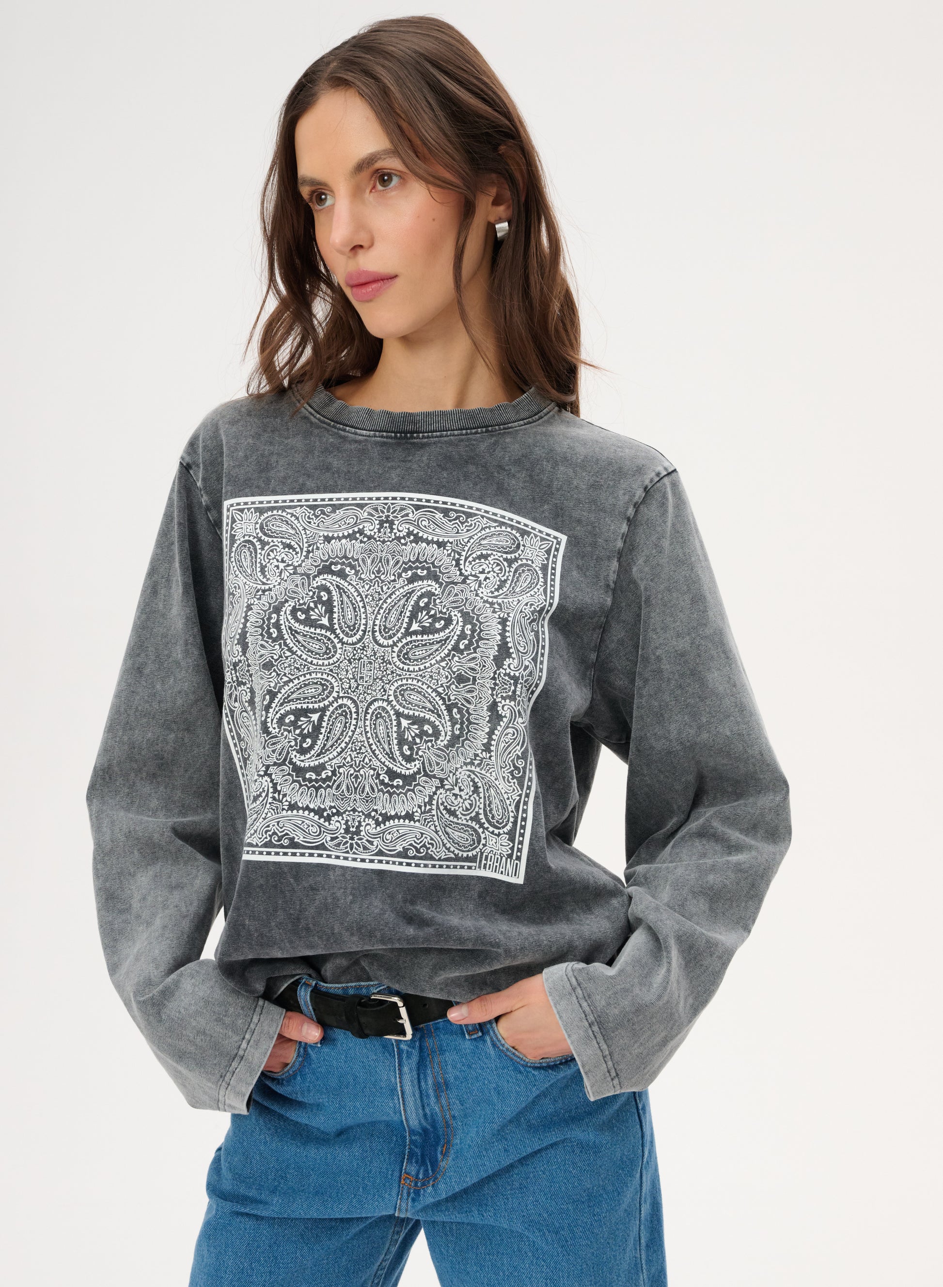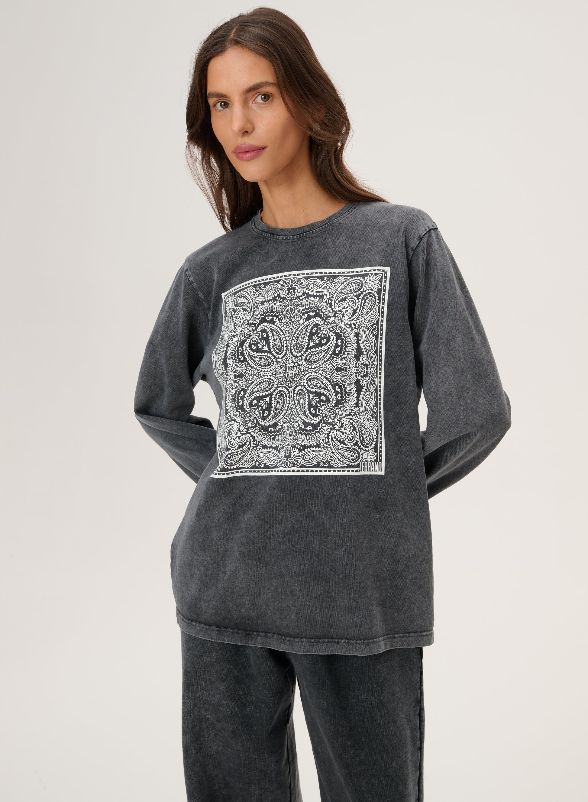 Longsleeve z szarej dzianiny z efektem sprania. O luźnym kroju z okrągłym dekoltem. Posiada nadruk w rozpoznawalny wzór bandany