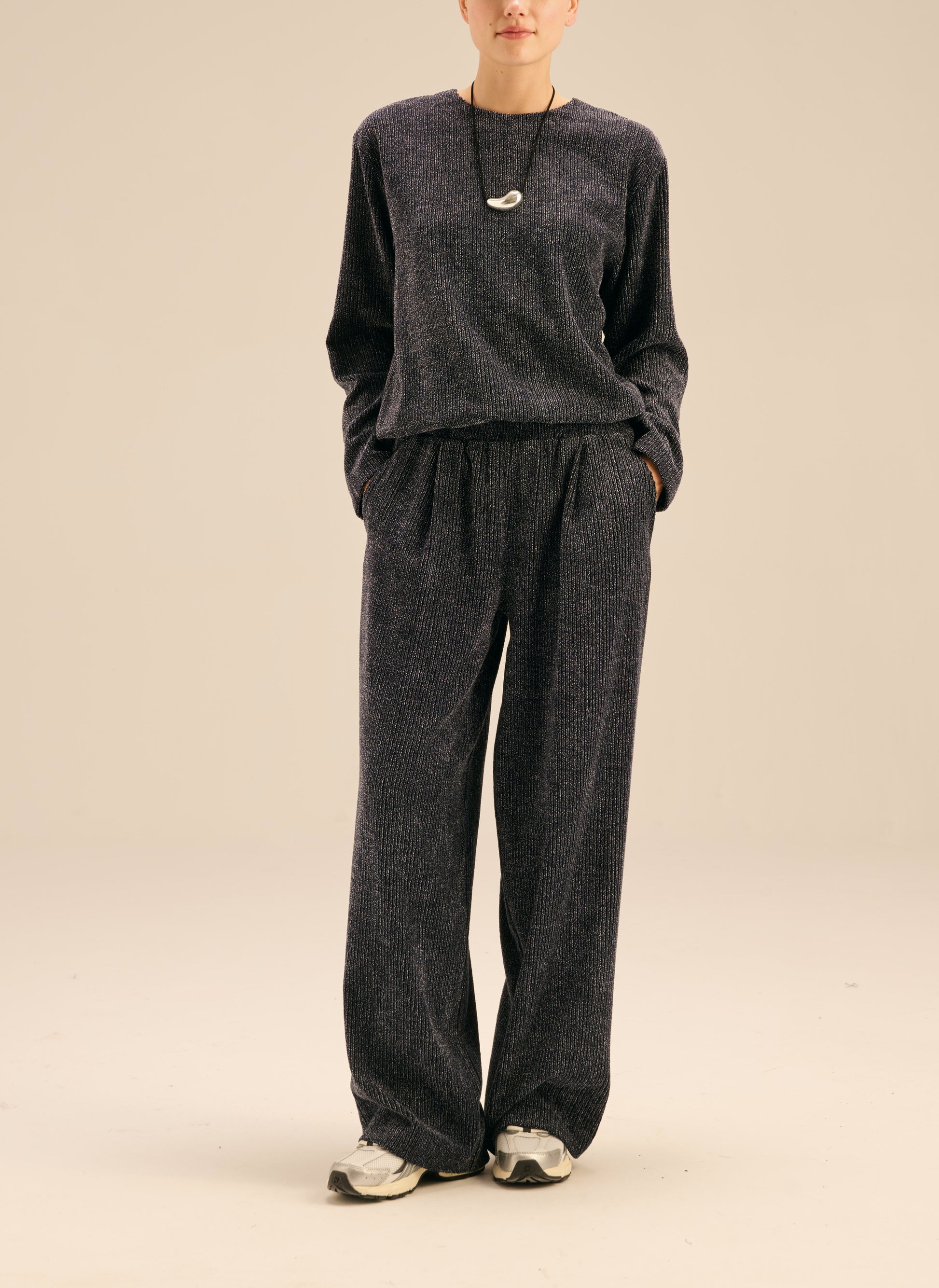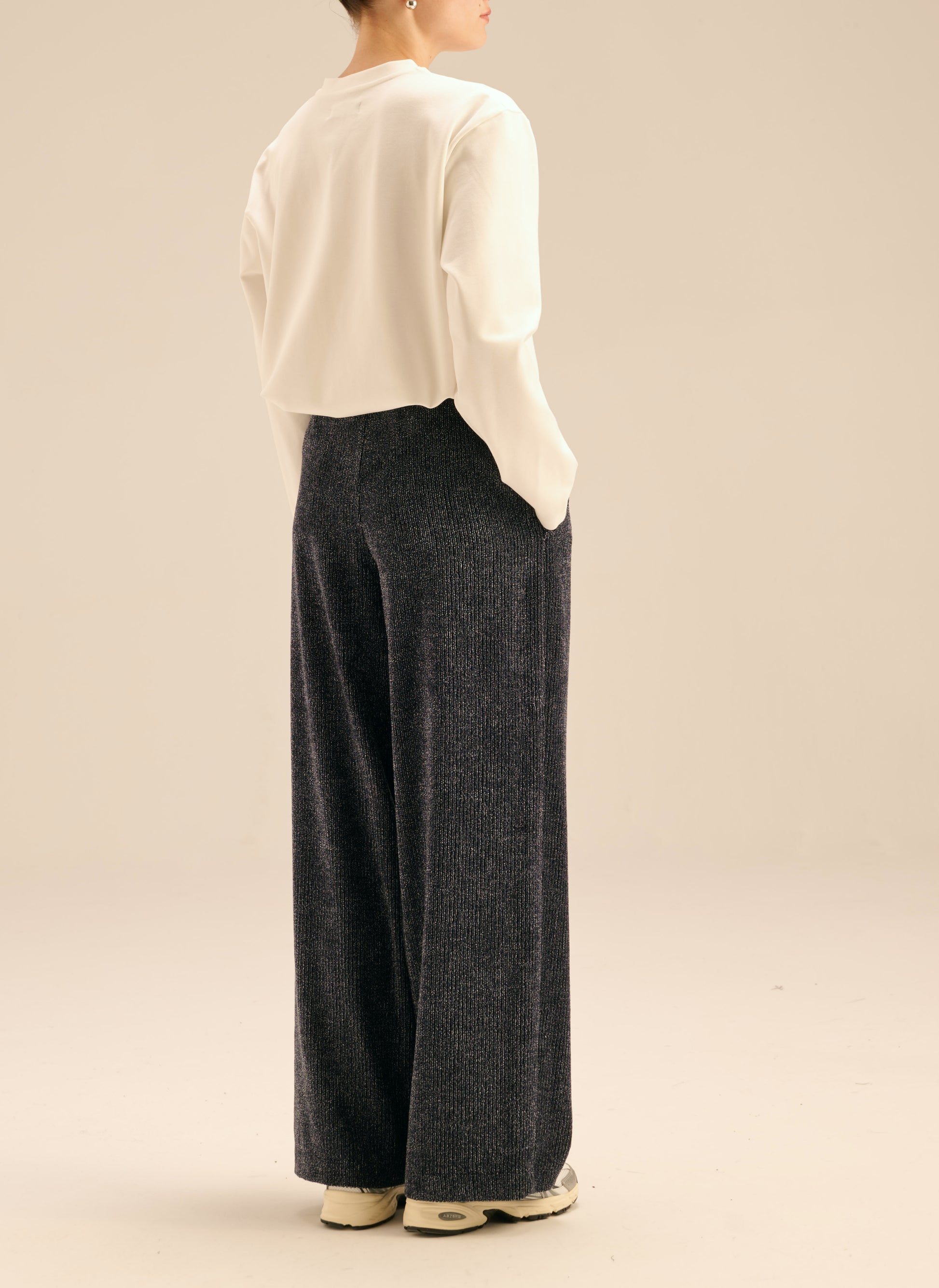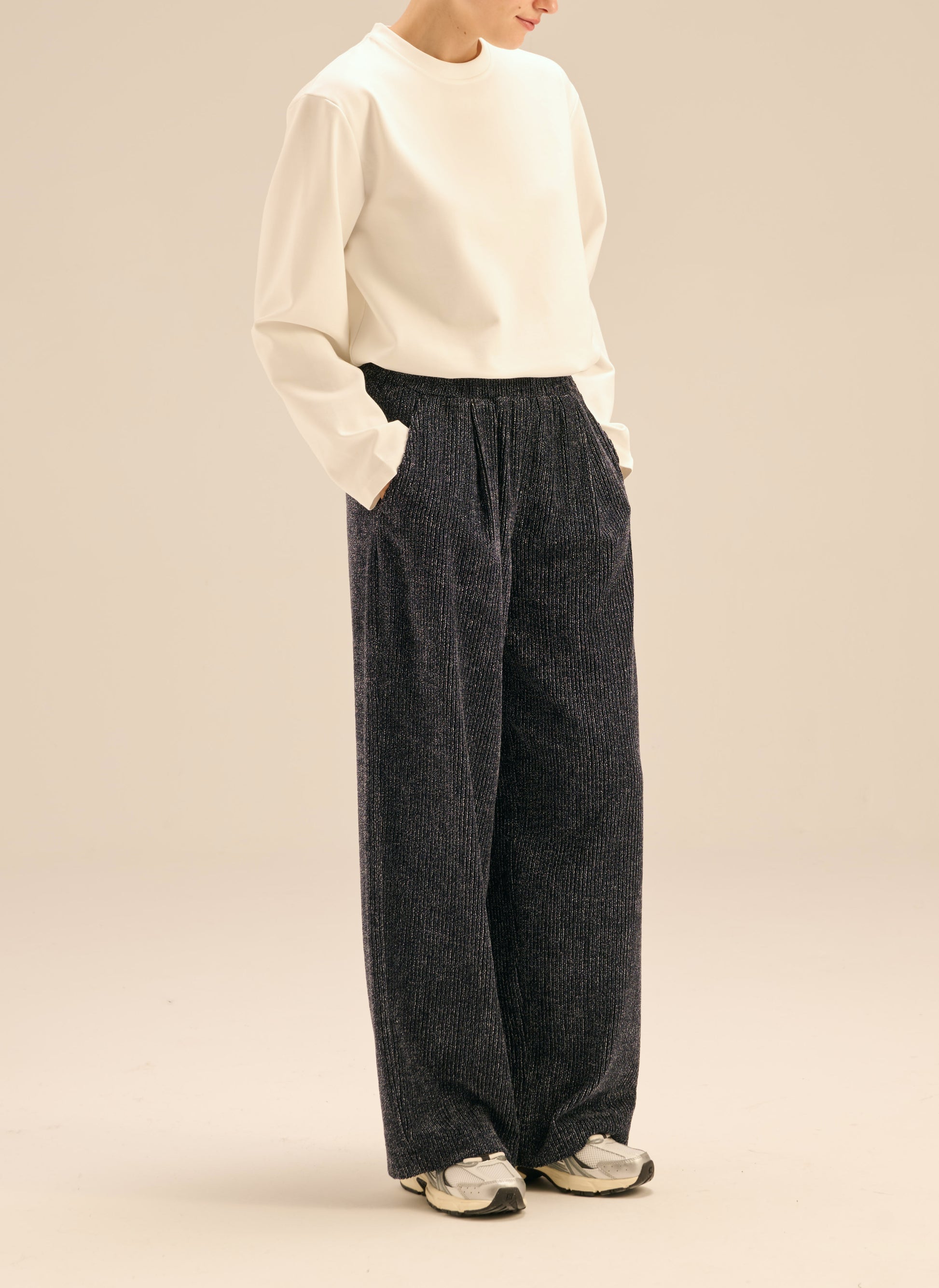 Trousers with long, wide legs, made of soft, navy blue velvet material, decorated with metallic thread. They have a regular waist, delicate darts and an elastic waist.