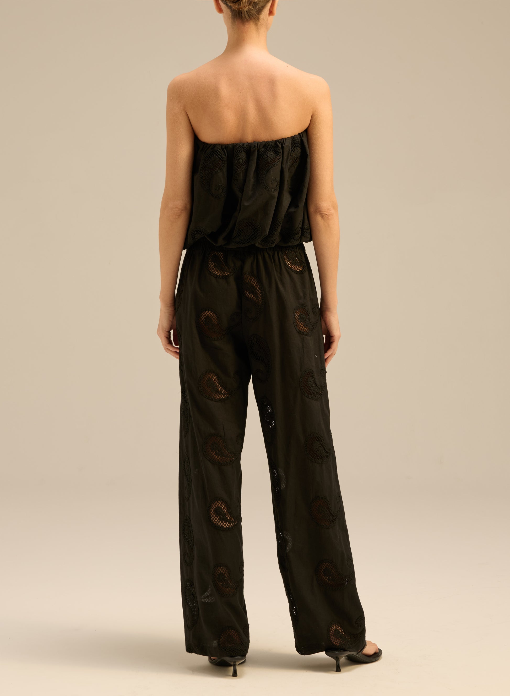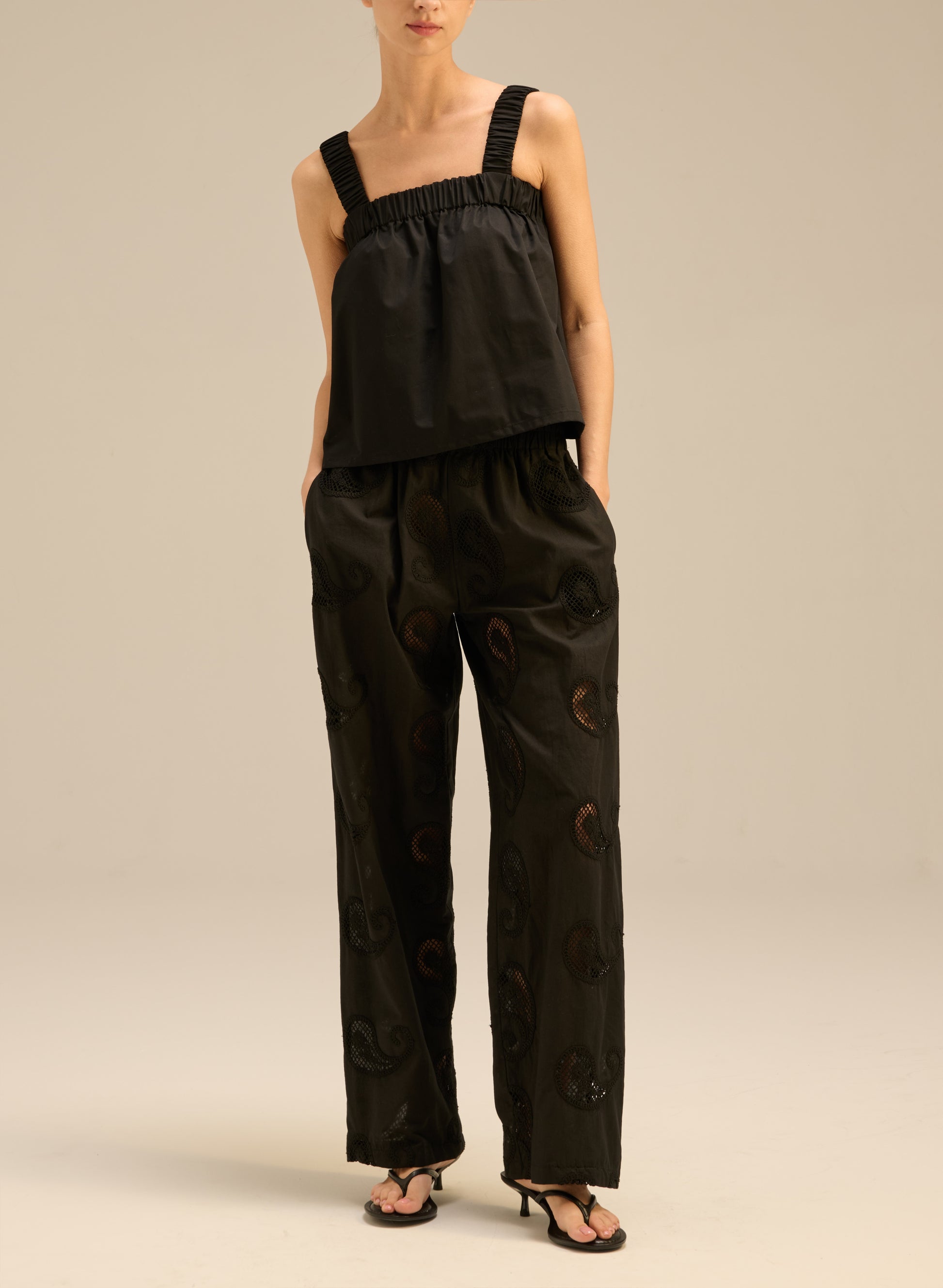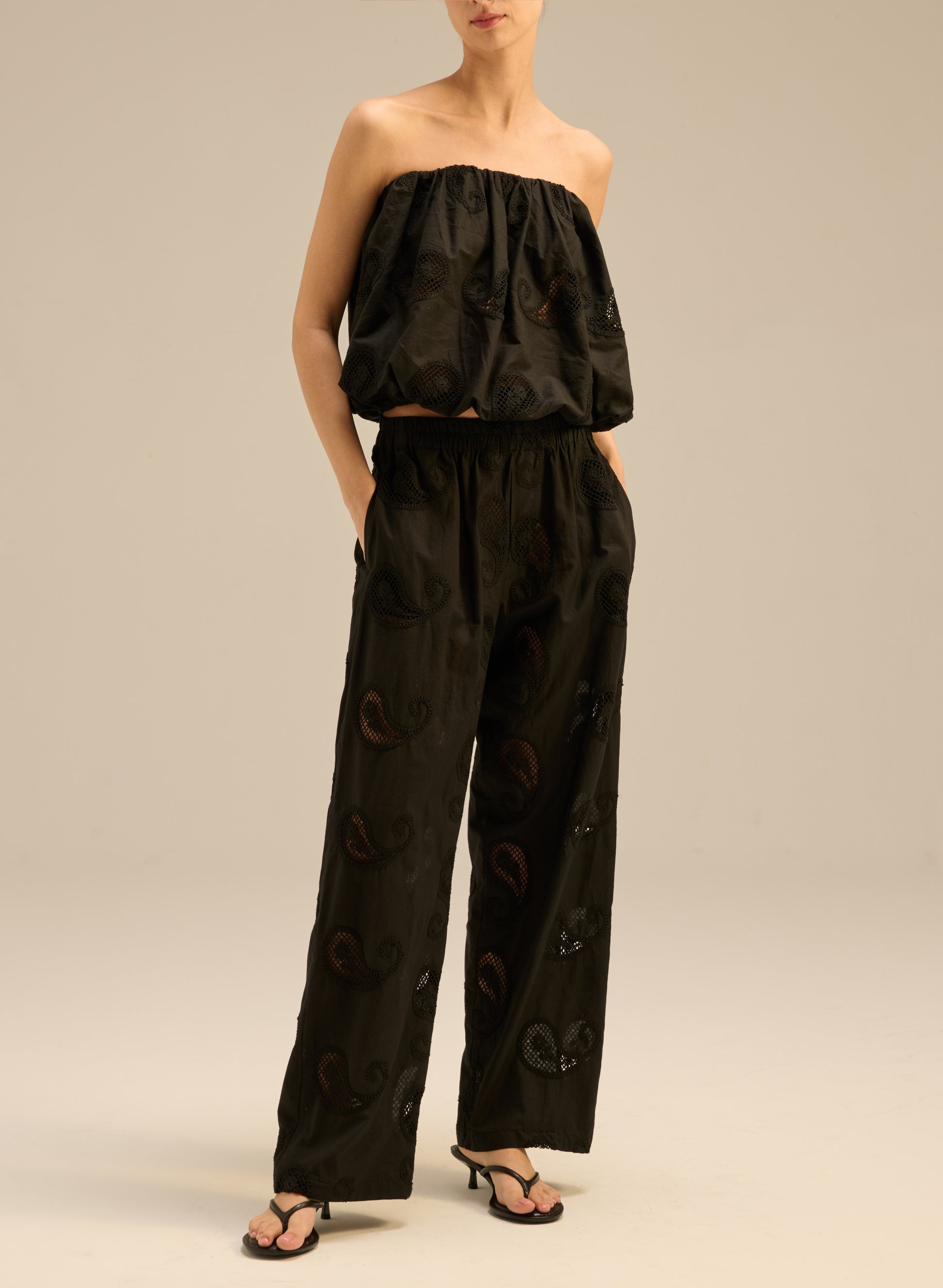 Wide-leg, openwork trousers with long legs, made of delicate black cotton. They feature embroidered patterns, an elastic waistband, and two side pockets.