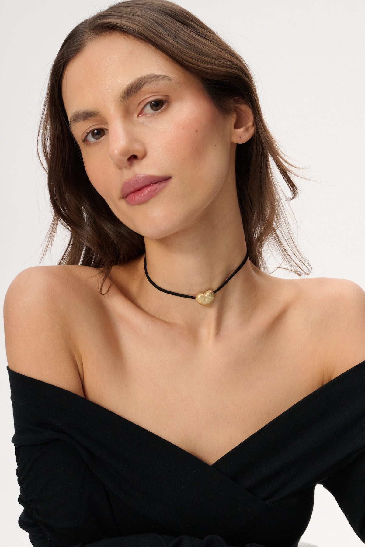 Handmade choker-style necklace, decorated with a heart-shaped pendant, made of a jewelry alloy of tin and silver, gilded with 24-karat gold and covered with ceramic, which protects against abrasion and discoloration.