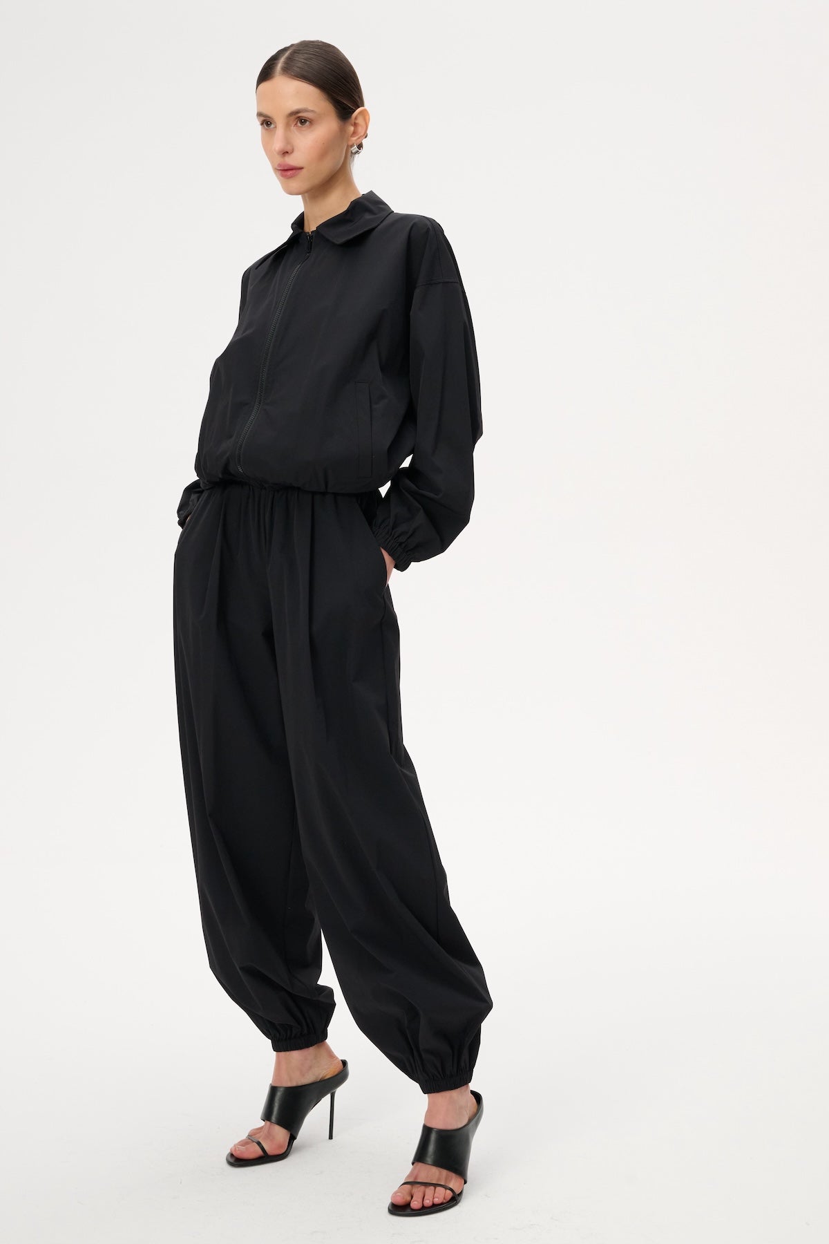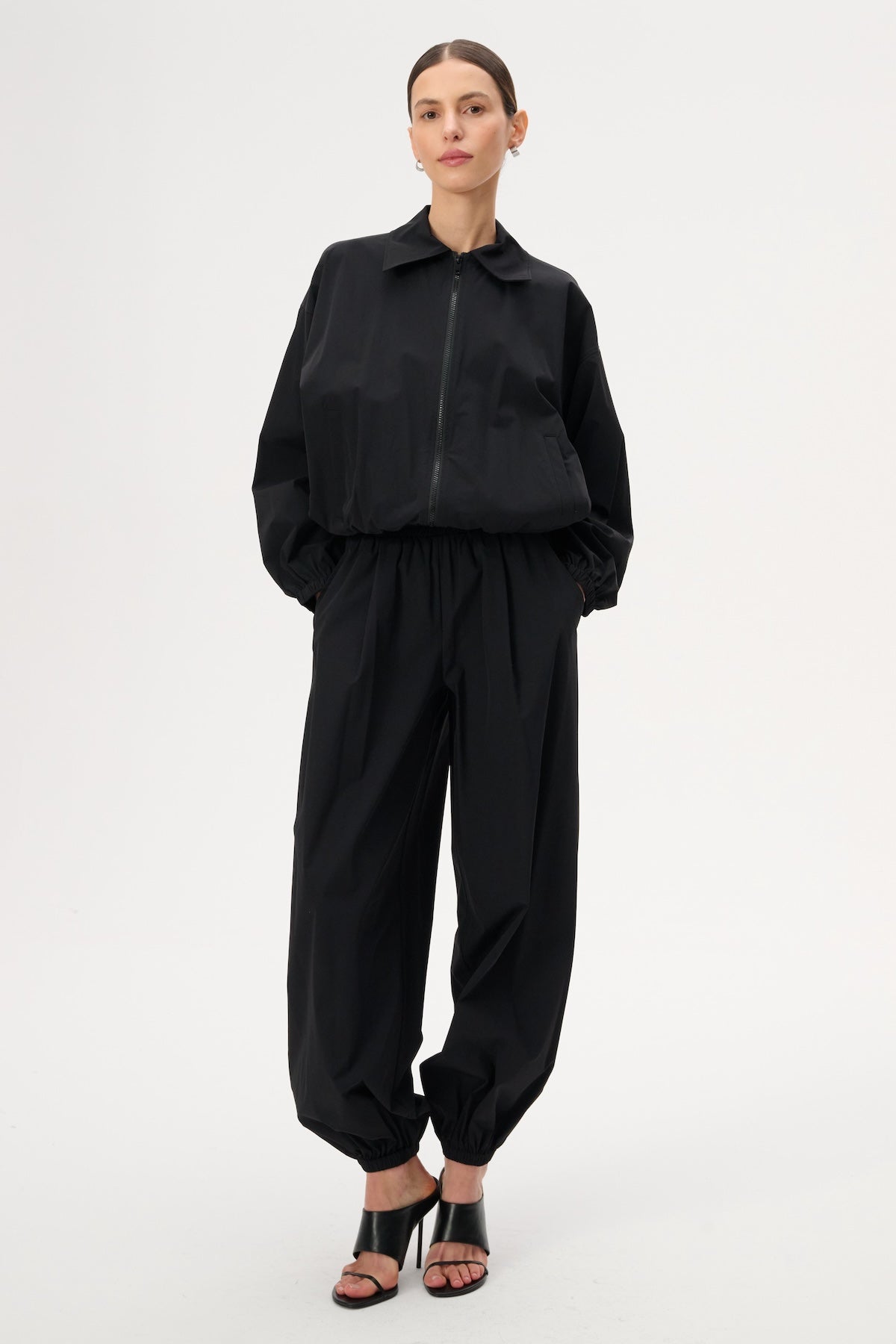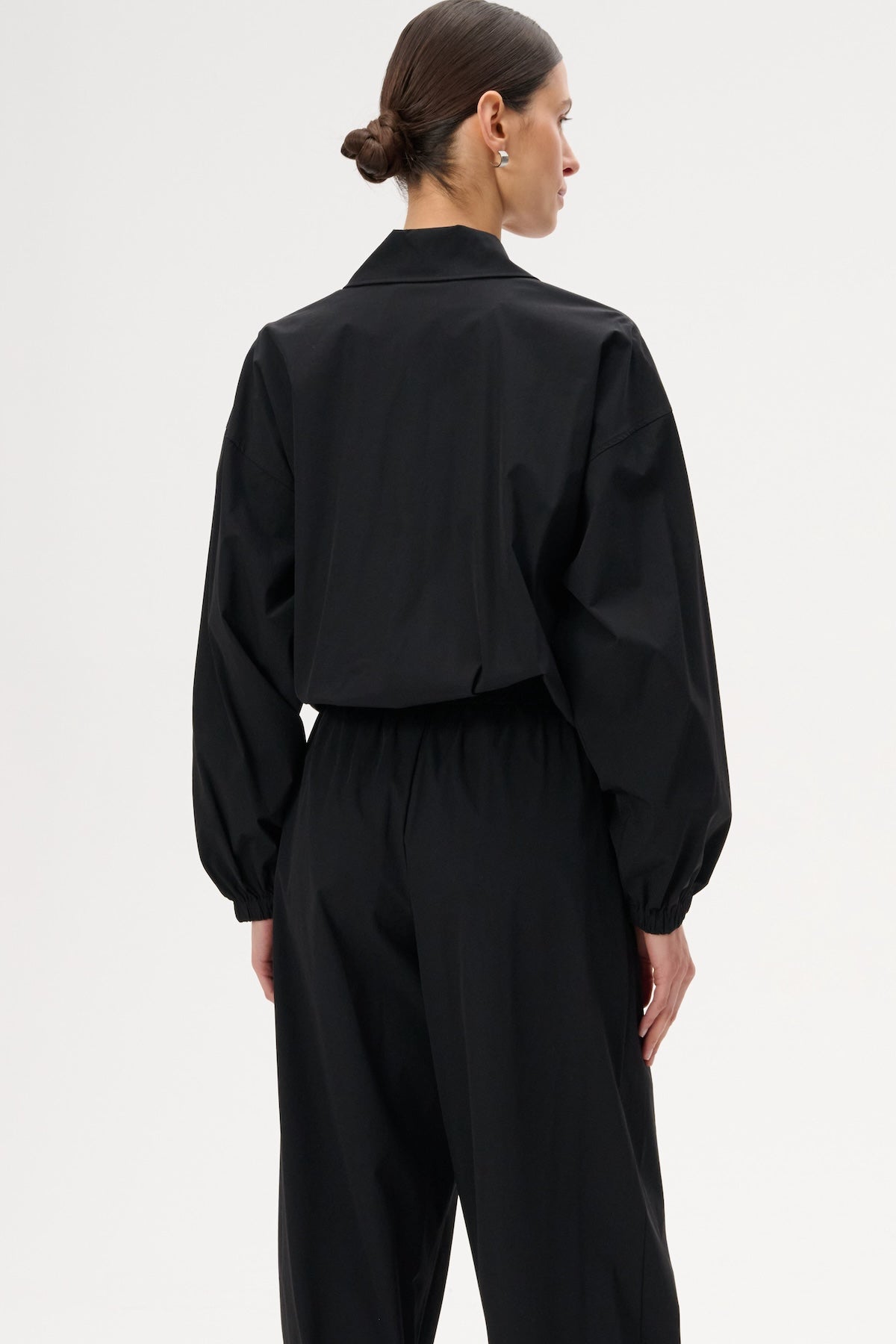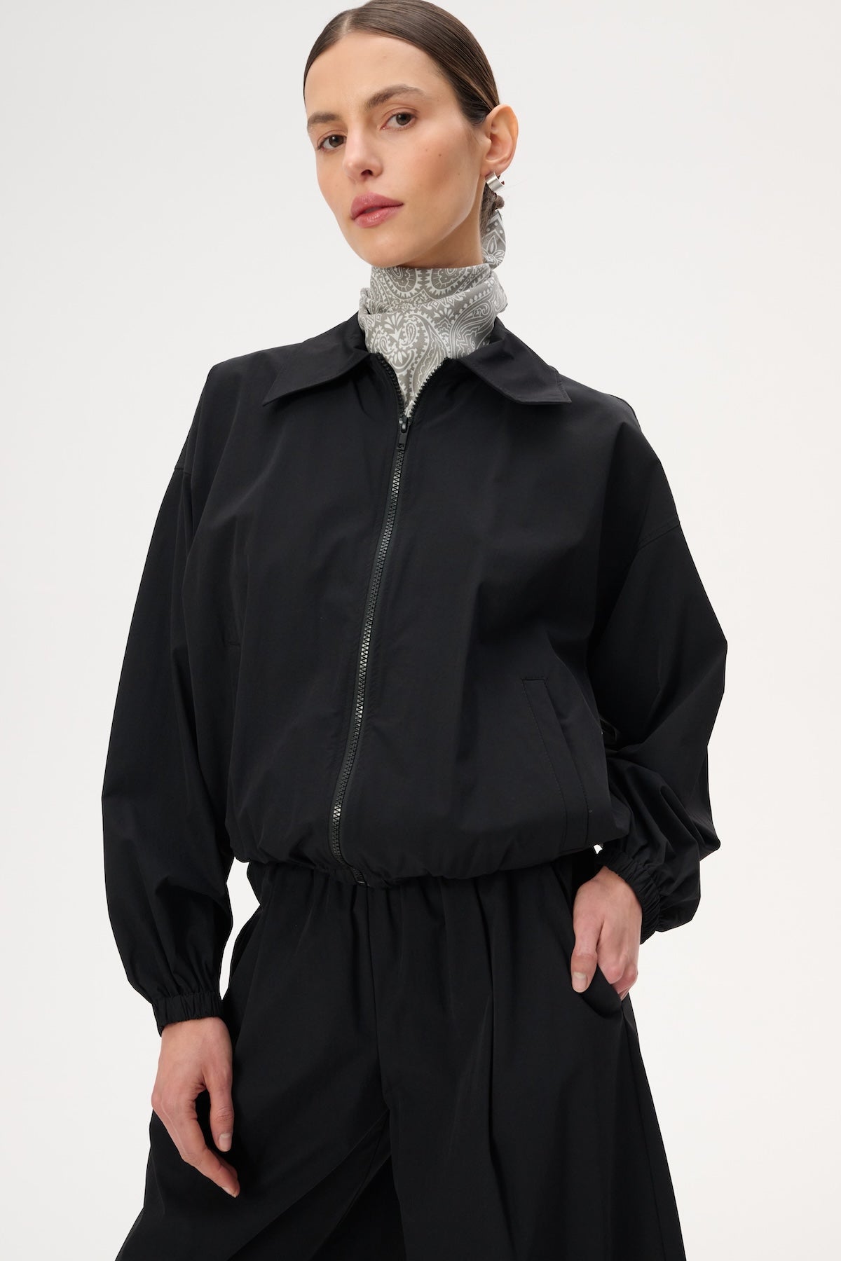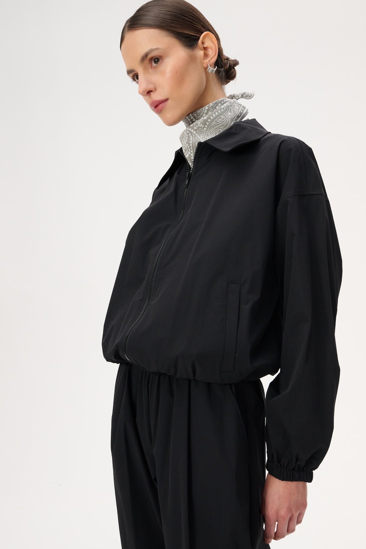 This loose-fitting nylon jacket is made of lightweight black fabric. It features an elasticated hem and cuffs, two side pockets, and a zipper closure.