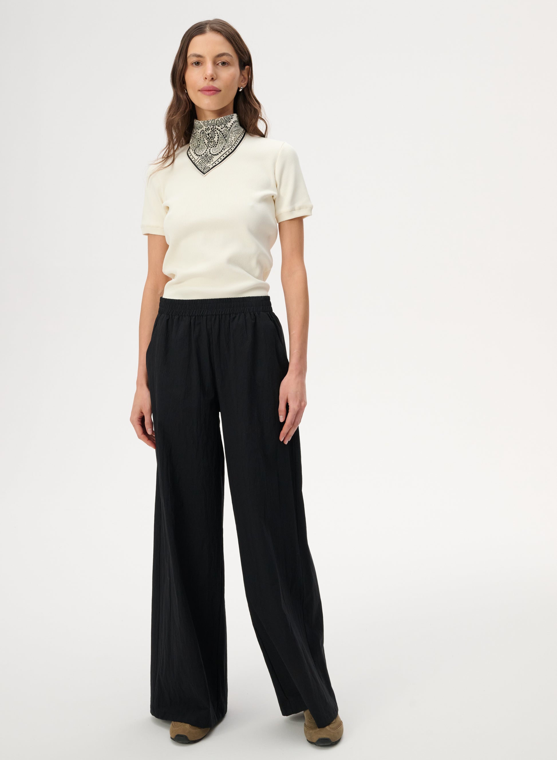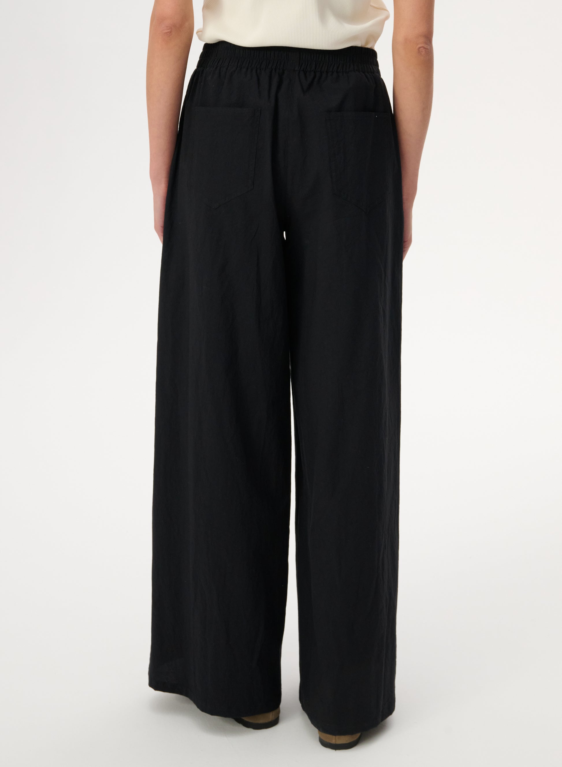 Spodnie o długich, szerokich nogawkach, wykonane w całości z tkaniny bawełnianej w kolorze czarnym.