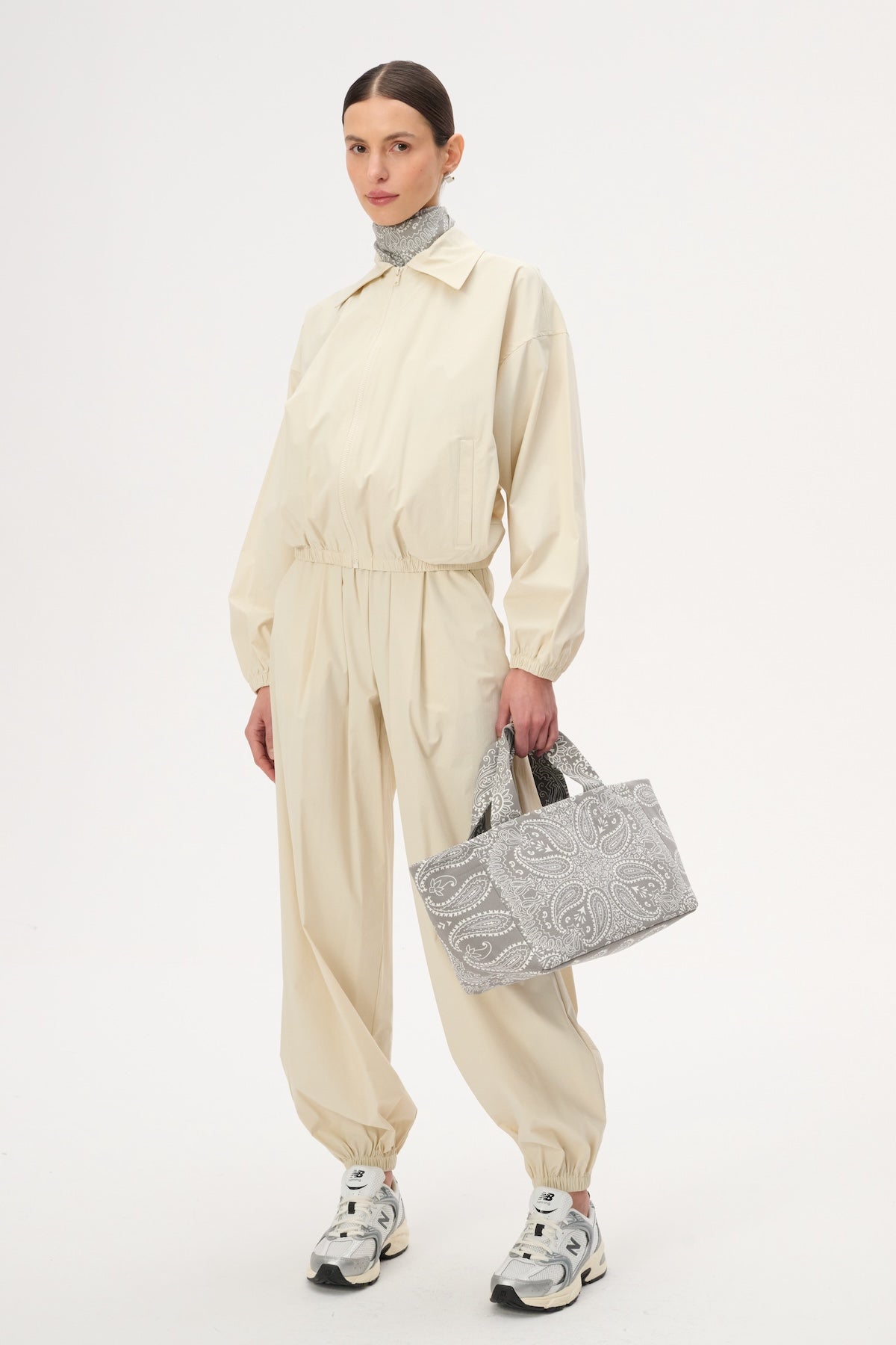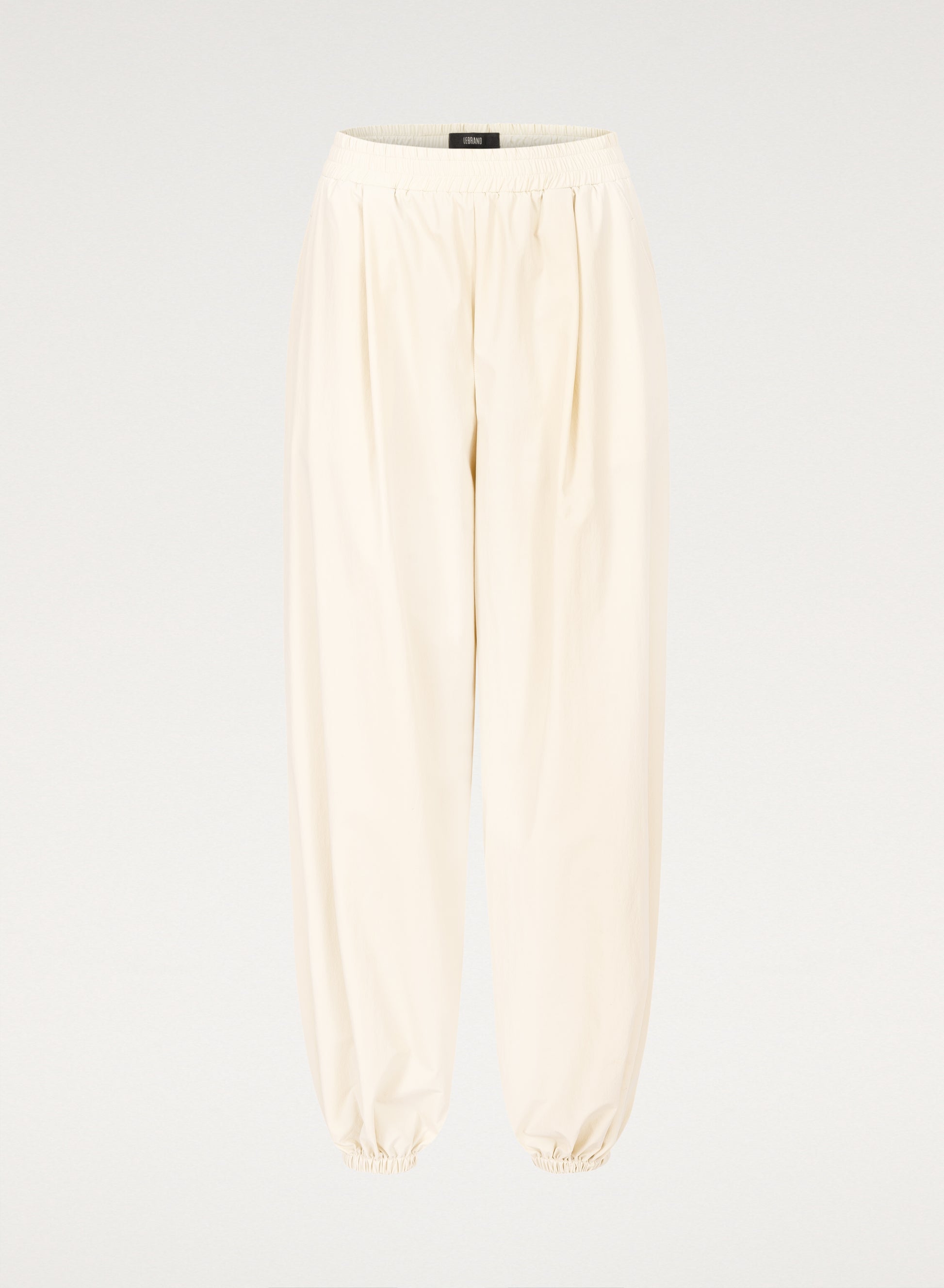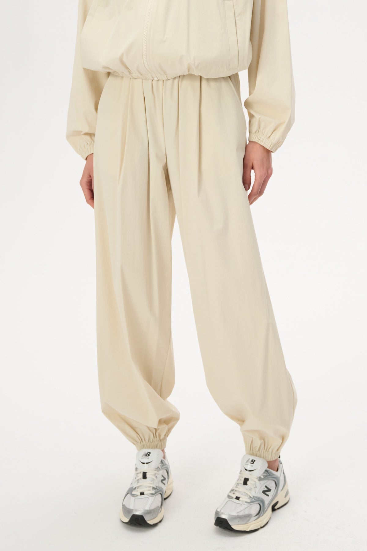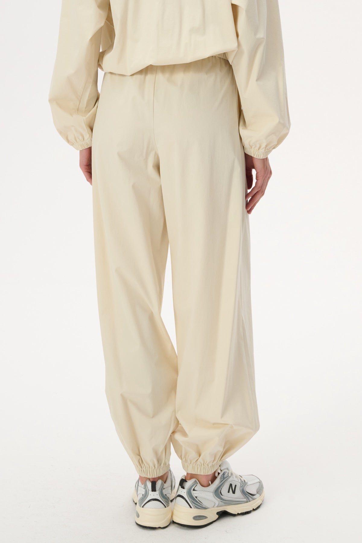 Loose-fitting trousers made of lightweight ecru nylon. They feature an elastic waist, two pockets, and wide legs with elasticated cuffs.