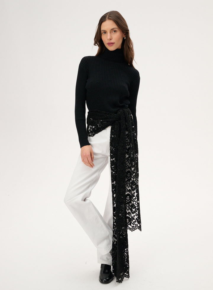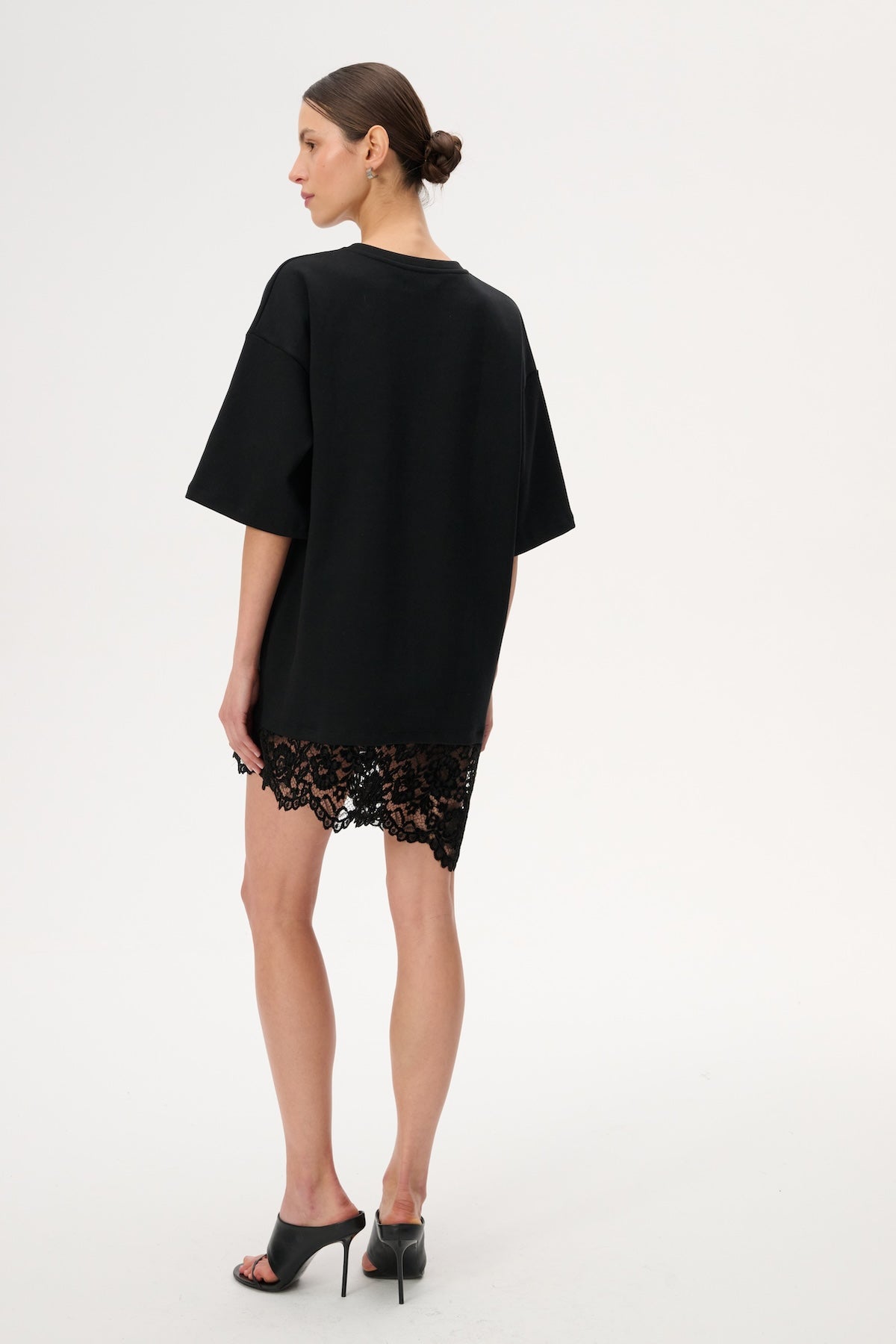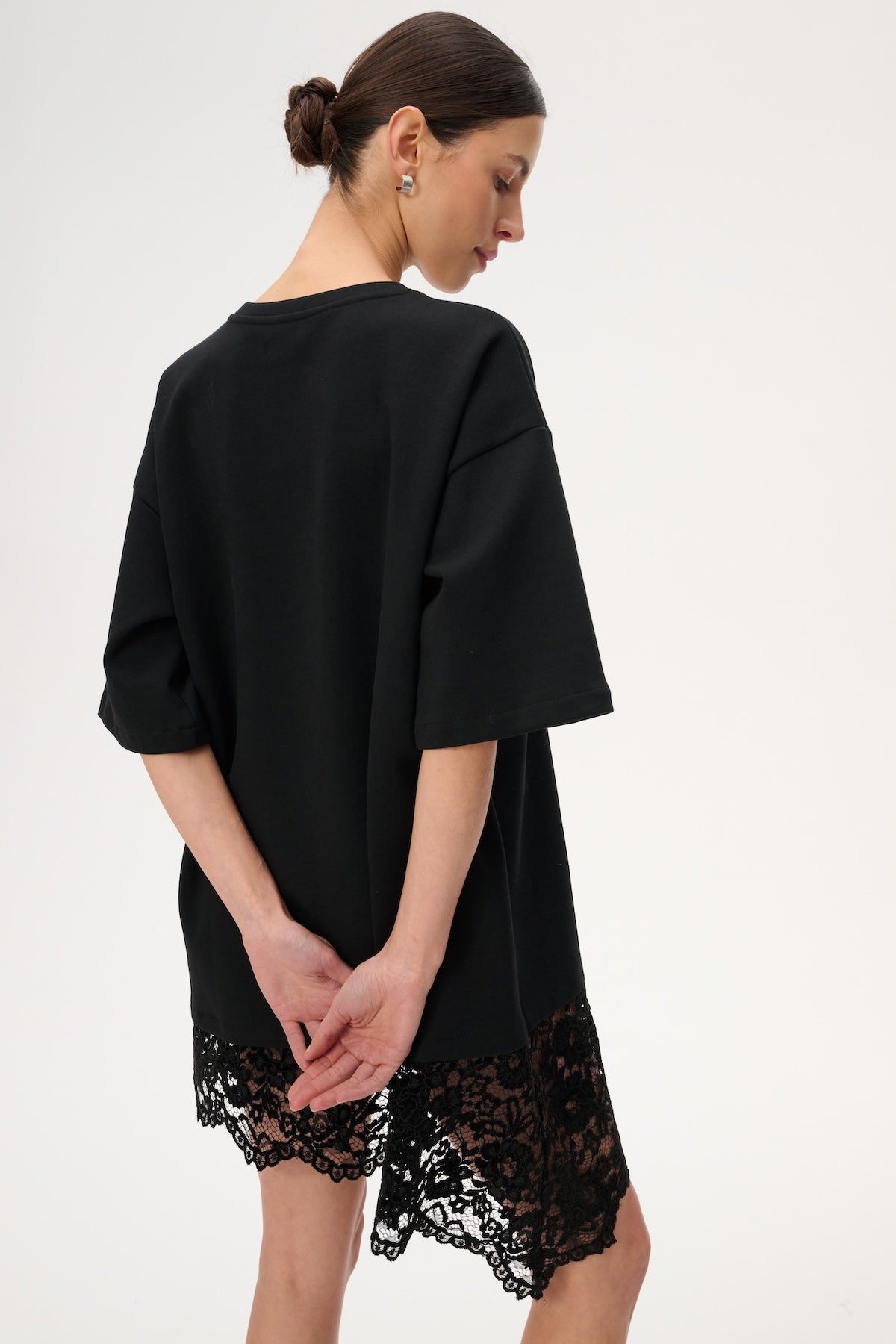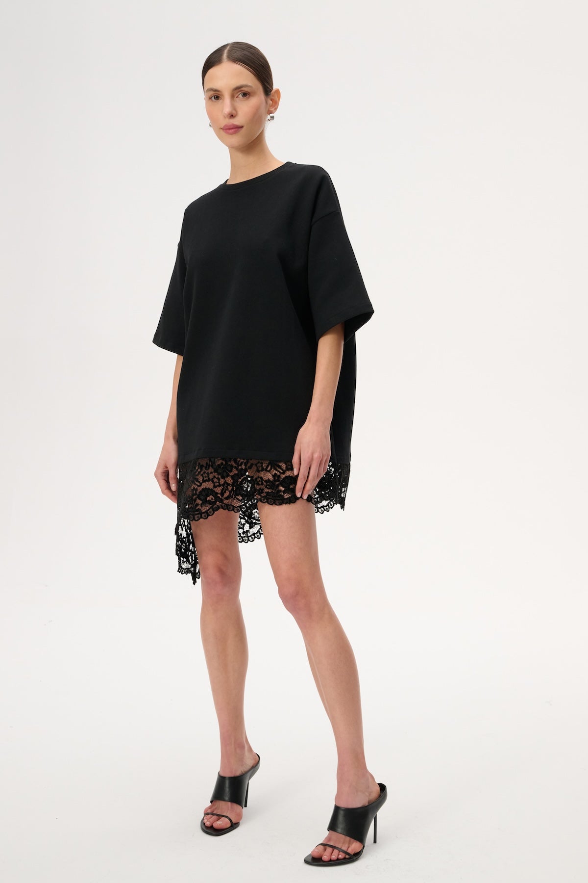 This oversized mini dress is crafted from soft black jersey. It features a round neckline and an asymmetrical lace panel at the hem.