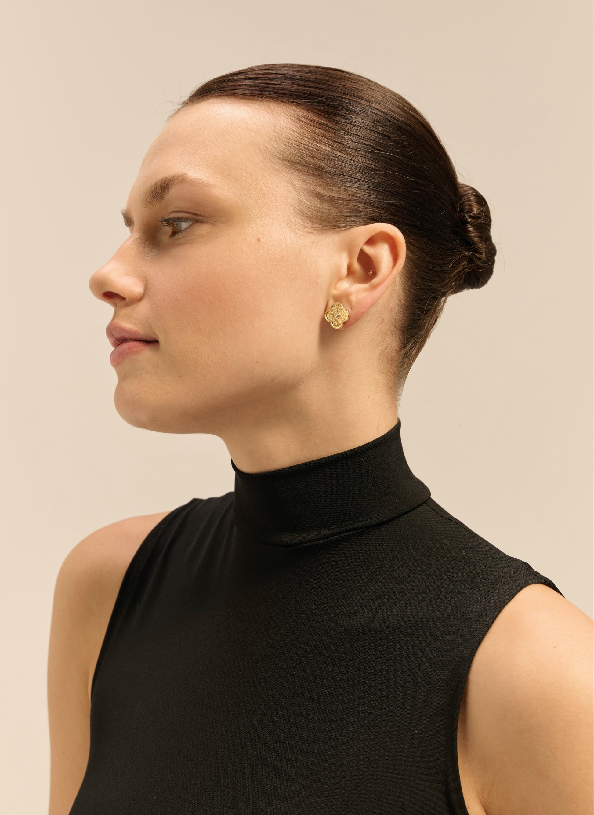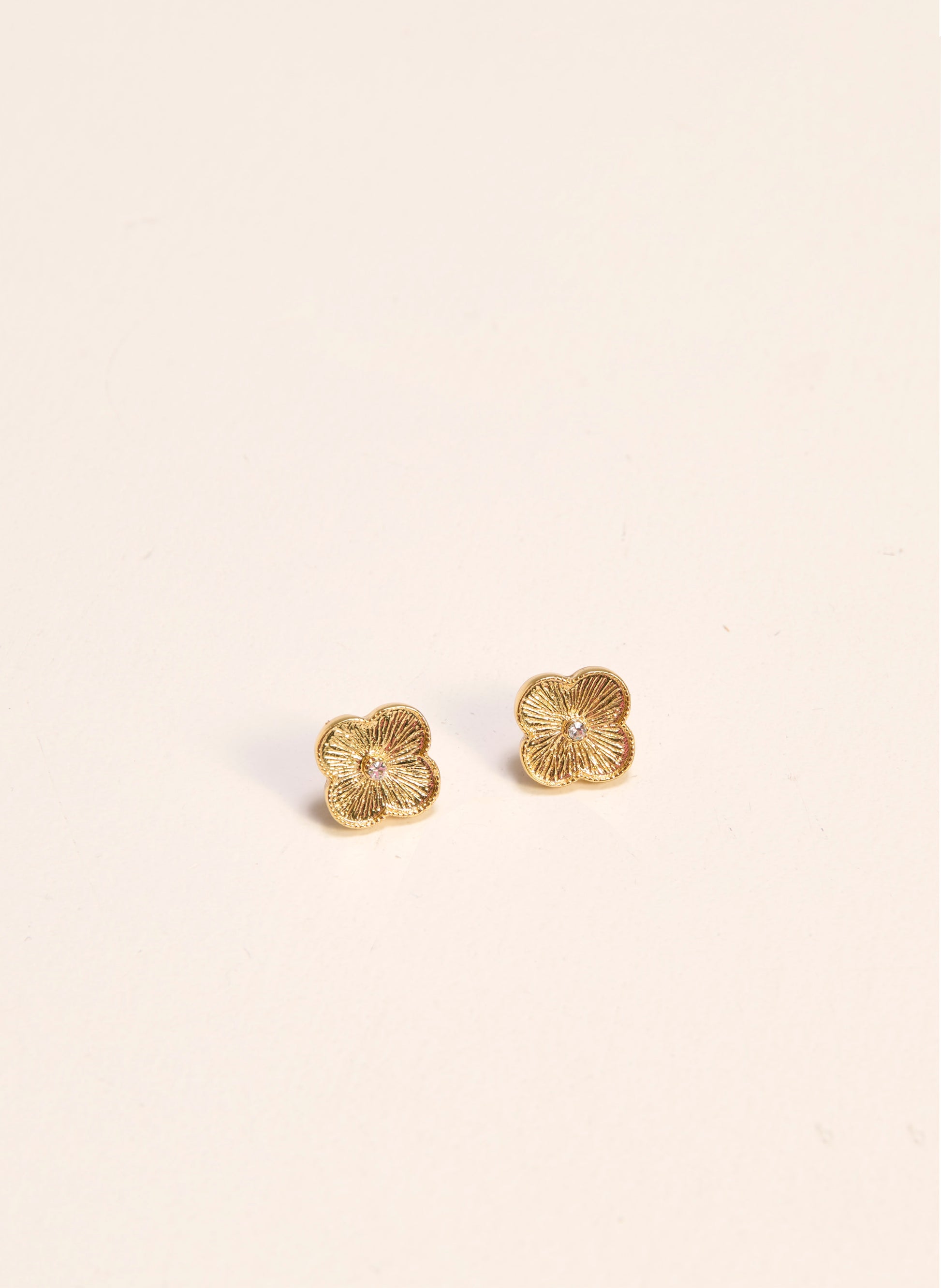 Kolczyki w kształcie kwiatka, wykonane ze stopu jubilerskiego cyny i srebra, pozłacanego 24-karatowym złotem i pokrytego ceramiką, która zabezpiecza przed ścieraniem i zmianą koloru. Zdobiony kryształkiem Preciosa.