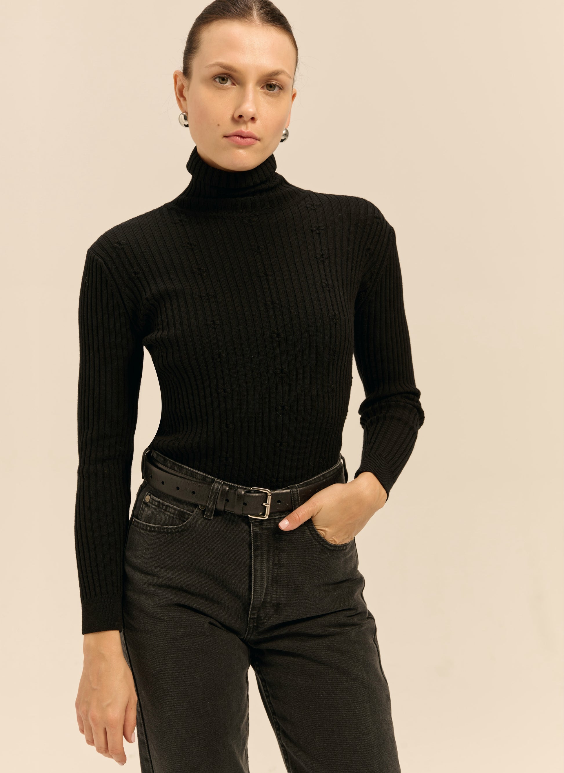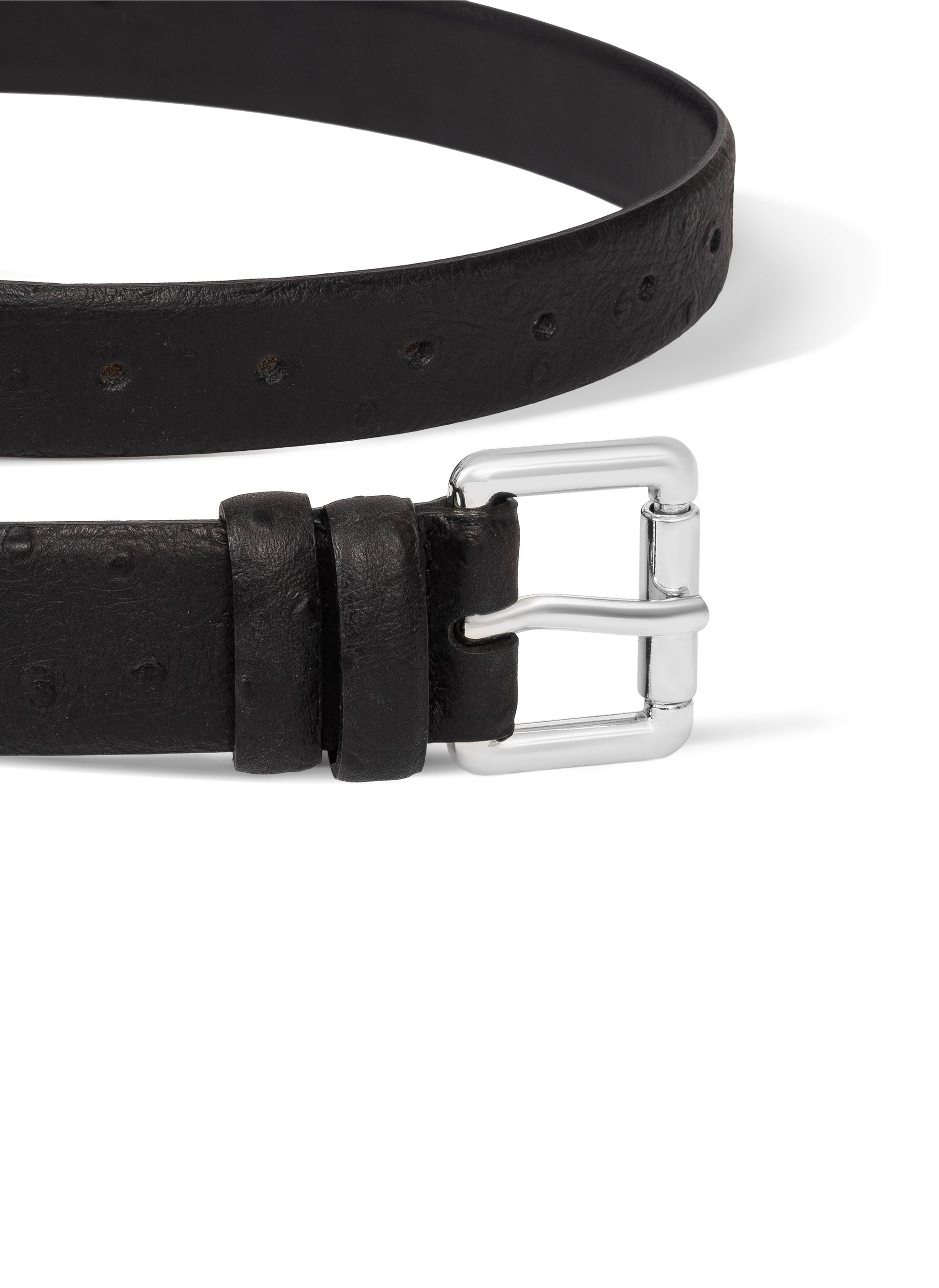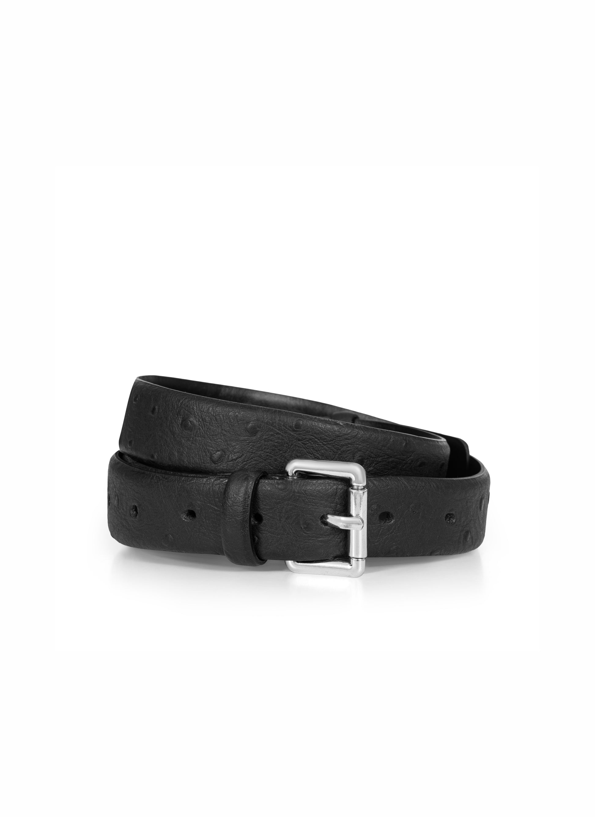 A classic belt made of smooth, genuine leather with an ostrich-skin embossed pattern in black. It features a square silver buckle.