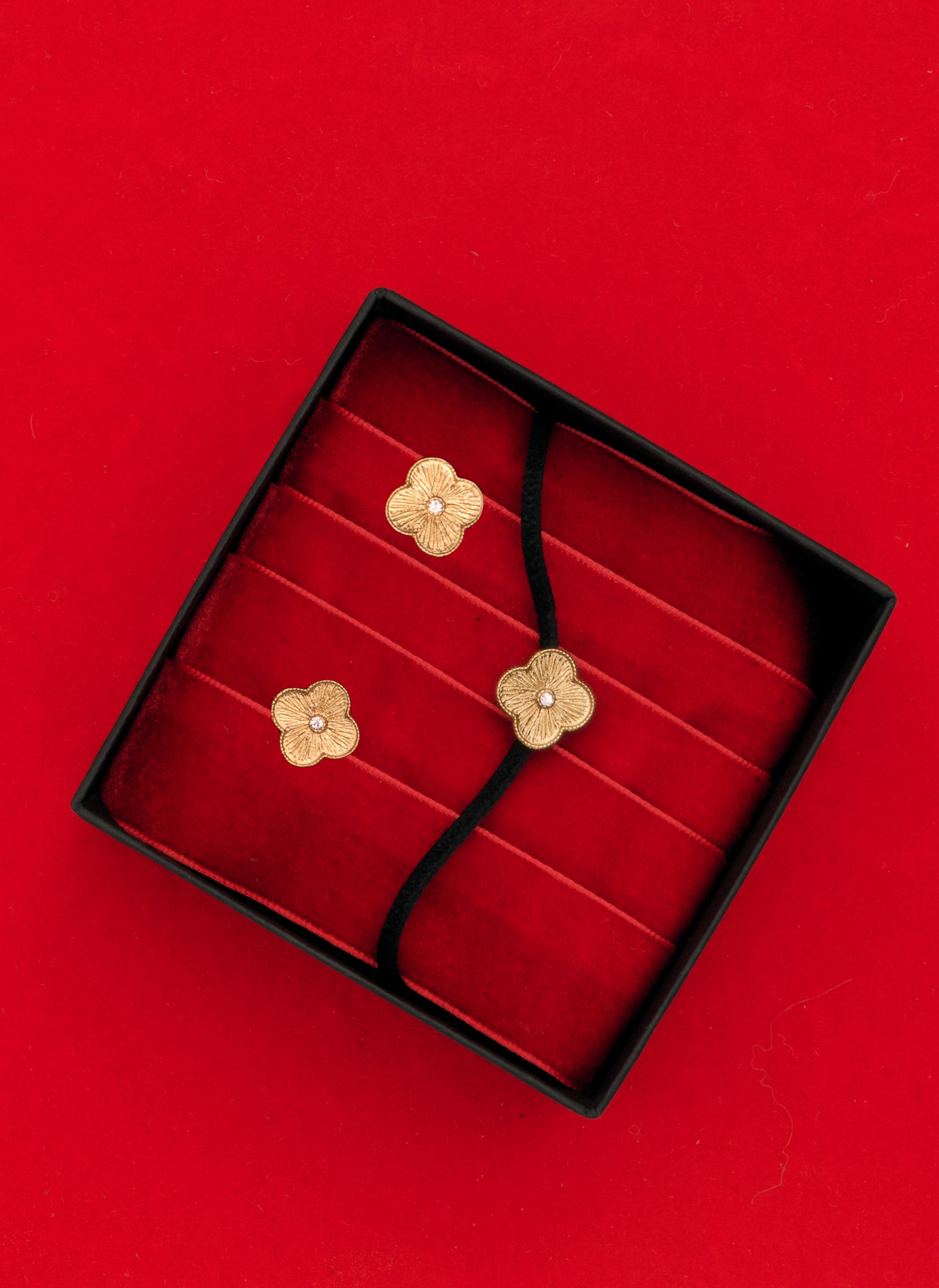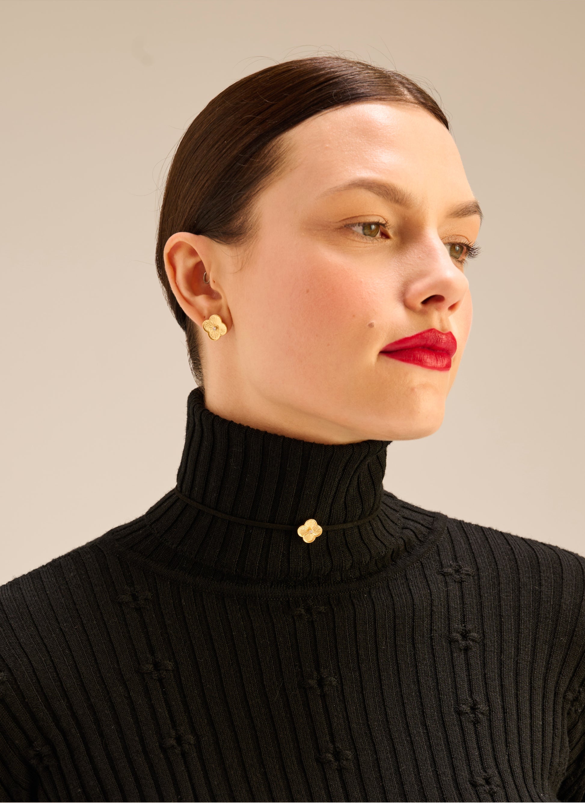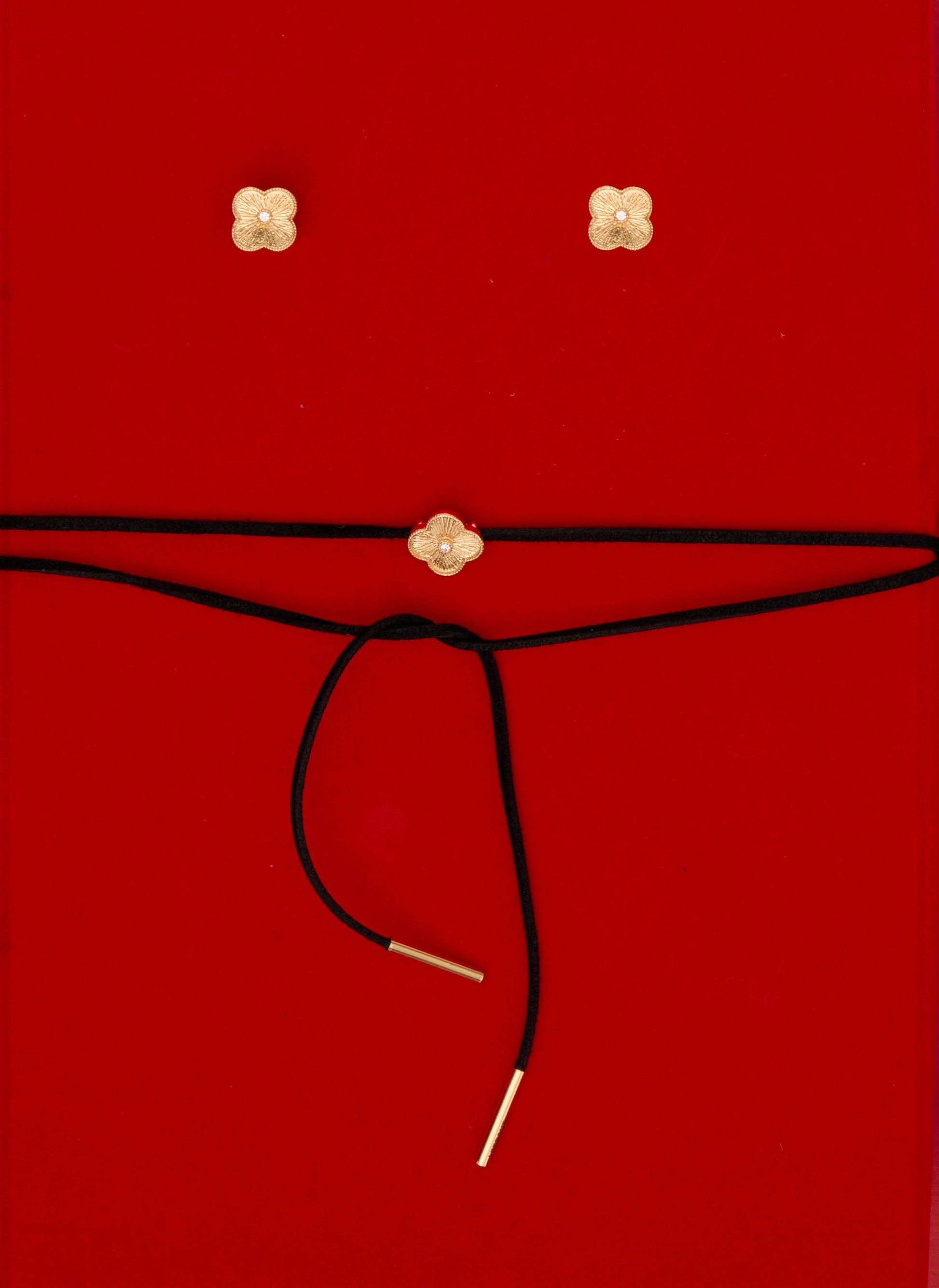 Zestaw składający się z kolczyków Quinn i chokera Lylah, wykonanych ze stopu jubilerskiego cyny i srebra, pozłacanych 24 karatowym złotem.