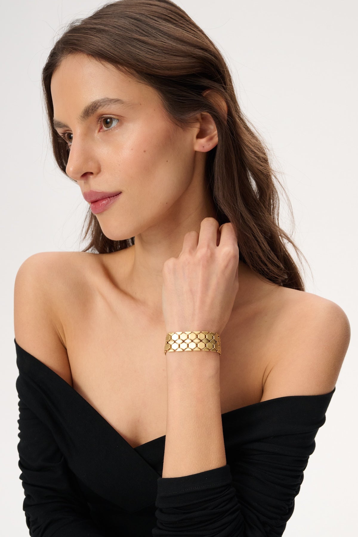 Flat bracelet made of fragments of gold-plated brass, arranged in a geometric pattern.