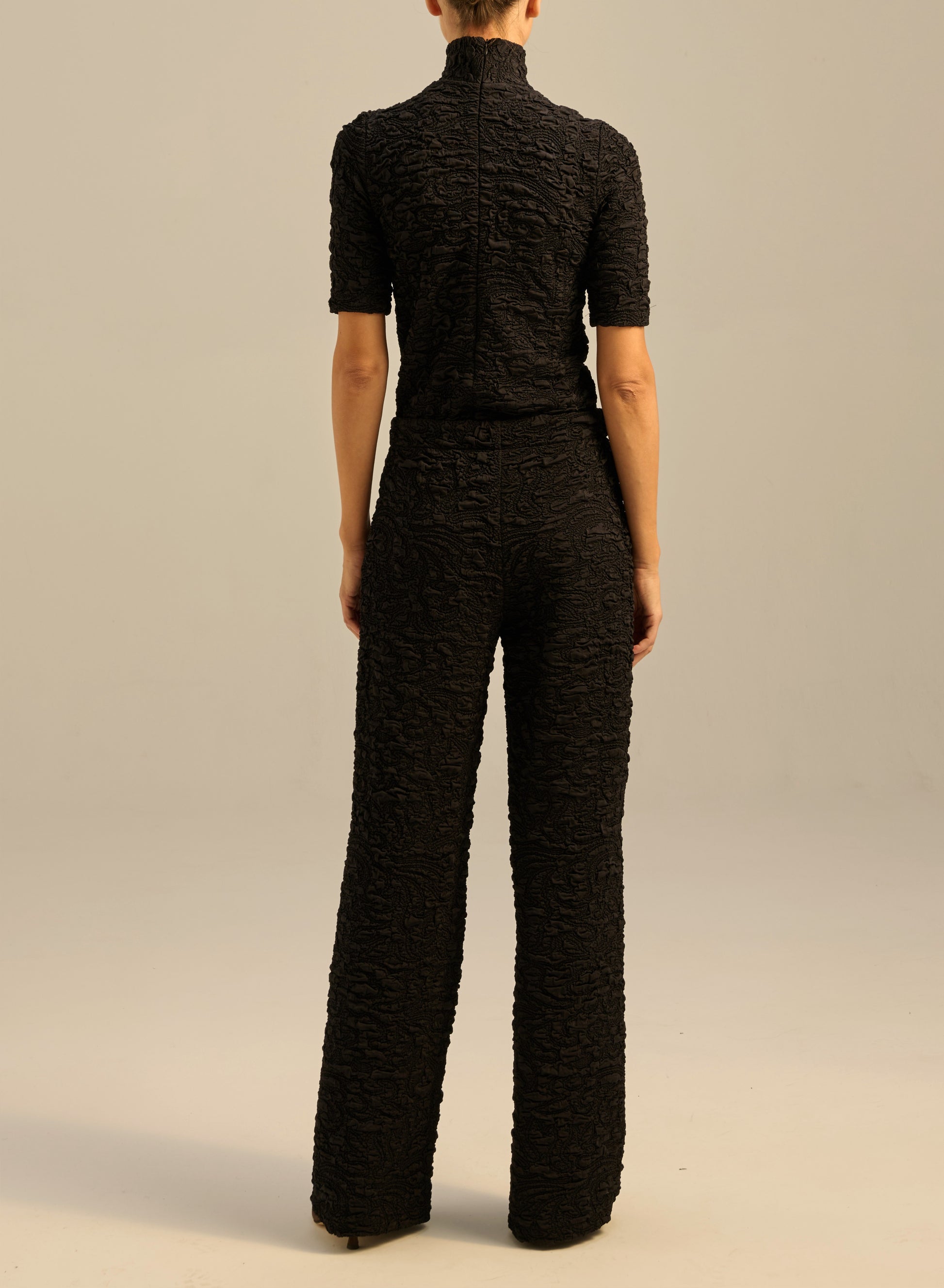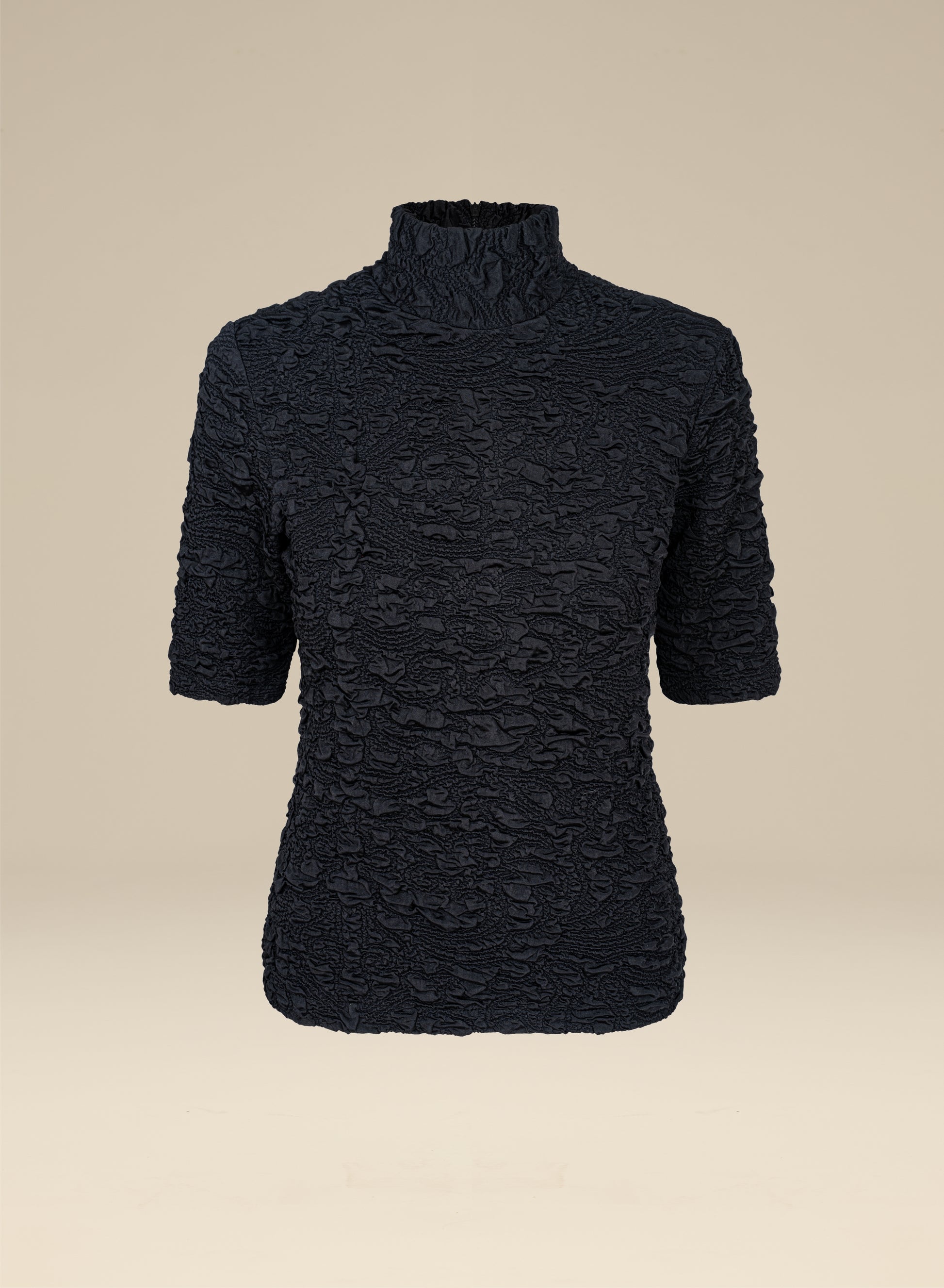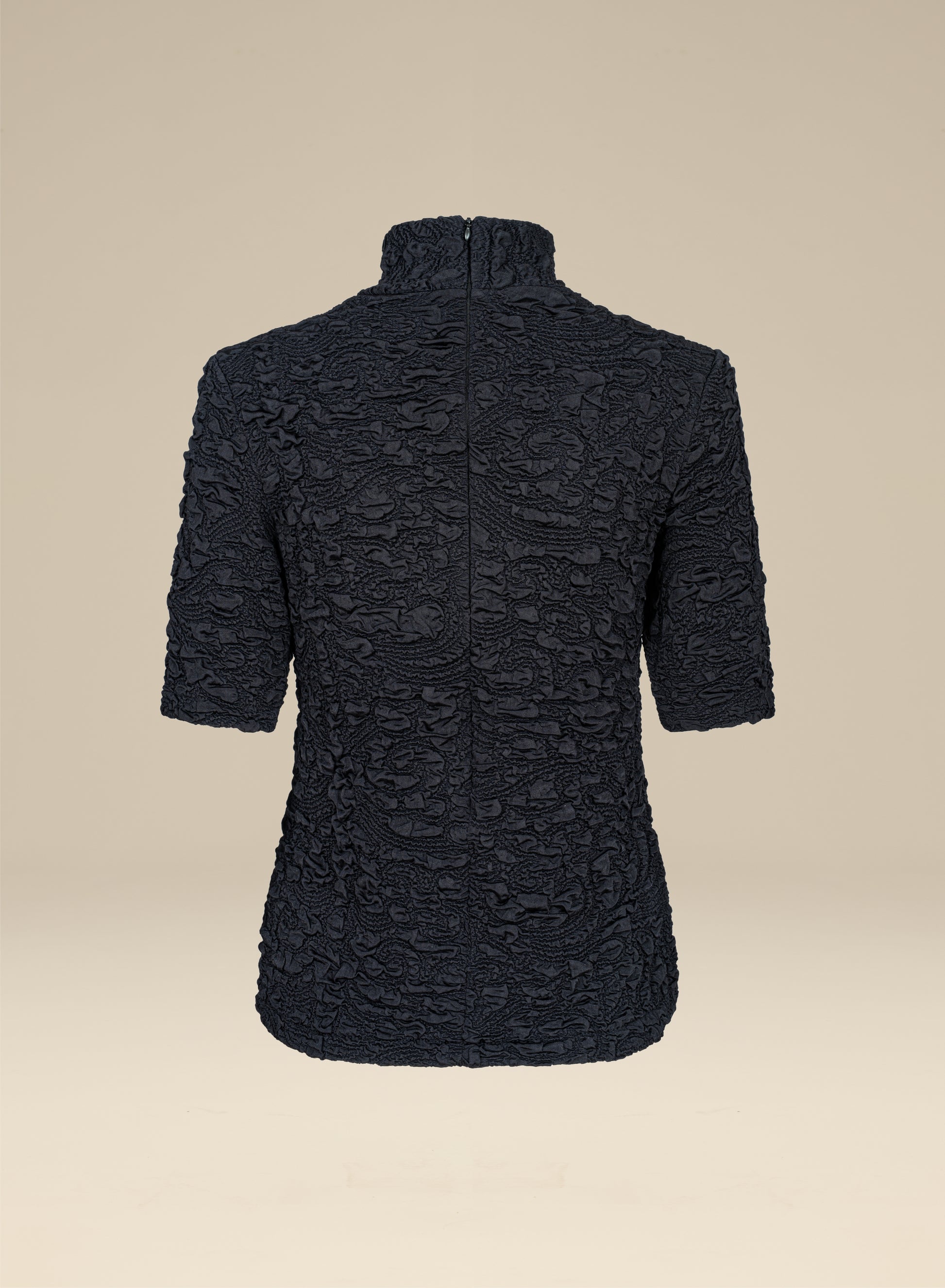 Fitted turtleneck made from a stretchy fabric in deep black with a bubble texture. It has a back fastening with a short zip and 3/4 sleeves.