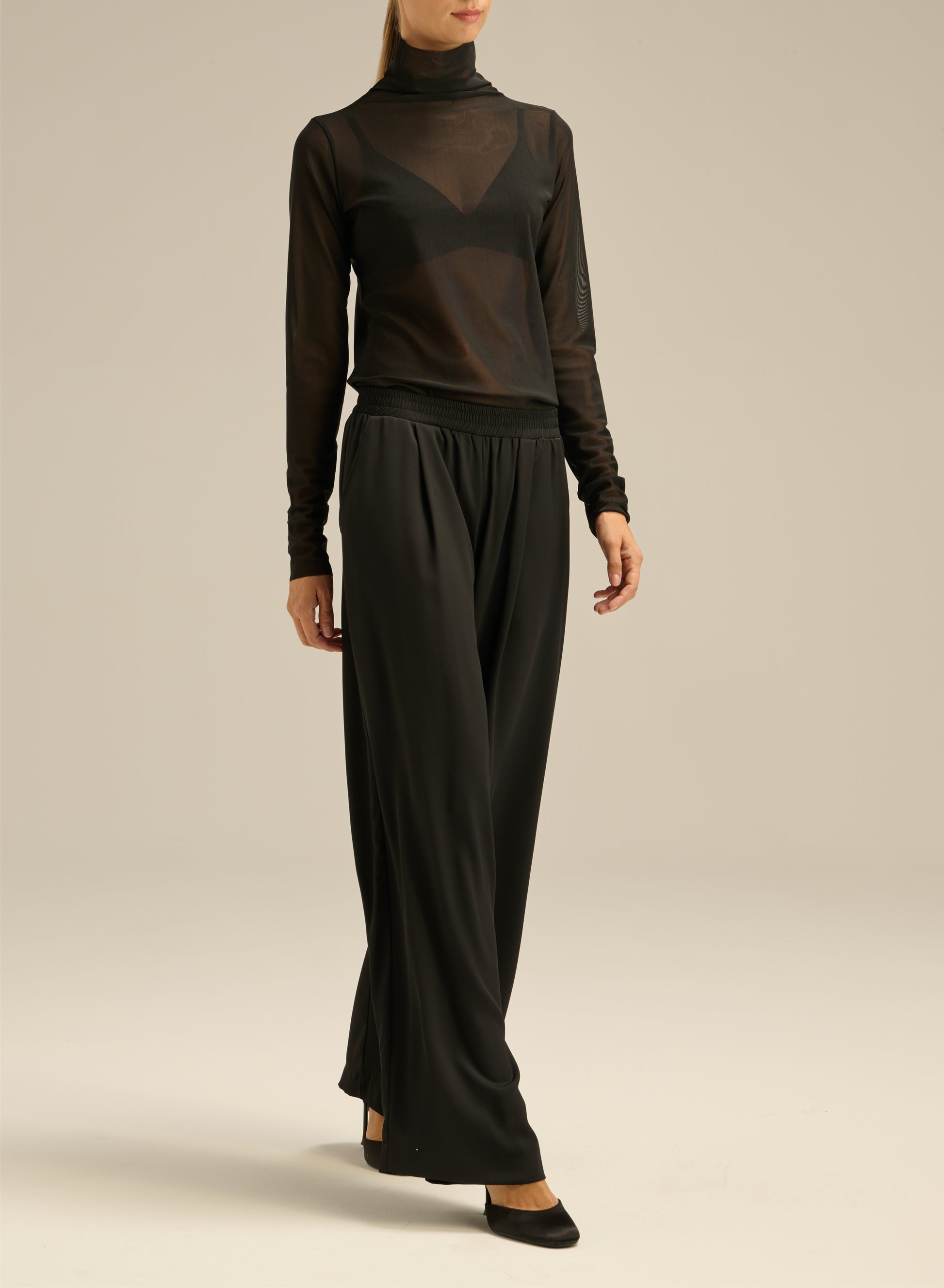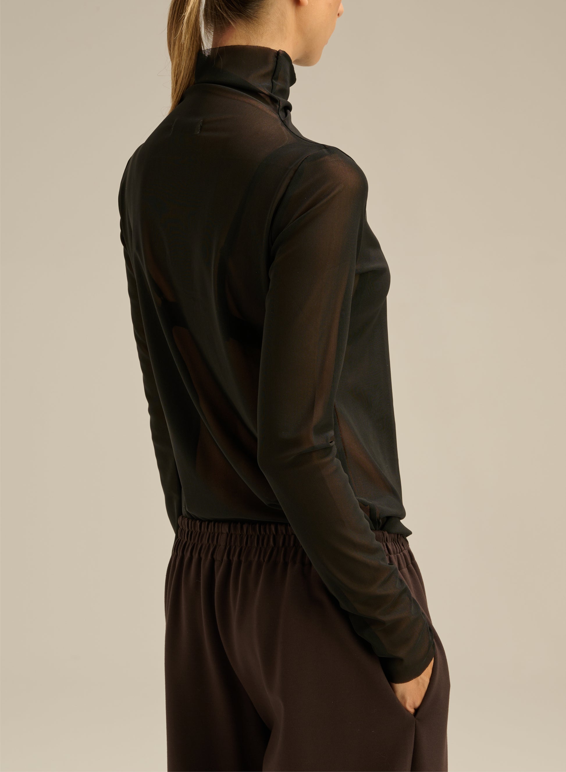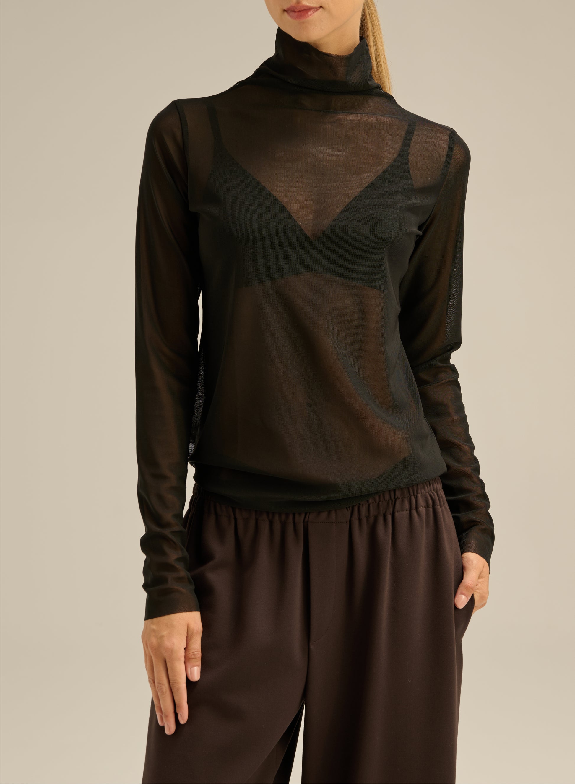 A straight-cut turtleneck made of lightweight mesh fabric. It has a round neckline and long sleeves.