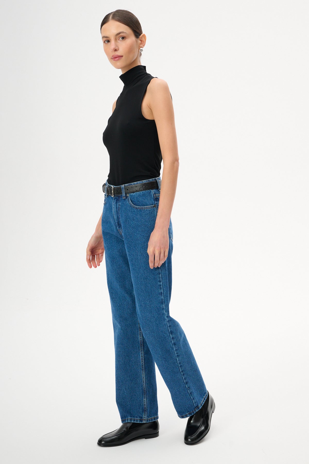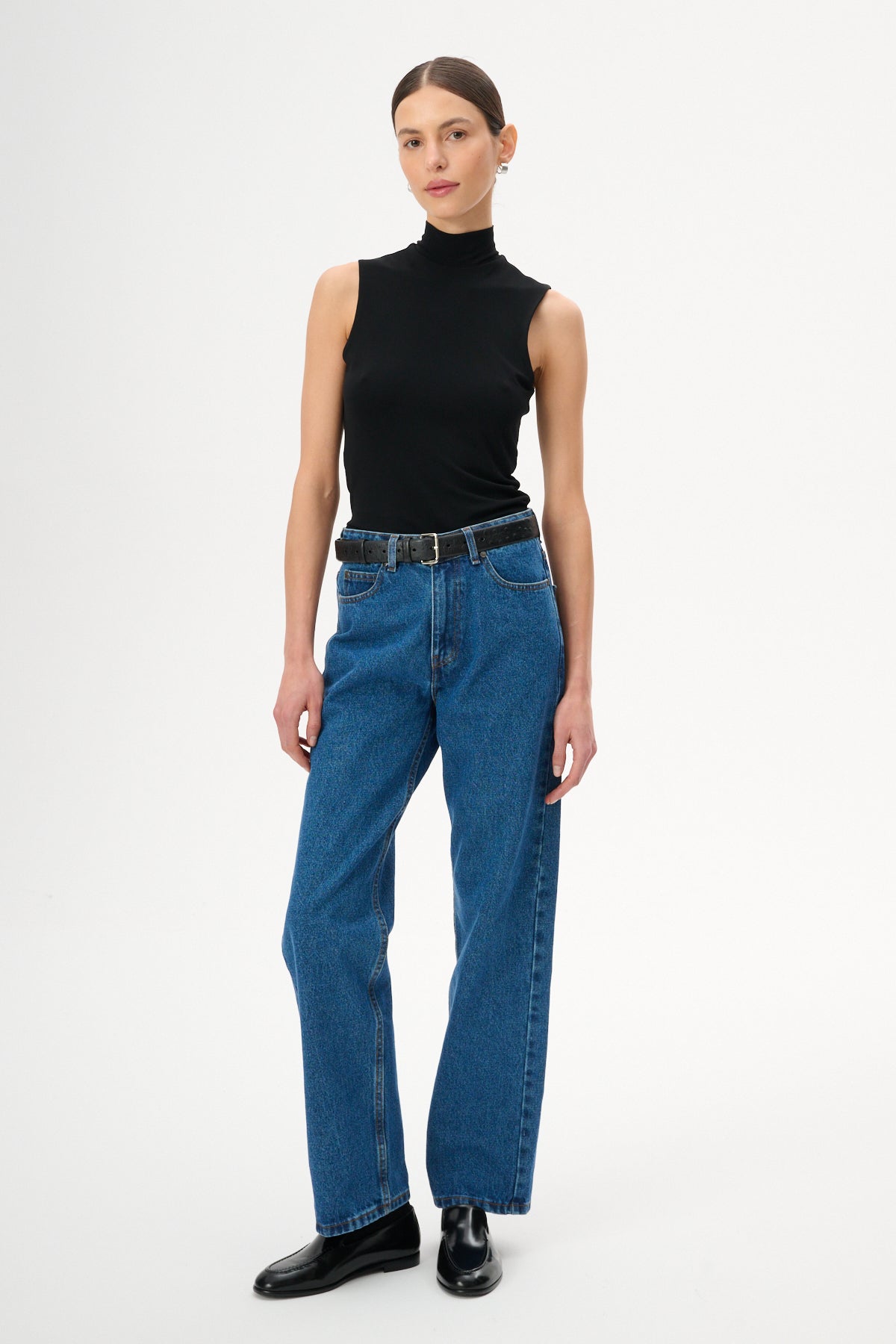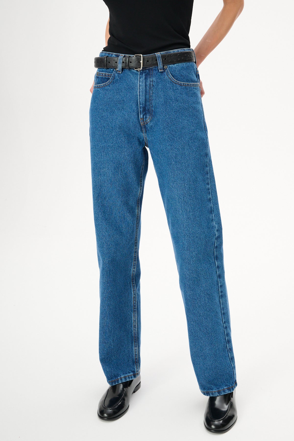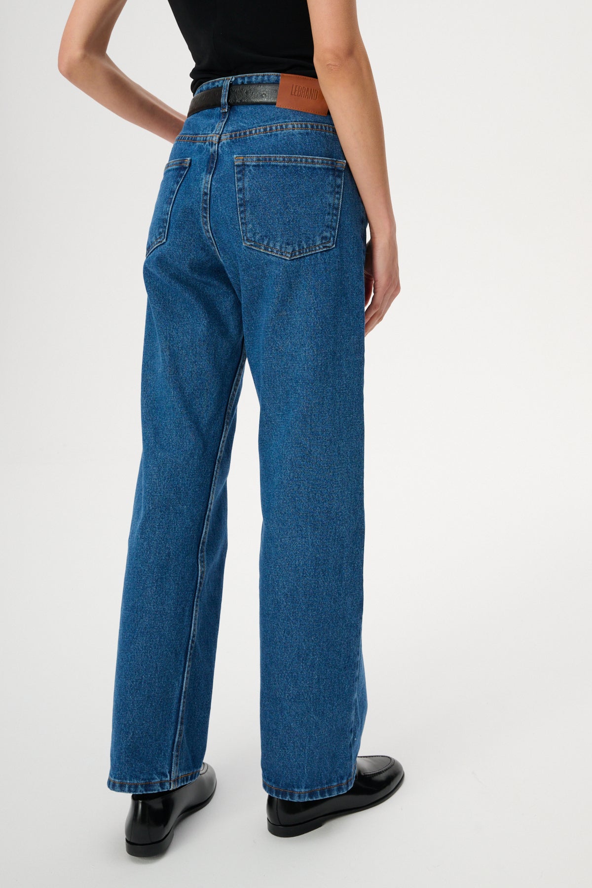 Jeansy o luźnym fasonie z wysokim stanem i szeroką nogawką o długości sięgającej za kostki. Wykonane w 100% z nieelastycznej bawełny w kolorze niebieskim. Posiadają zapięcie na guzik i suwak, skórzaną naszywkę z wytłoczonym logo z tyłu oraz pięć kieszeni.