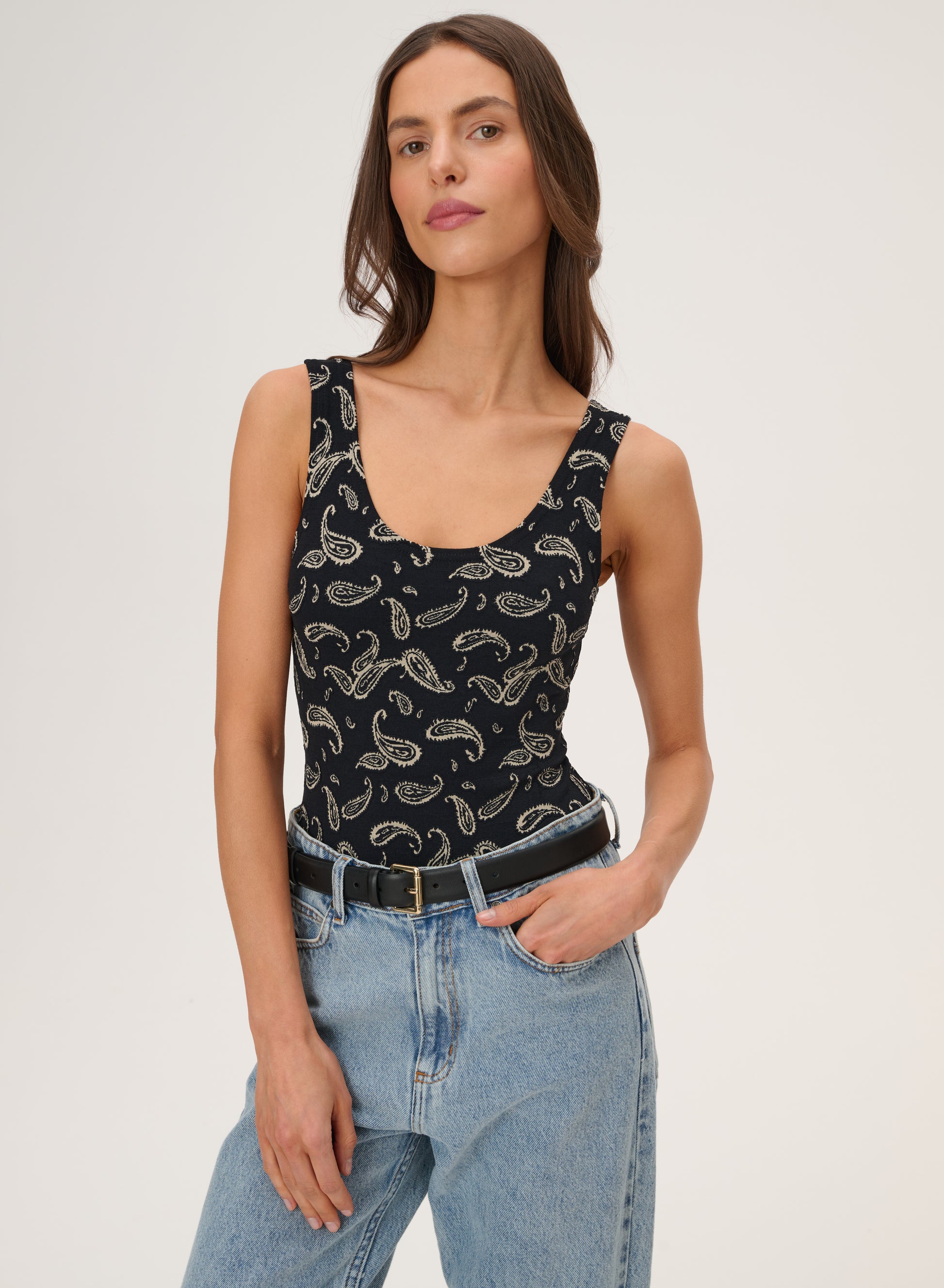 This one-piece swimsuit is made of black, stretchy fabric with an embroidered, ecru bandana-inspired print. It features a fitted cut and a non-wired bra.