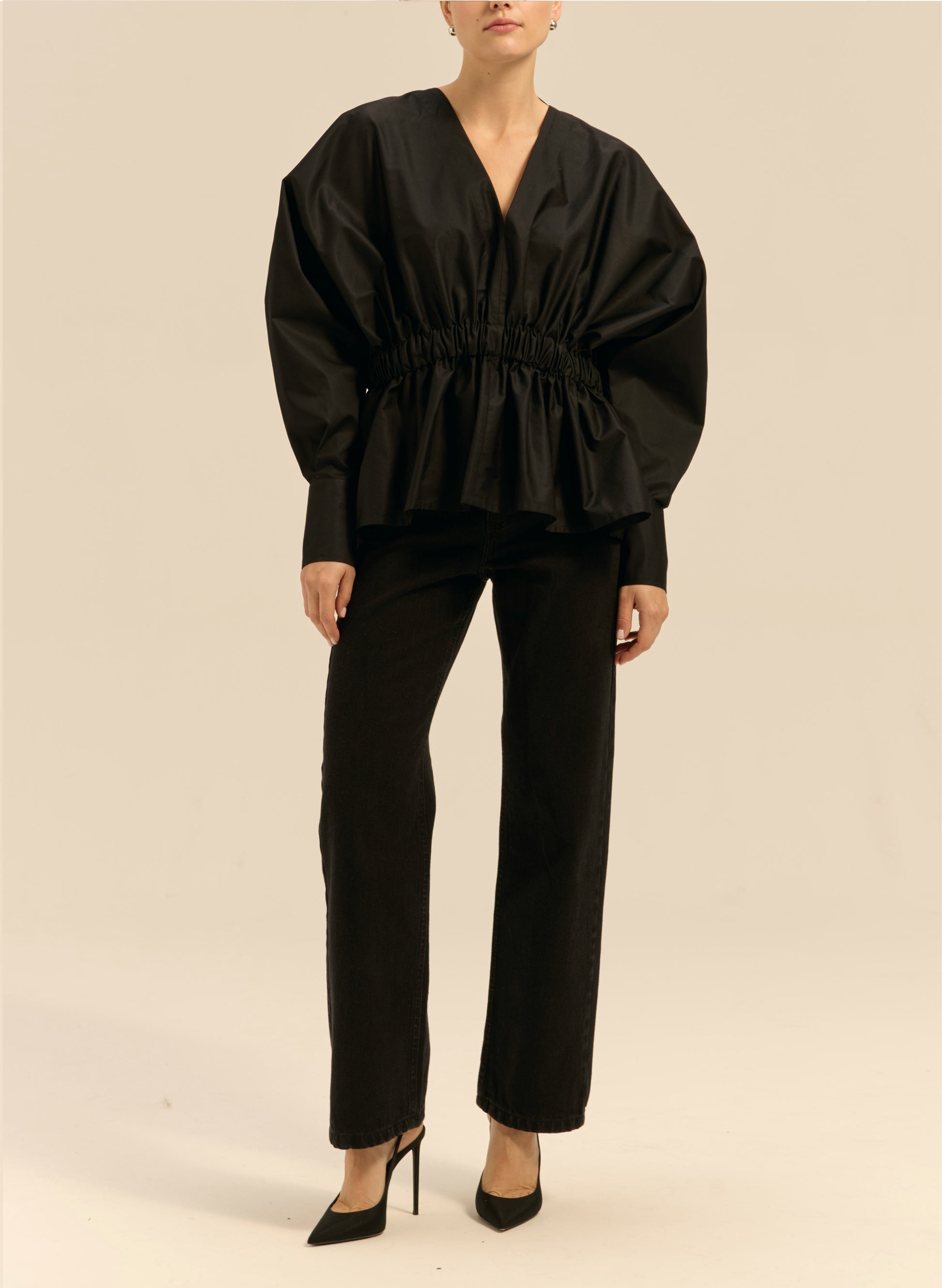 Luźna koszula o kroju oversize wykonana z lekkiej bawełny w kolorze czarnym. Posiada gumę w talii, długie mankiety zapinane na 3 guziki oraz dekolt w serek.