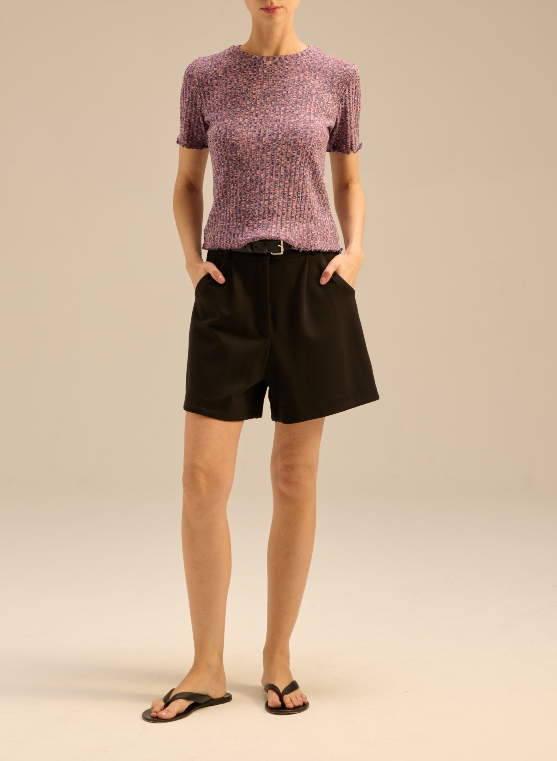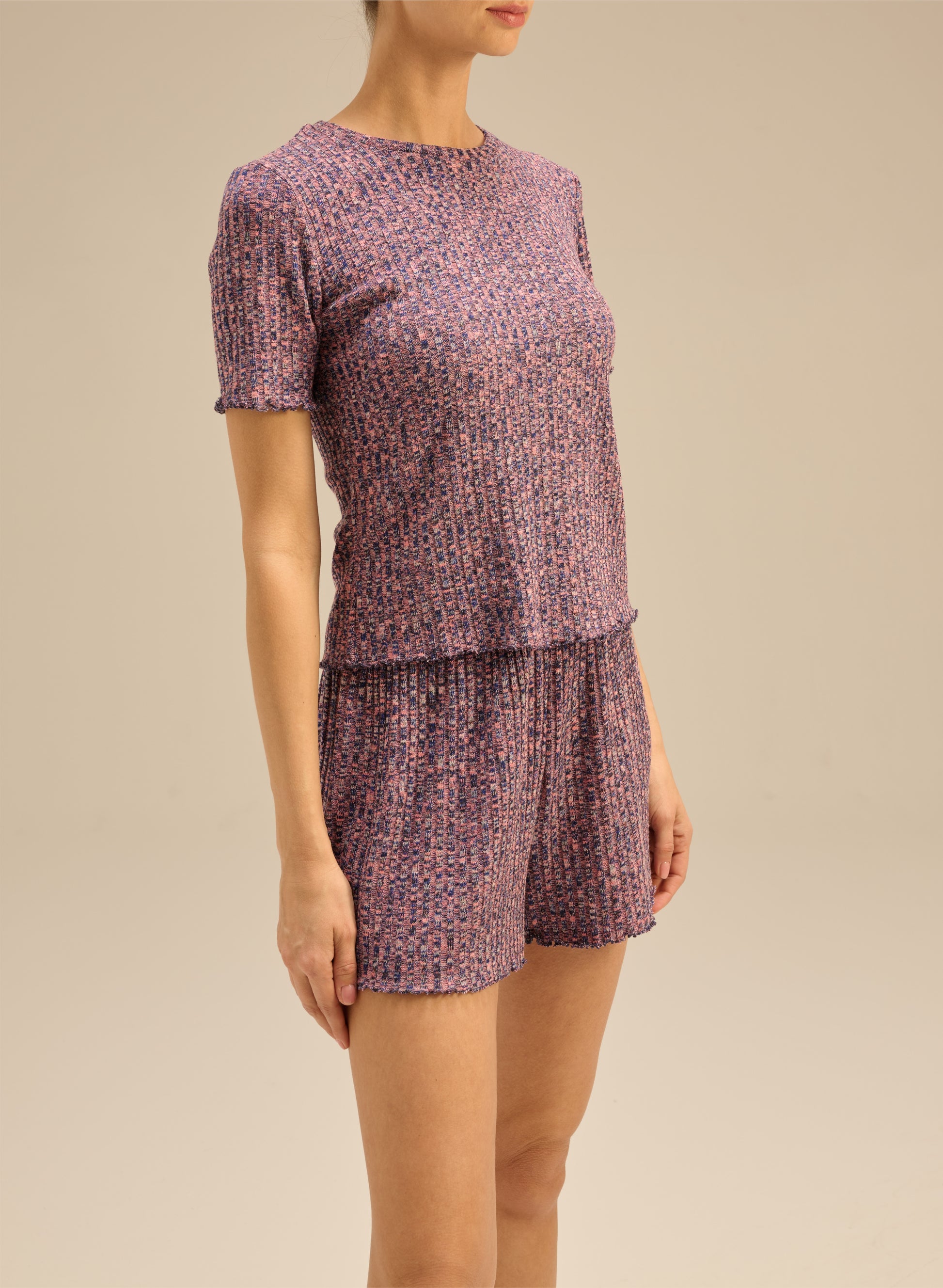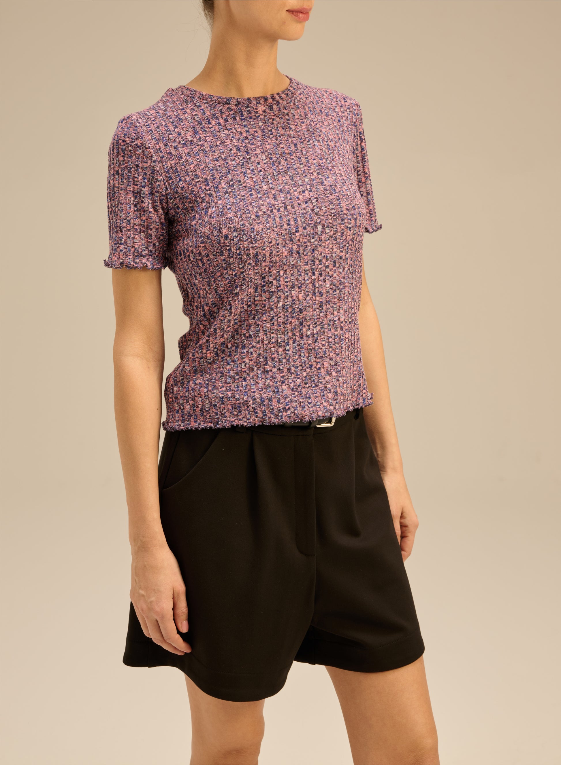 Koszulka o luźnym kroju wykonana z miękkiej, elastycznej dzianiny w strukturze. Posiada melanżowe połączenie różu, granatu oraz szarości, krótkie rękawy i okrągły dekolt.