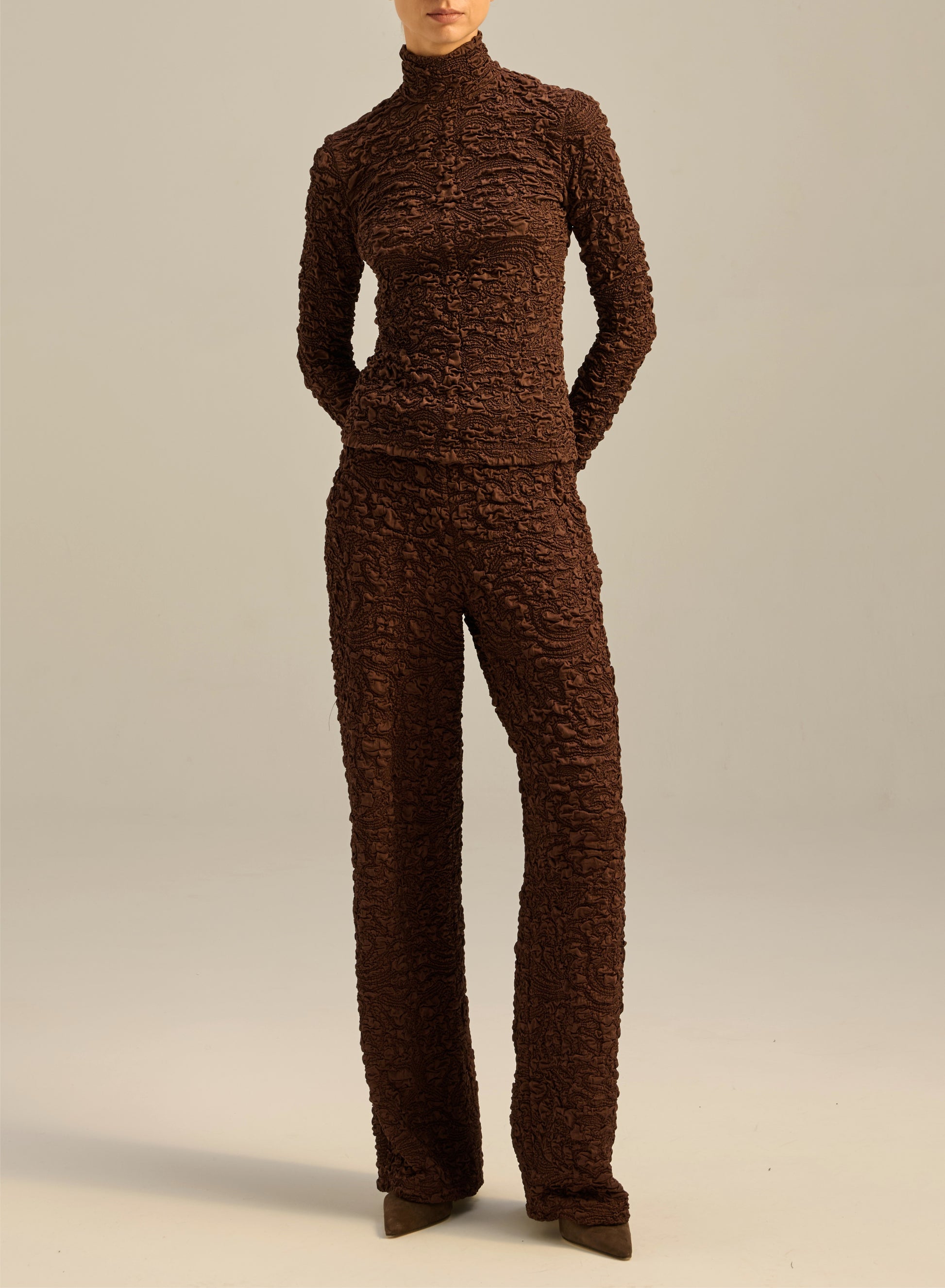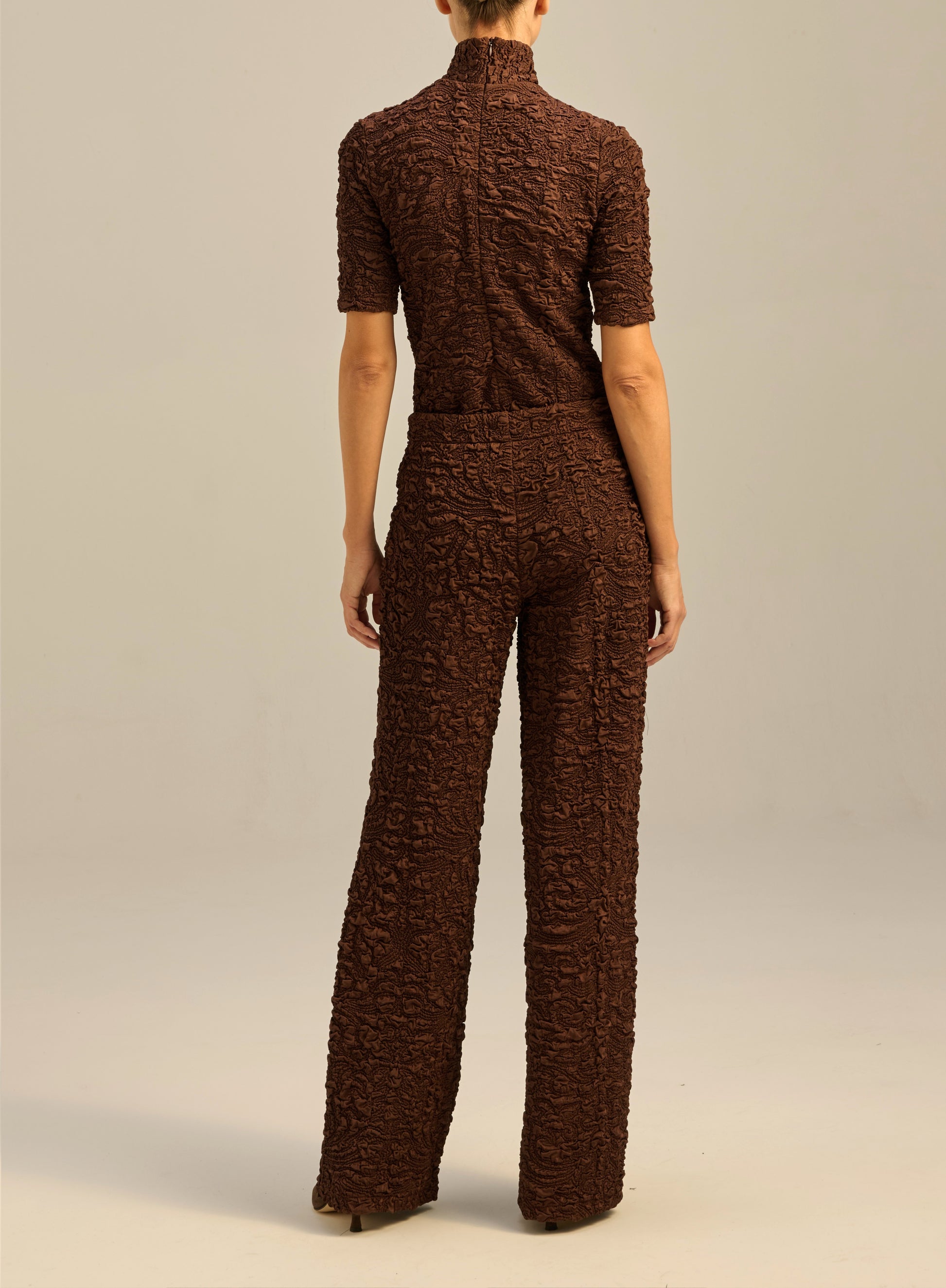 Light pants made of elastic material in brown color with bubble texture. They have straight, long legs and a high waist.