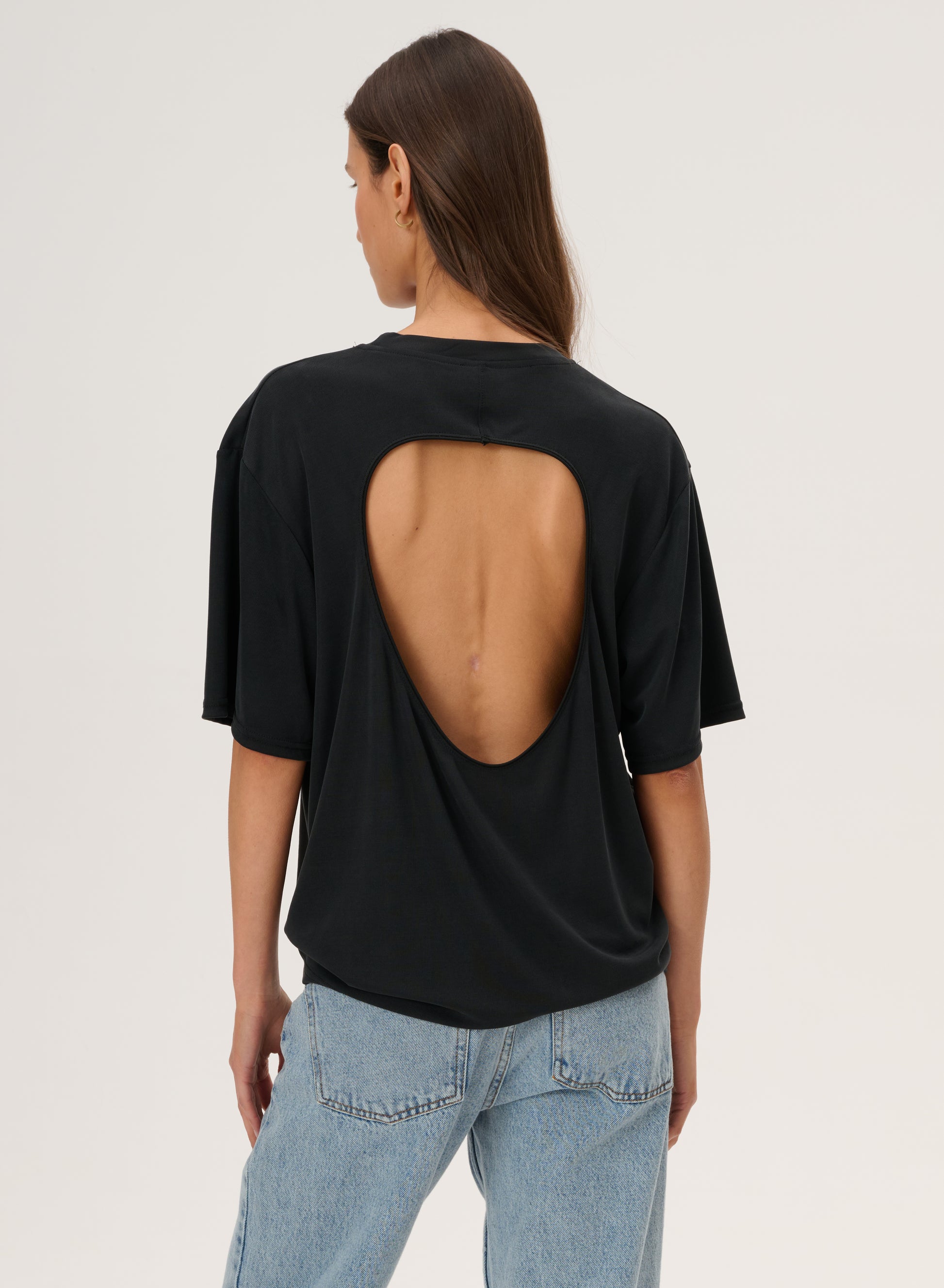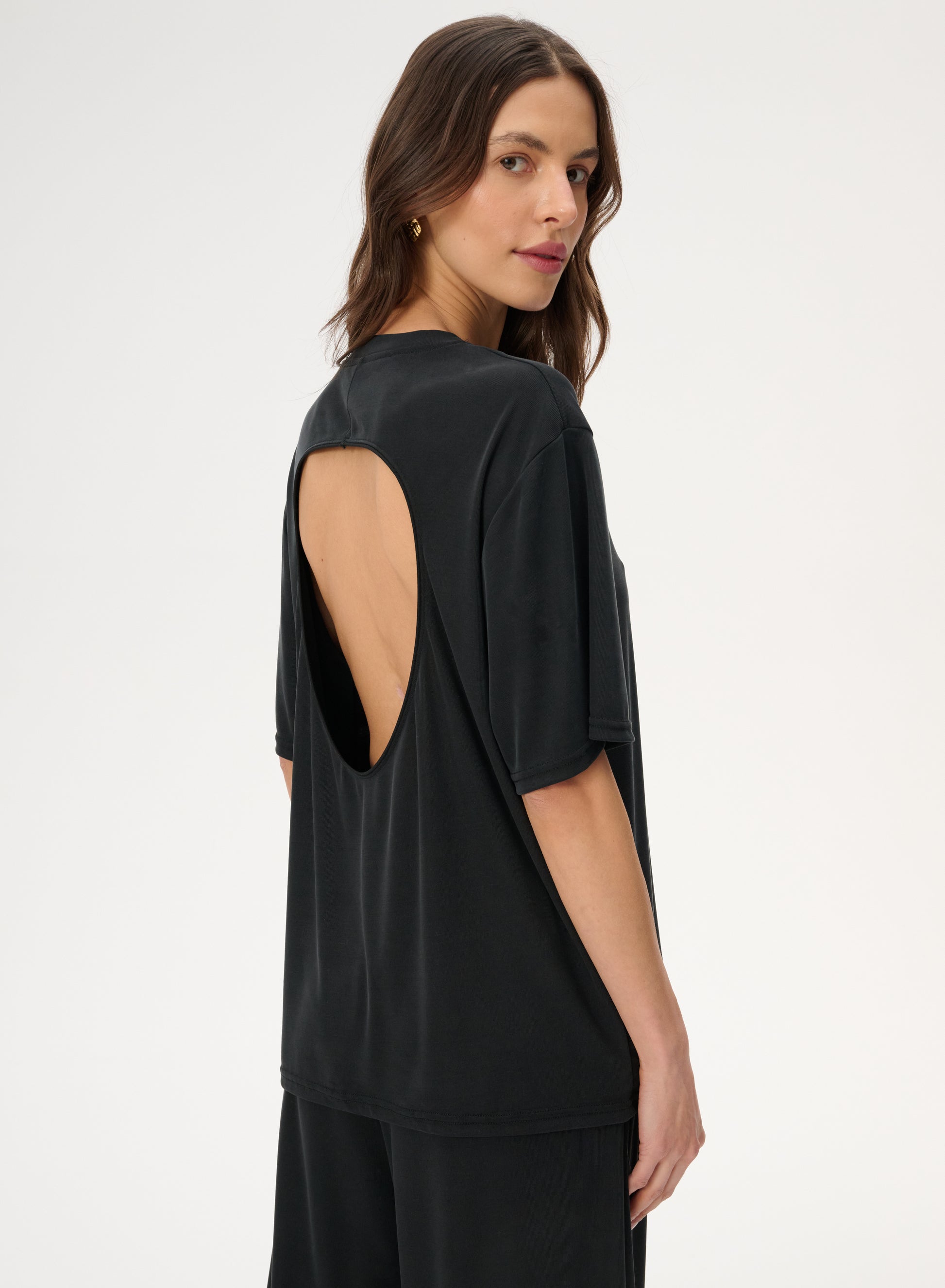 T-shirt with a back cut-out, made of a very pleasant and delicate viscose fabric. Loose fit with a round neckline.