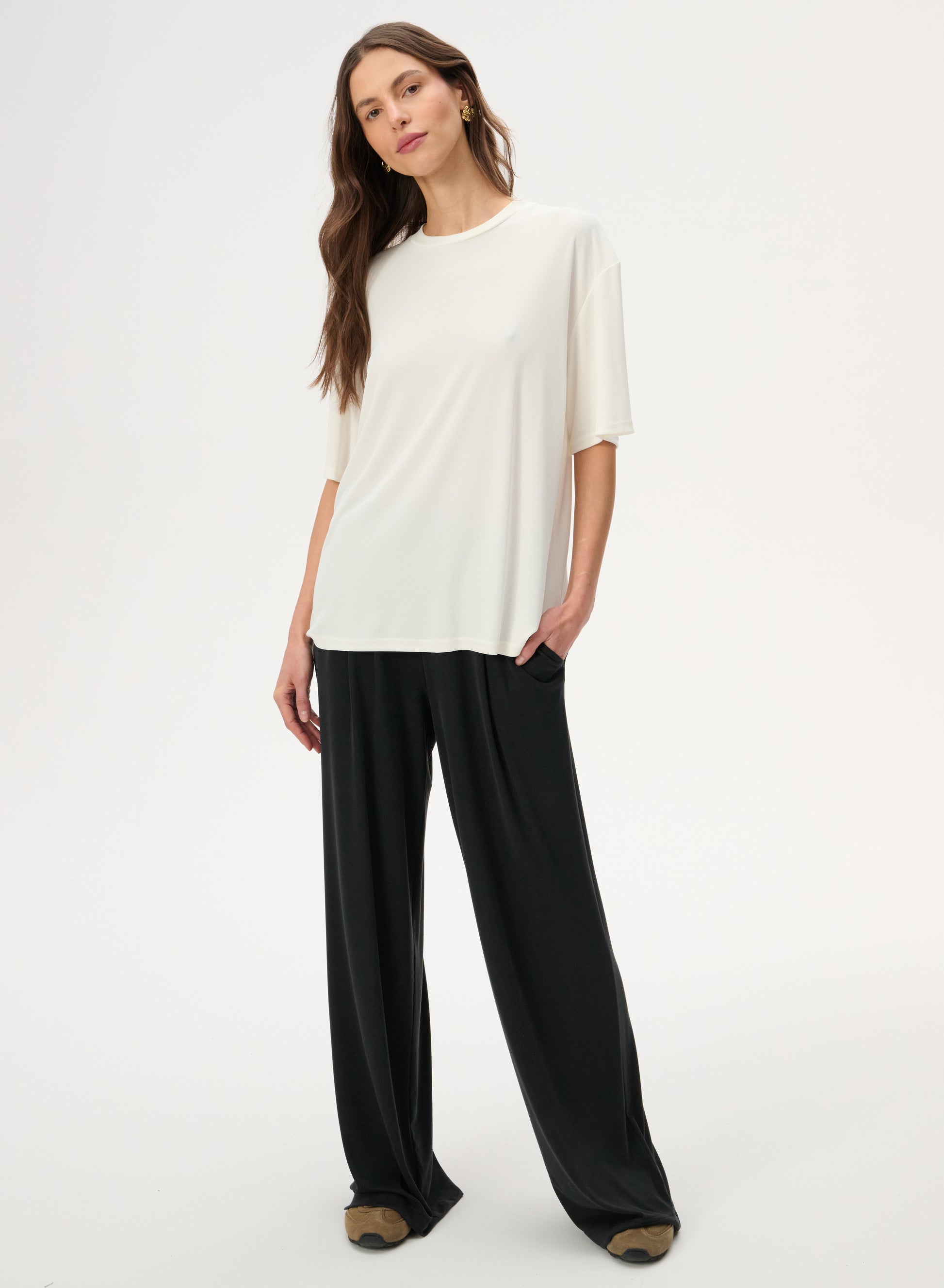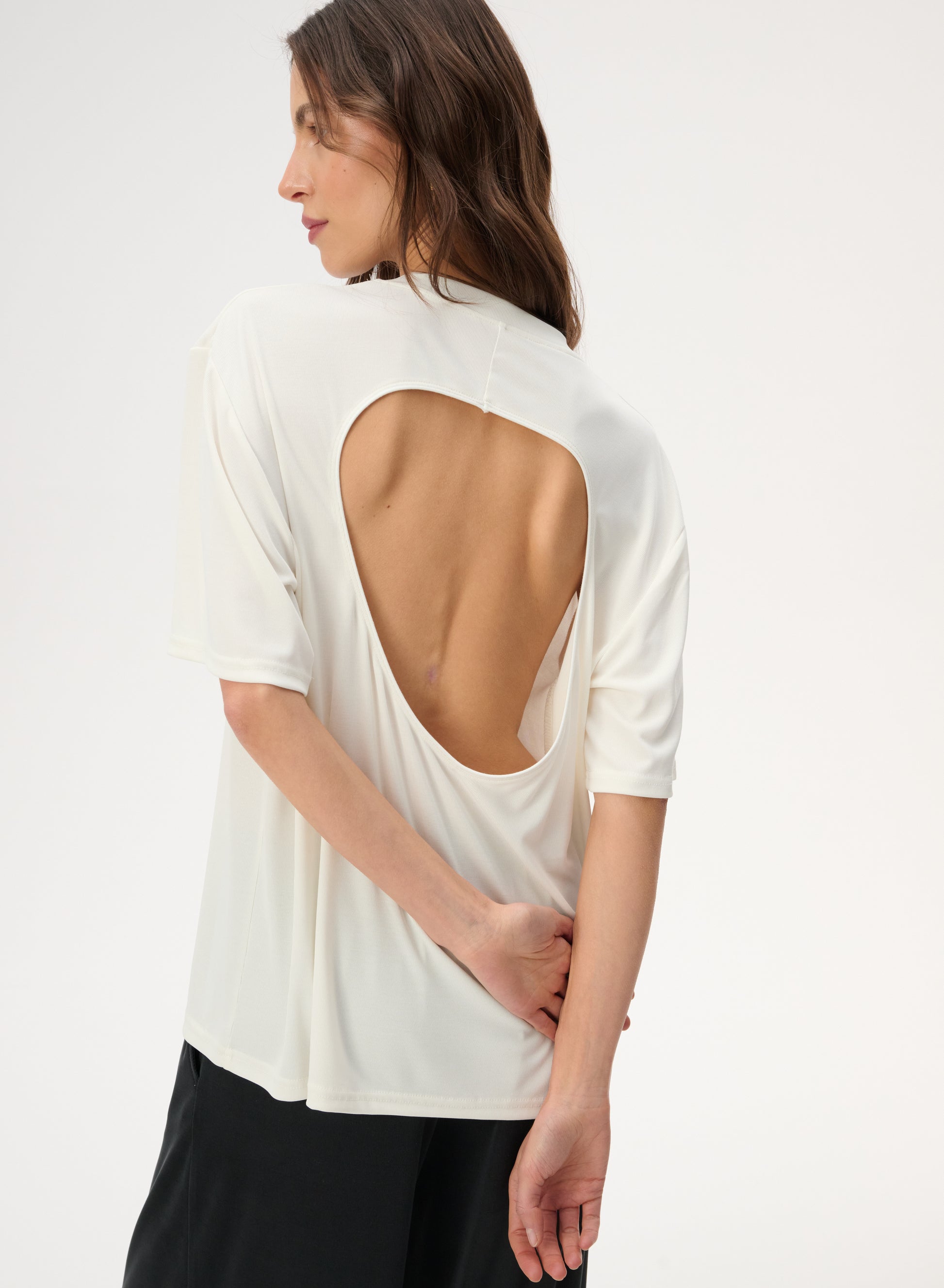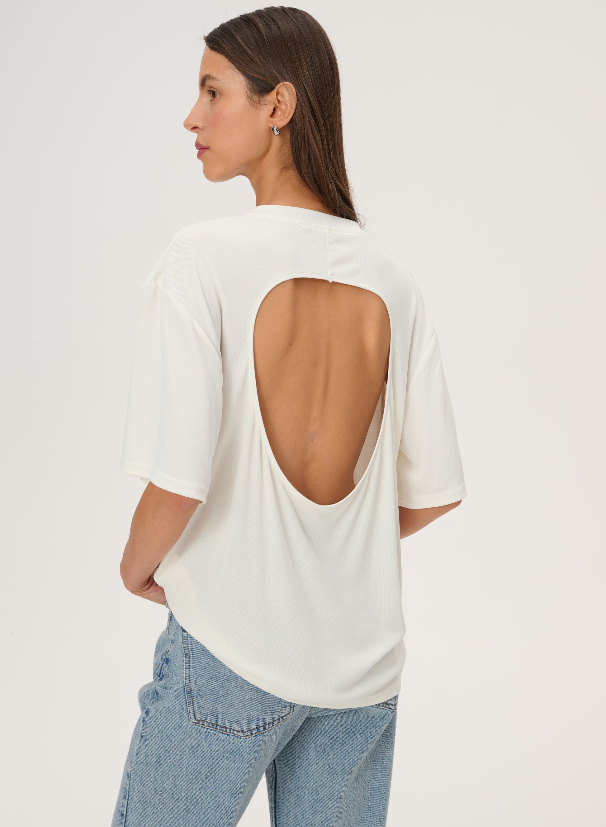 T-shirt with a cut-out back, made of very pleasant and delicate viscose. Loose fit with a round neckline.