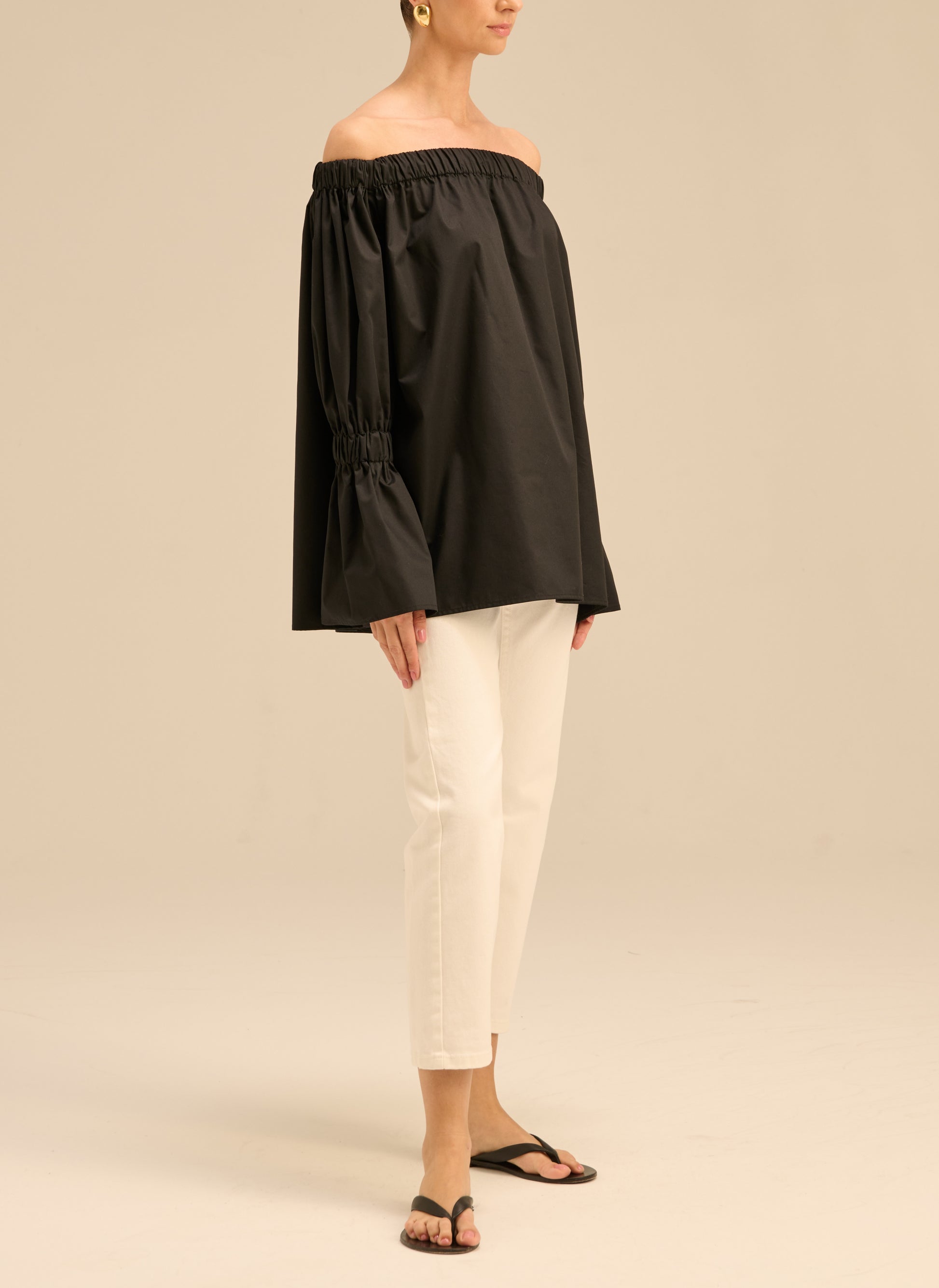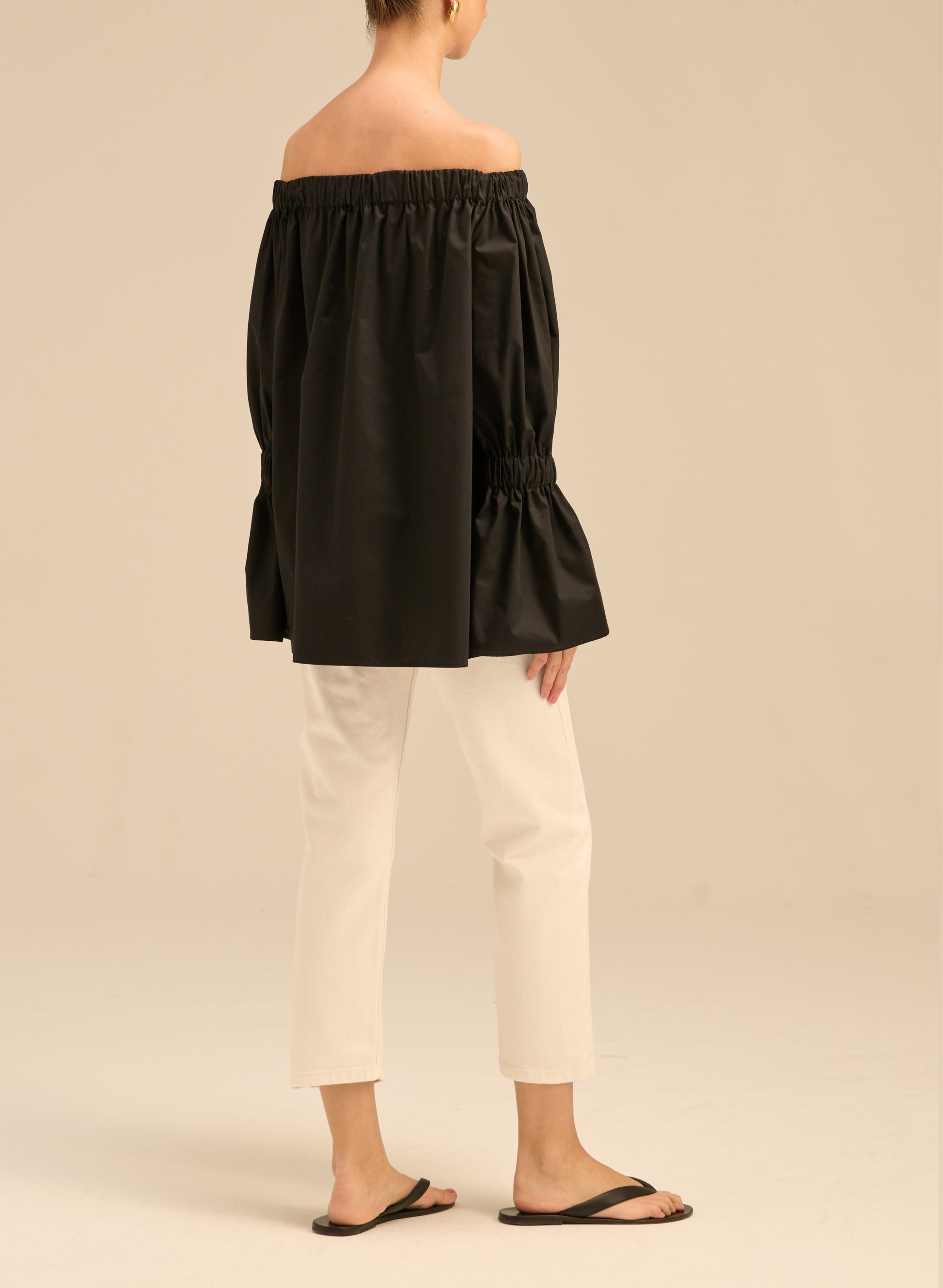 A Spanish-style top with an A-line cut, made of lightweight black fabric. It features an elasticated neckline and long, flared sleeves.