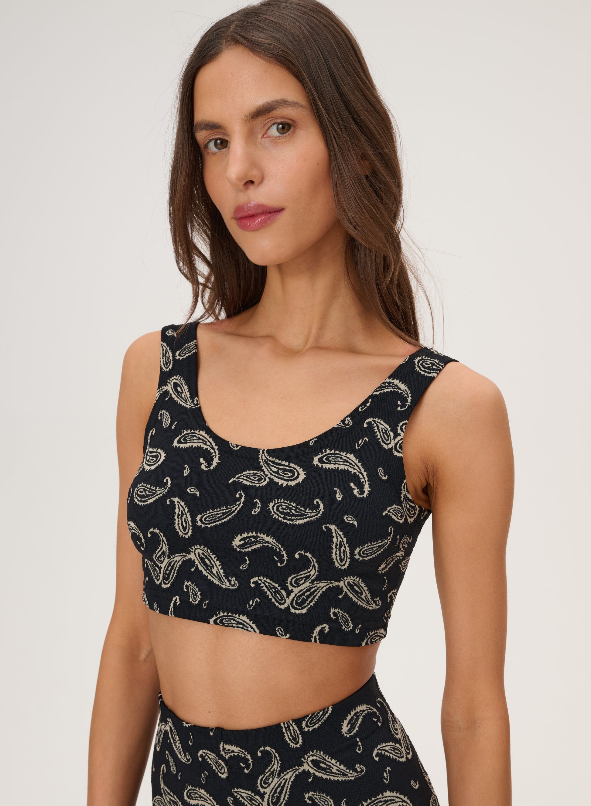 This black sports bra bikini top is made of stretchy fabric with an embroidered, ecru bandana-inspired print. It features a fitted cut, elasticated bust support, and a non-wired bra.