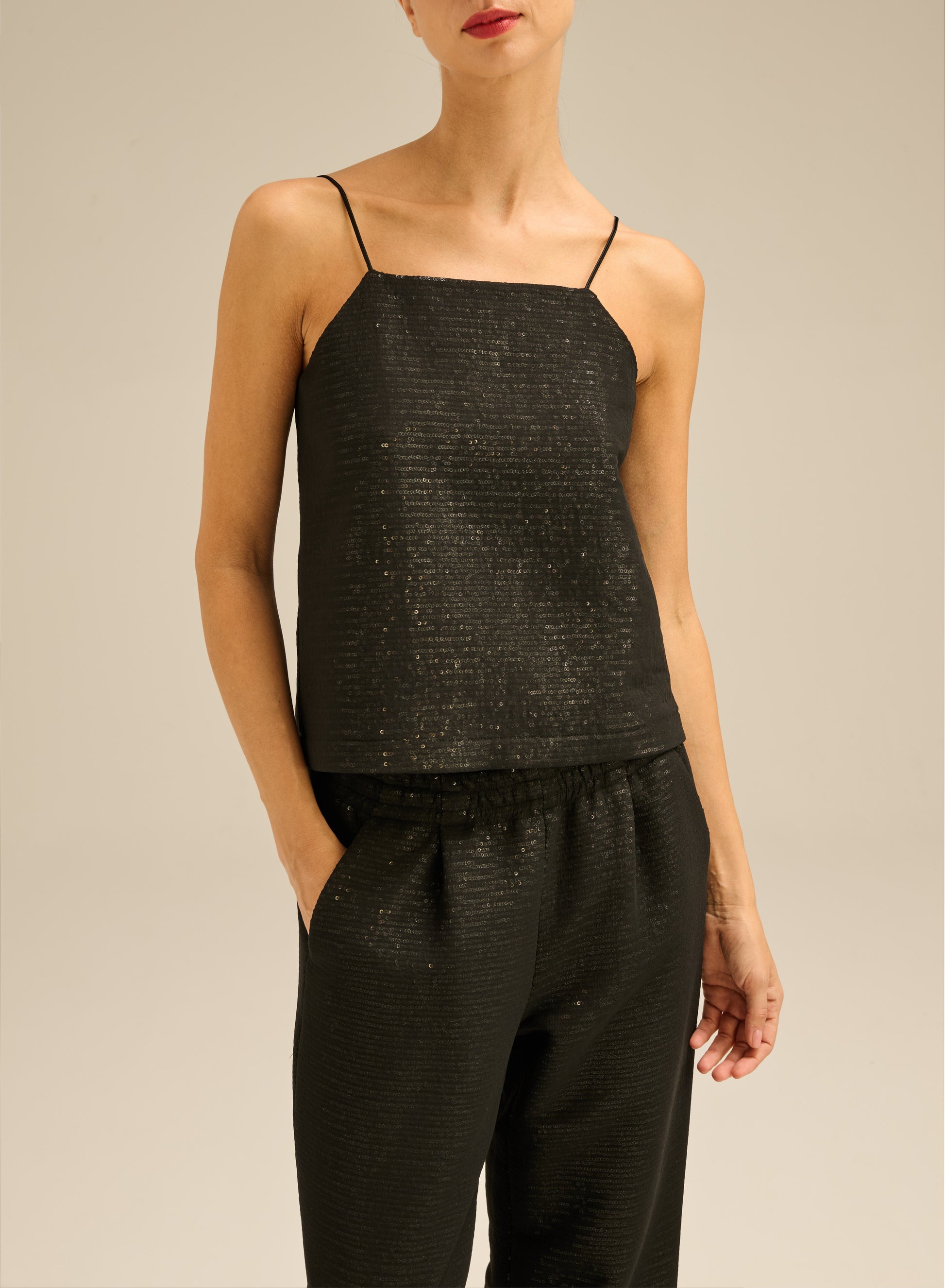 Light top with a simple form, on thin straps. Made of shiny fabric in black.