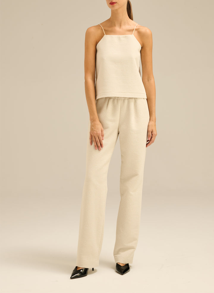 Light top with a simple form, on thin straps. Made of shiny ecru fabric.