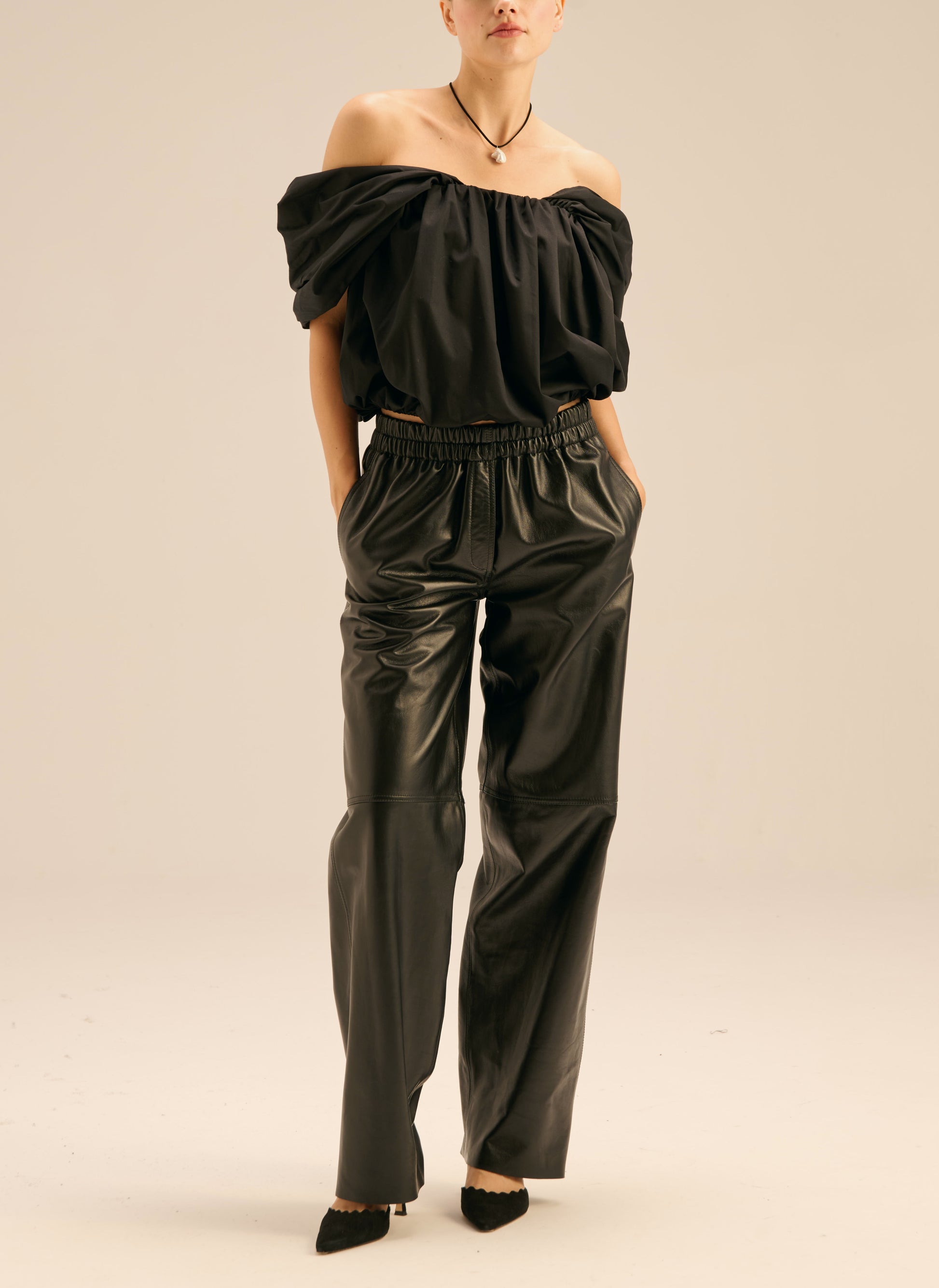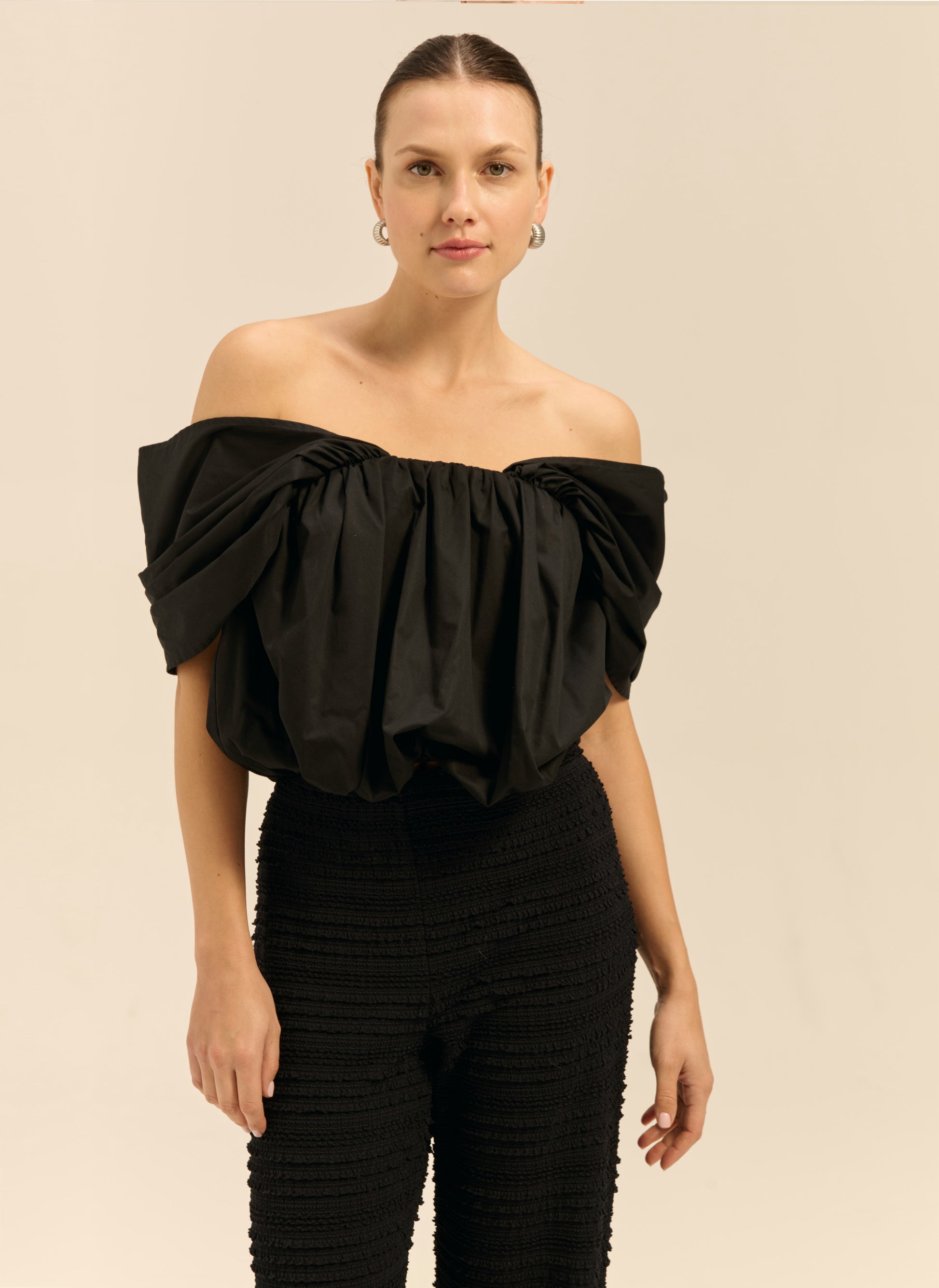 A short bubble-shaped top that exposes the shoulders. Made of deep black cotton. It has falling straps and an elasticated bottom.