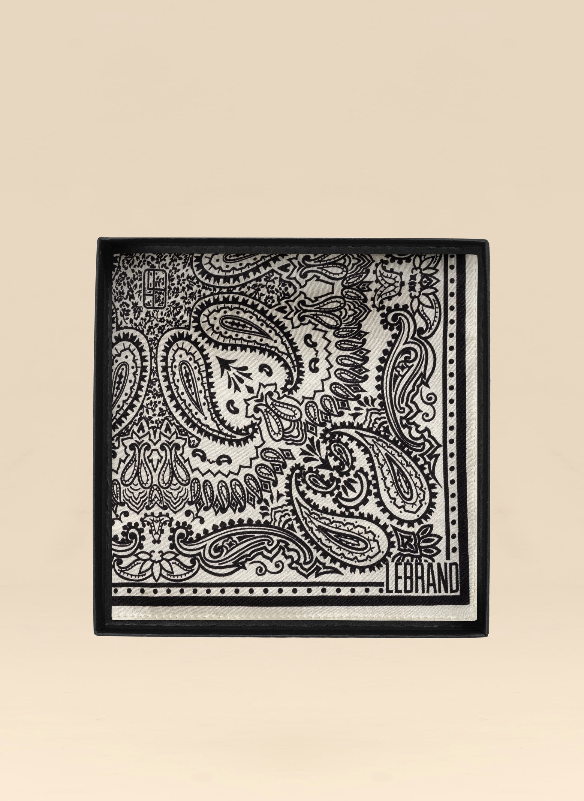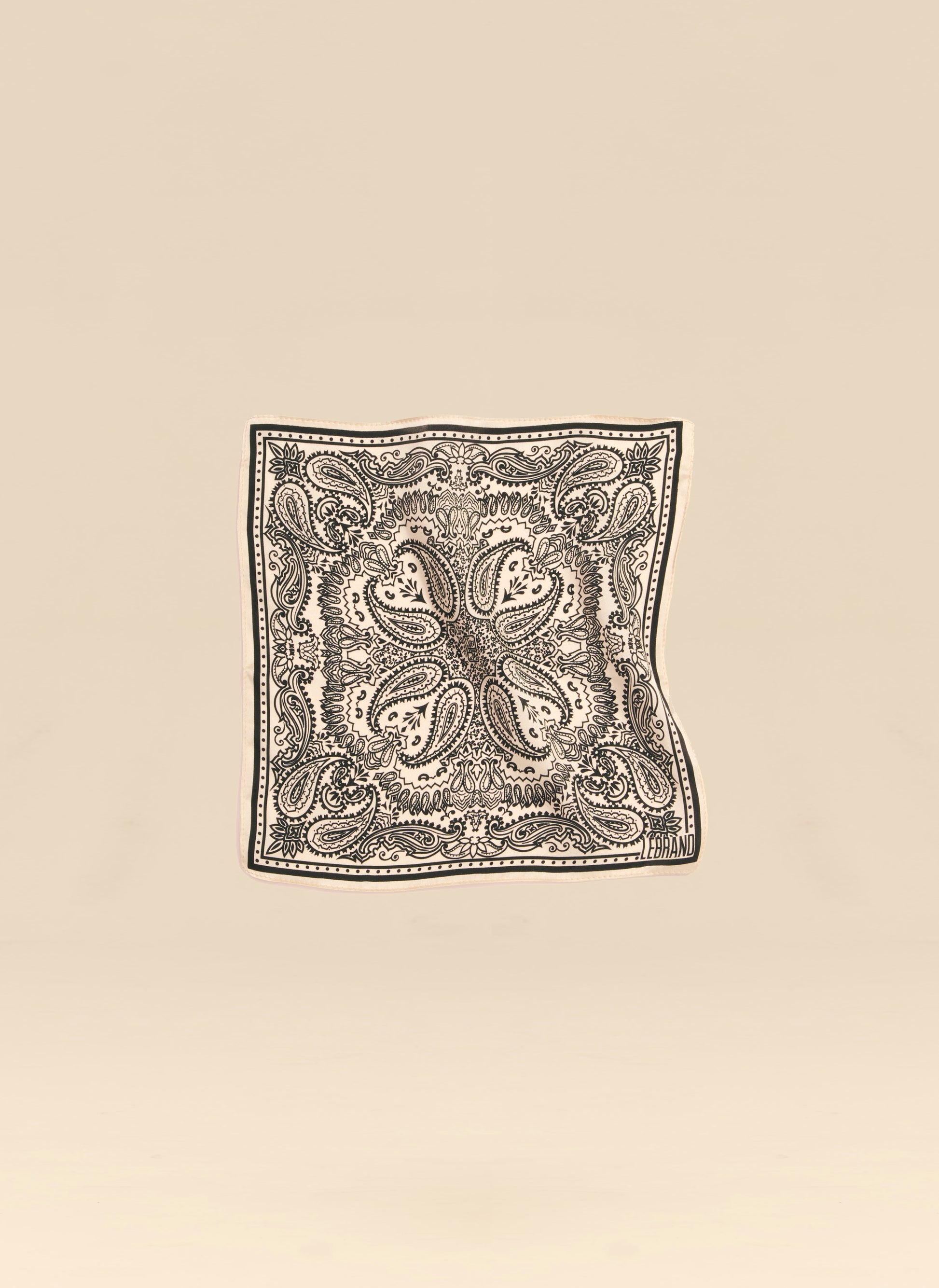 Uniwersalna poszetka jedwabna, ręcznie wykończona z rozpoznawalnym wzorem z bandany.