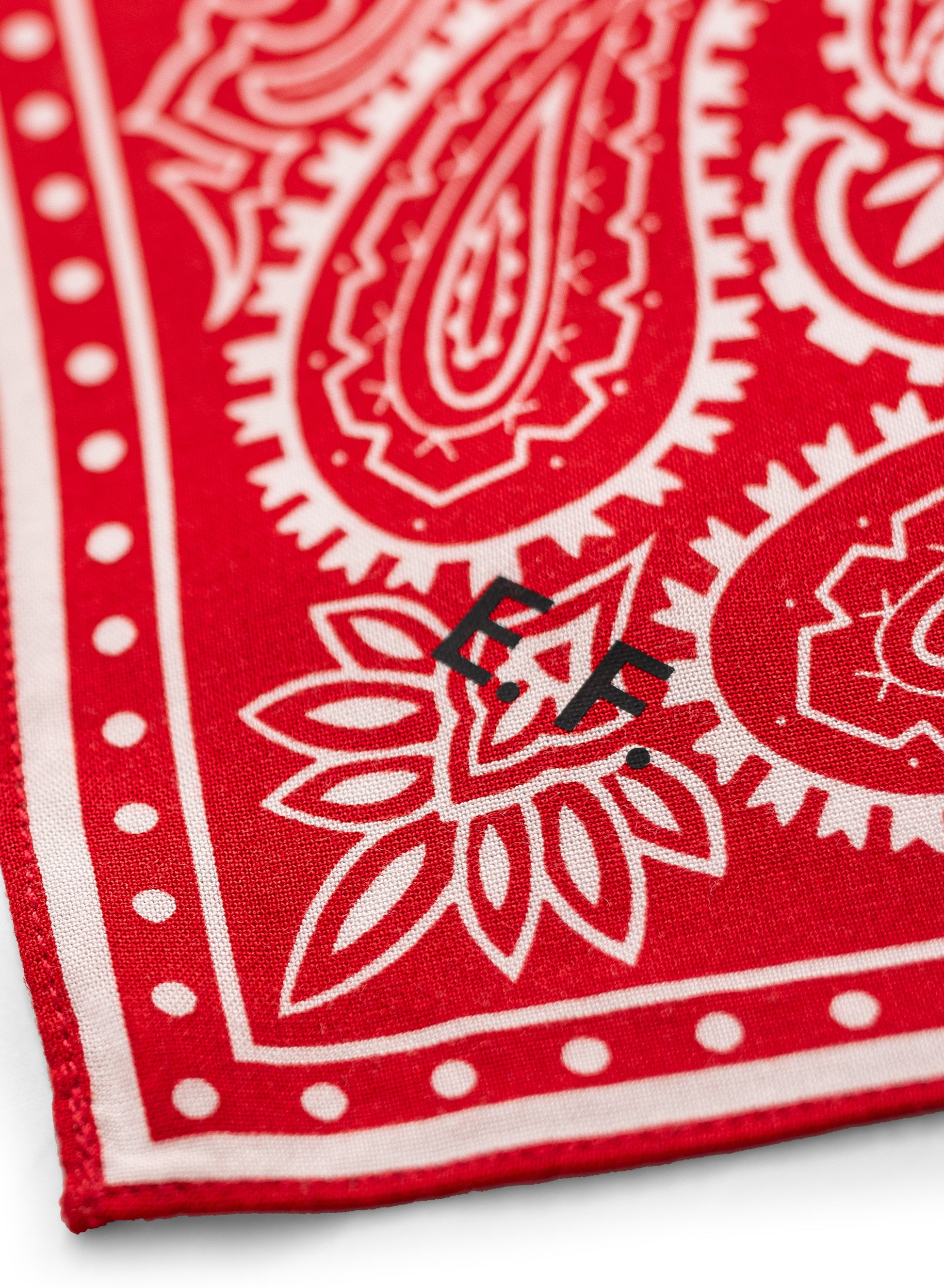 Uniwersalna bandana, ręcznie wykończona, wykonana z miękkiej wiskozy w kolorze głębokiego brązu z nadrukiem w kolorze ecru.