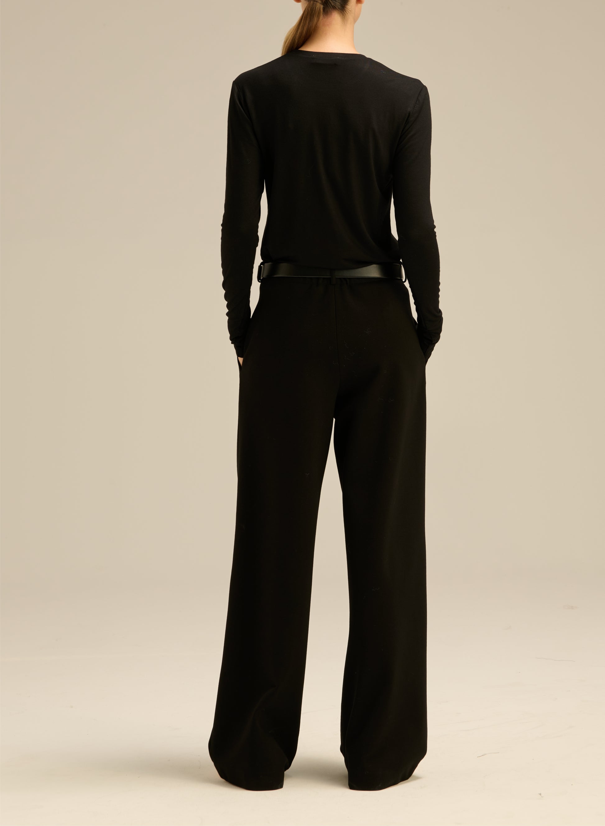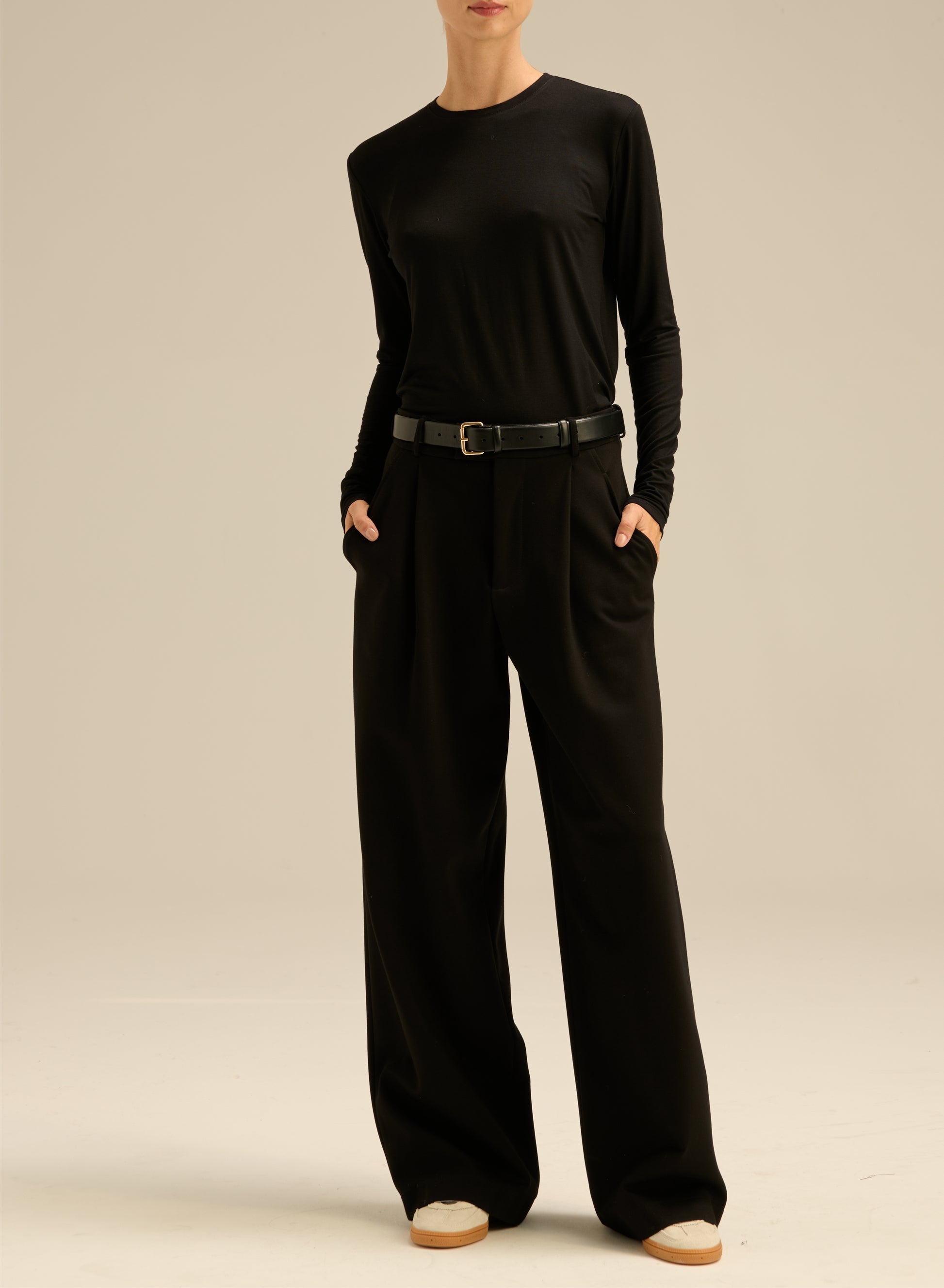 Klasyczny, lekki longsleeve wykonany z miękkiej wiskozy w kolorze czarnym. Posiada dopasowany krój i okrągły dekolt.