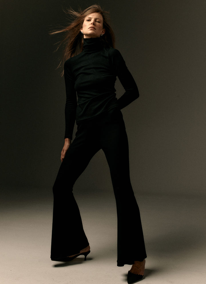 Klasyczny, długi trencz o kroju oversize wykonany ze skóry naturalnej w kolorze czarnym. Posiada dwurzędowe zapięcie na guziki, szerokie rękawy zbierane w nadgarstkach, pagony na ramionach oraz długi pasek wiązany w talii. Tył płaszcza dekorowany plisą. Produkt dostępny na zamówienie, czas realizacji wynosi około 7 dni roboczych