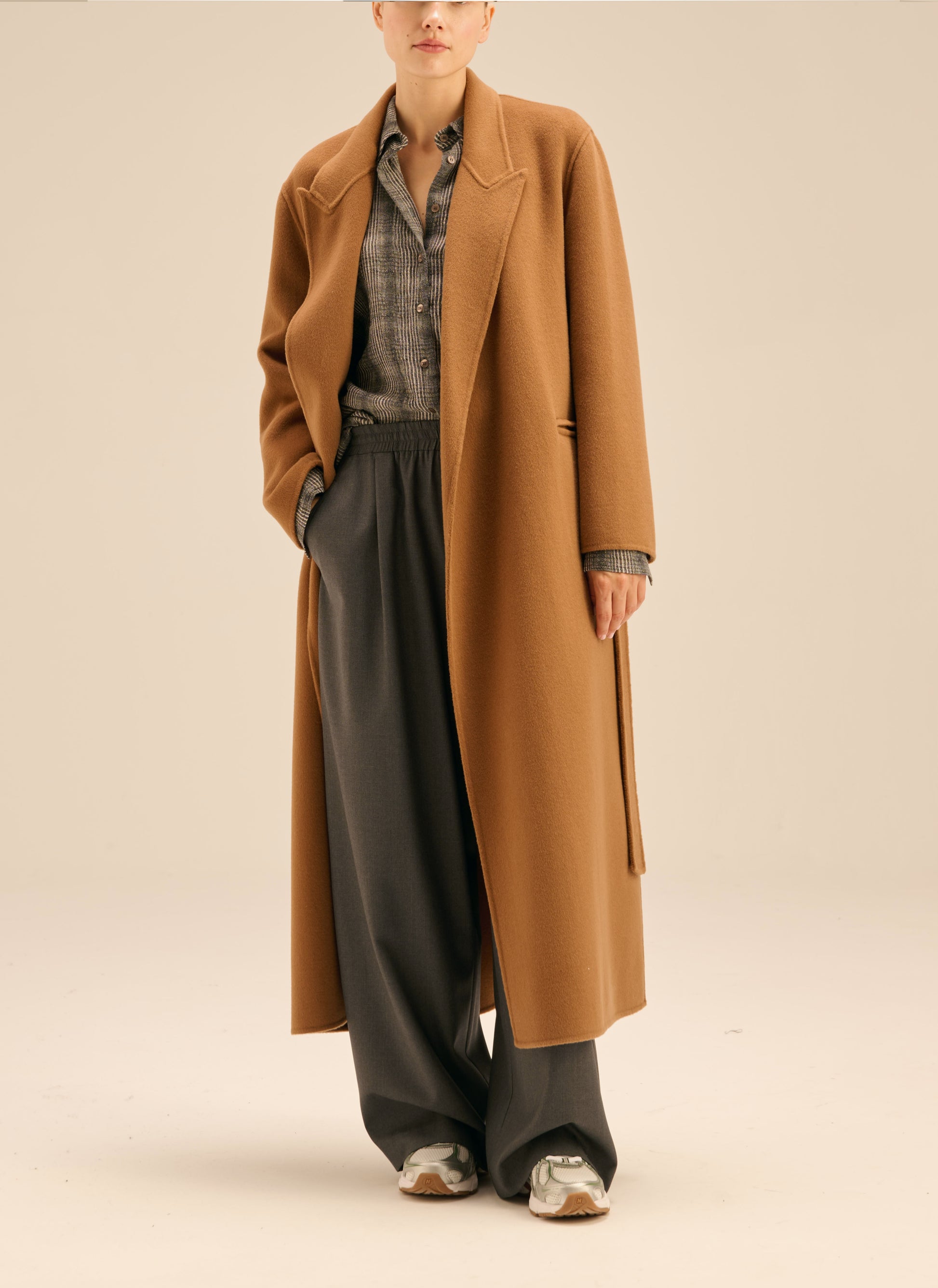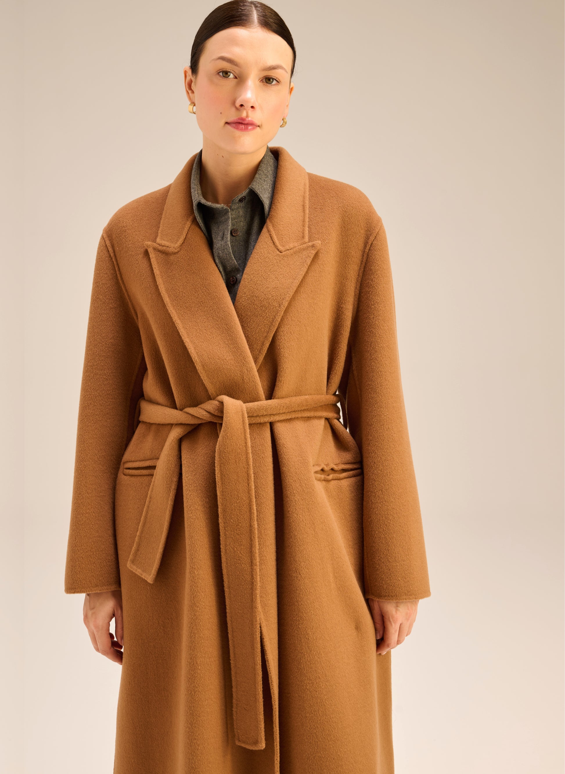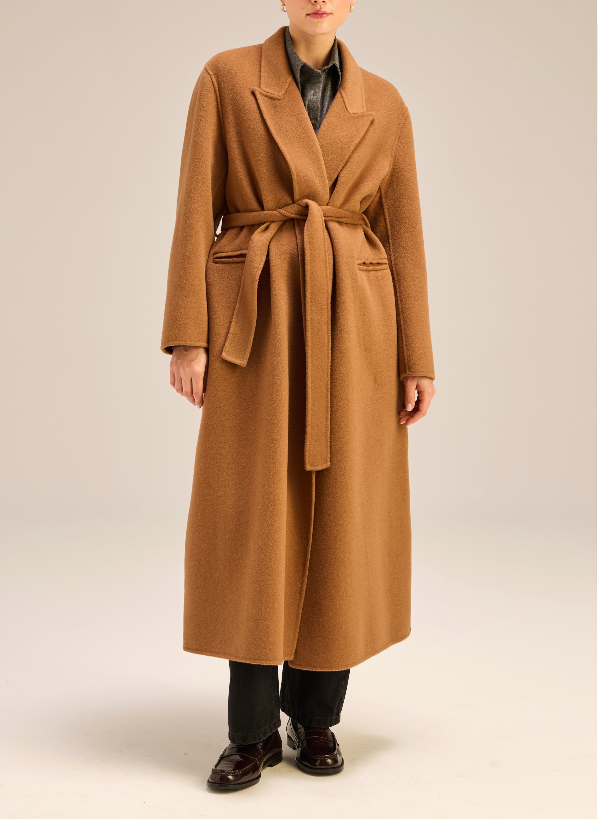 Płaszcz o szlafrokowym kroju i długości maxi w kolorze kamelowym. Model bez podszewki/ double face.